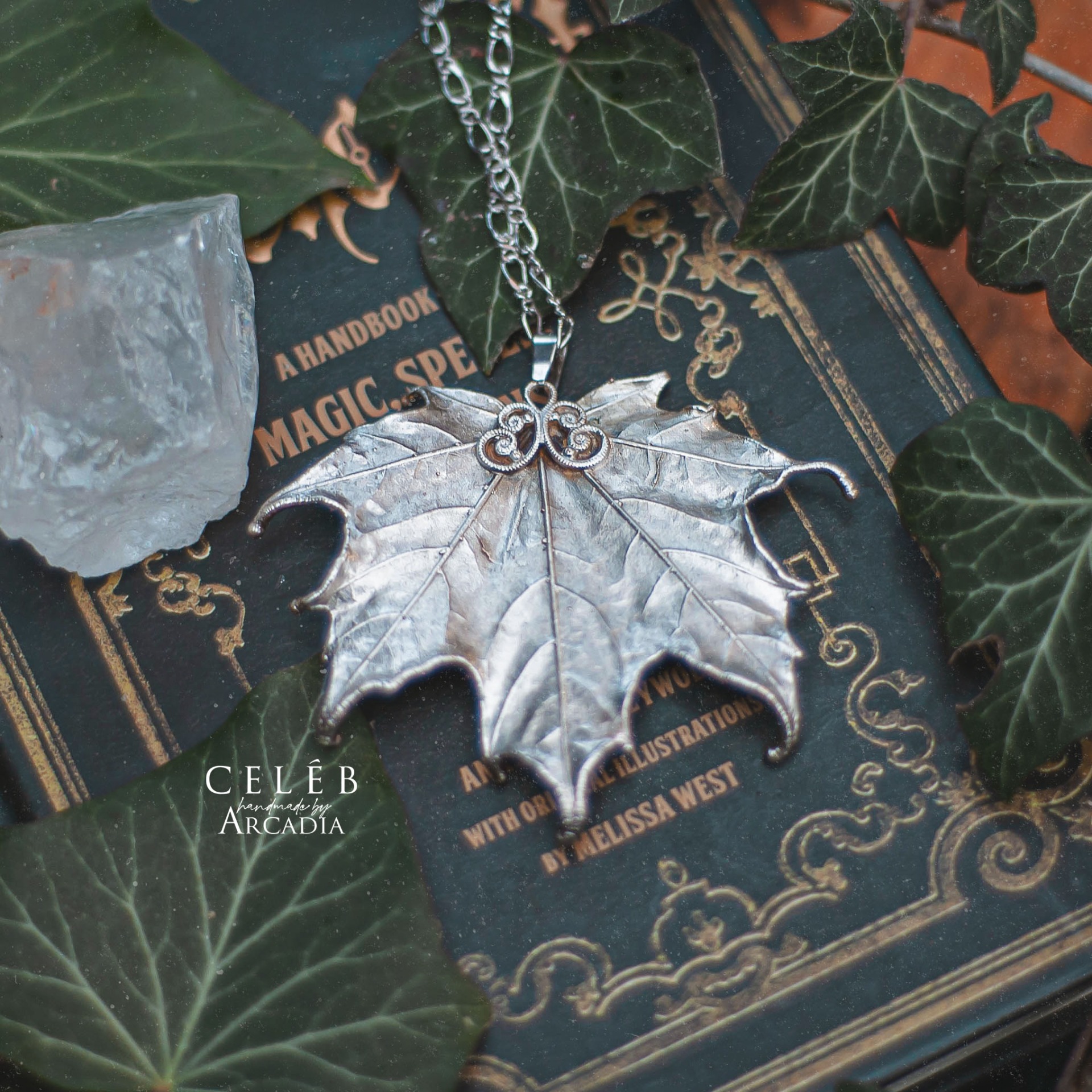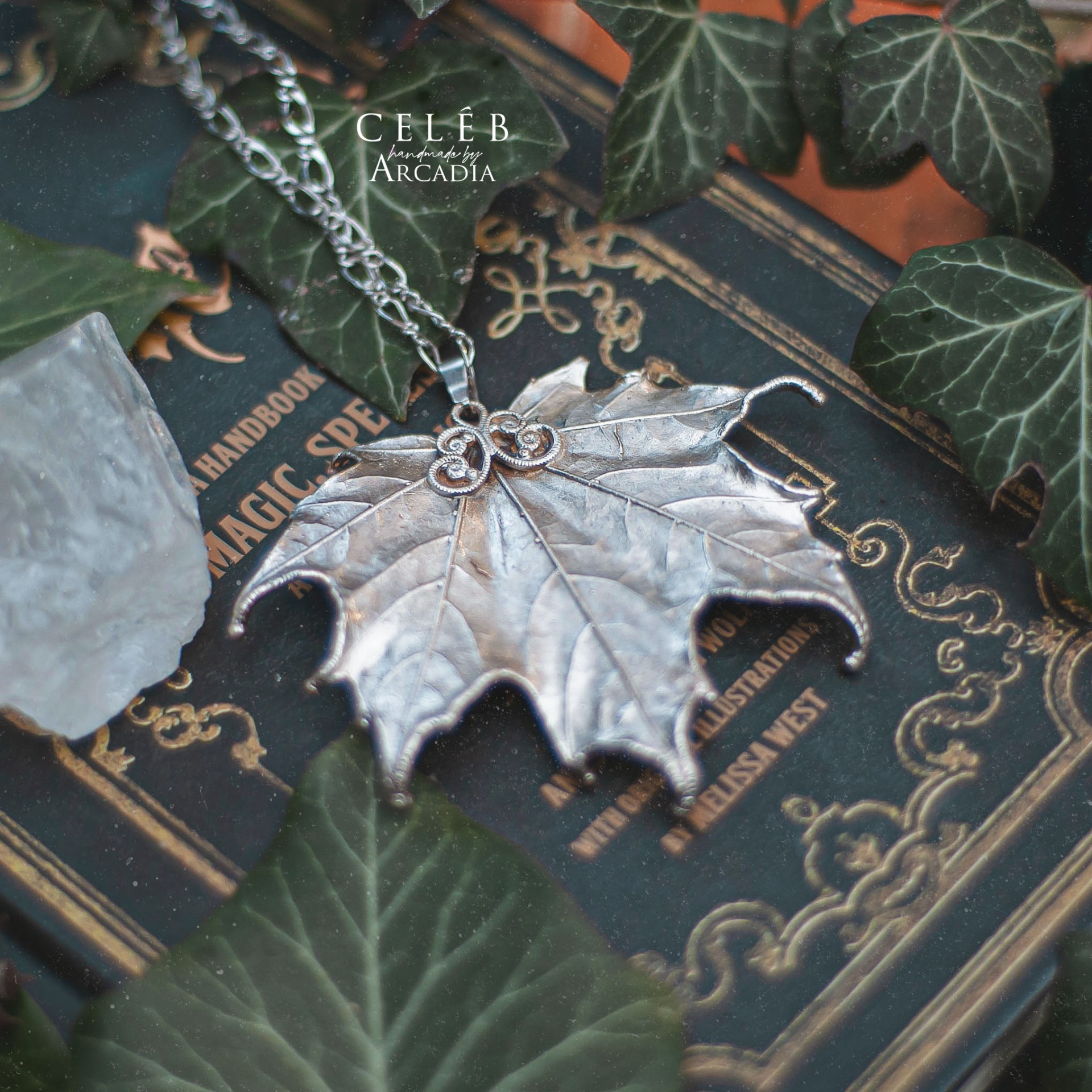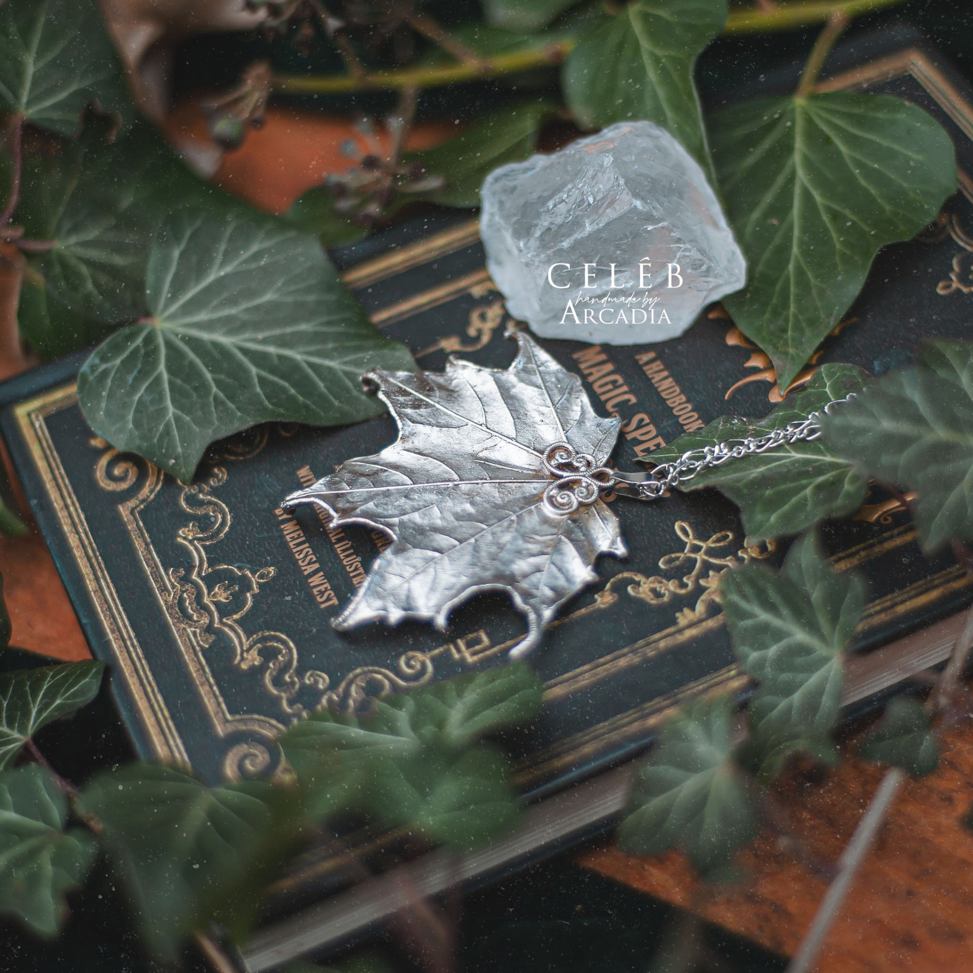Náhrdelník se skutečným lístkem javoru v ledově stříbrných odstínech na zdobném bižuterním řetízku. Vyrobeno rukama a srdcem v alchymistické dílně na severu Čech.