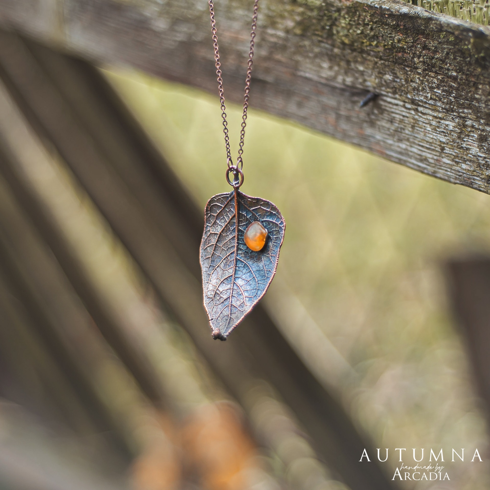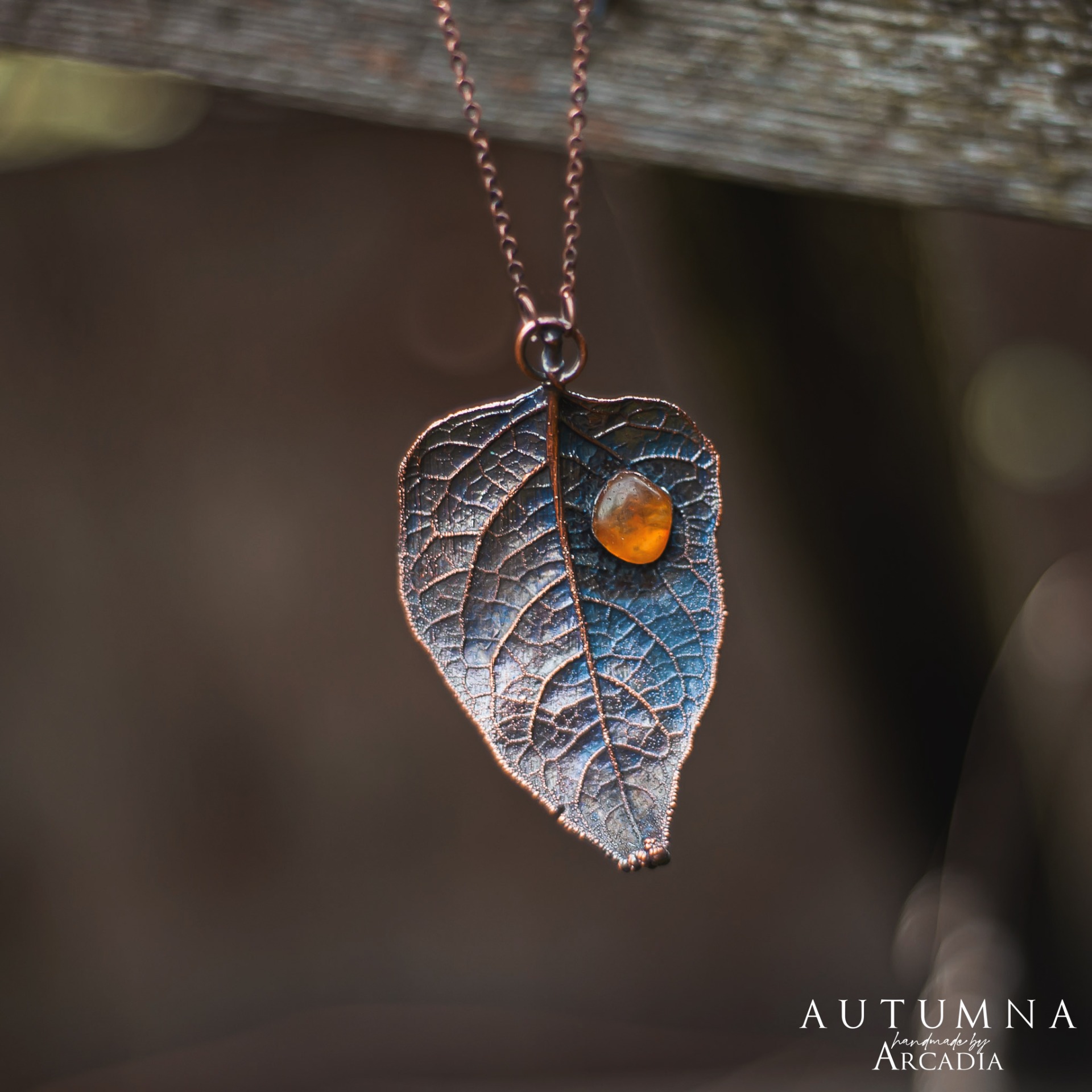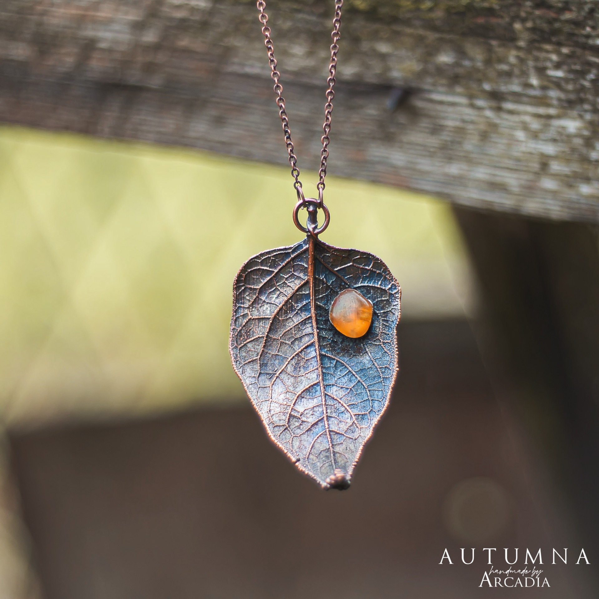 Náhrdelník s přívěskem ze skutečného pokoveného lístku mochyně v rustikální patině, ozdobený baltským jantarem. Jemný staroměděný řetízek. Vyrobeno rukama a srdcem v alchymistické dílně na severu Čech.
