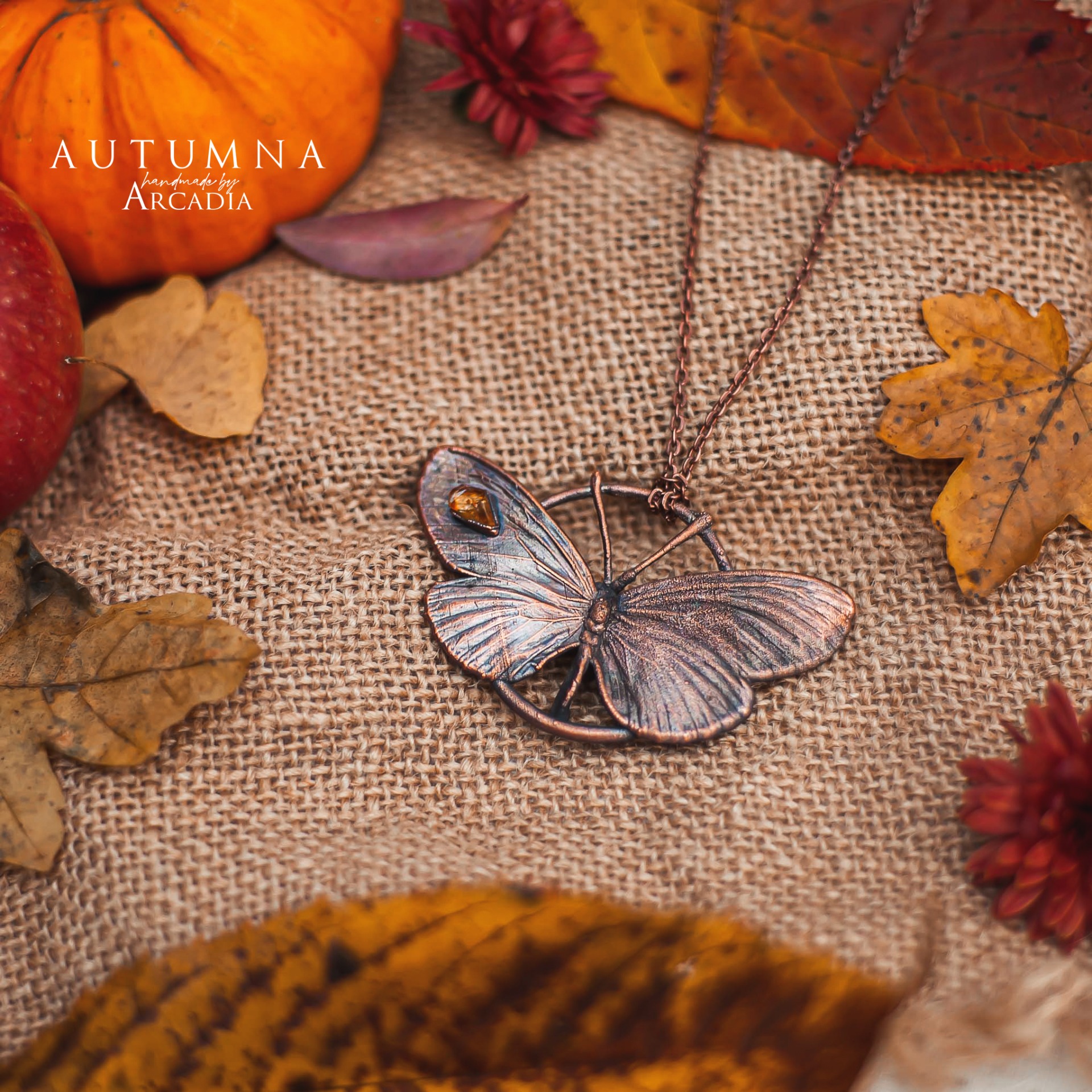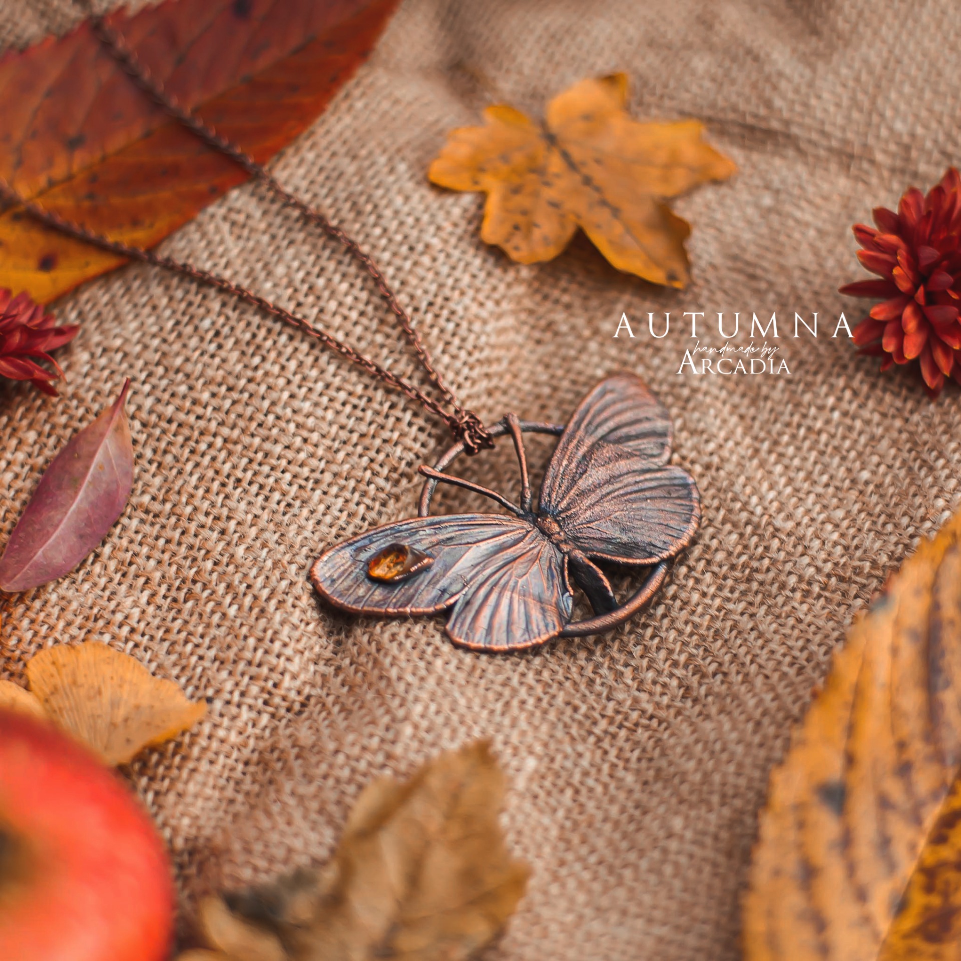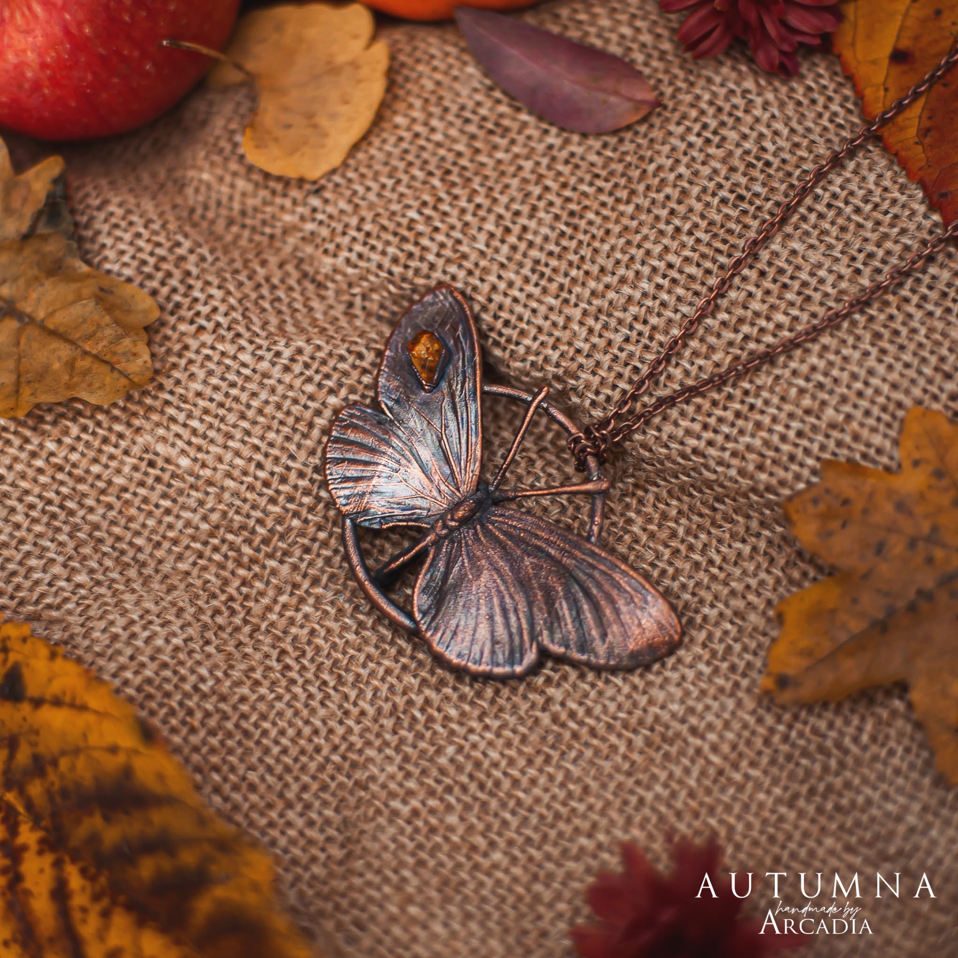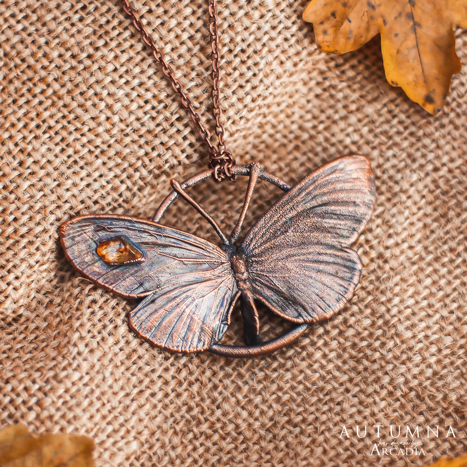 Náhrdelník se skutečným pokoveným motýlkem s baltským jantarem. Jemný staroměděný řetízek. Vyrobeno rukama a srdcem v alchymistické dílně na severu Čech.