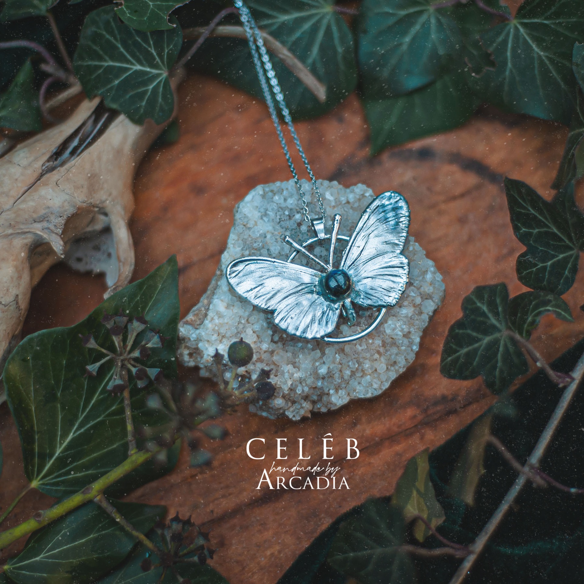 Náhrdelník se skutečným pokoveným motálkem a tmavomodrým kabošonem labradoritu. Jemný řetízek z nerezové oceli. Vyrobeno rukama a srdcem v alchymistické dílně na severu Čech.