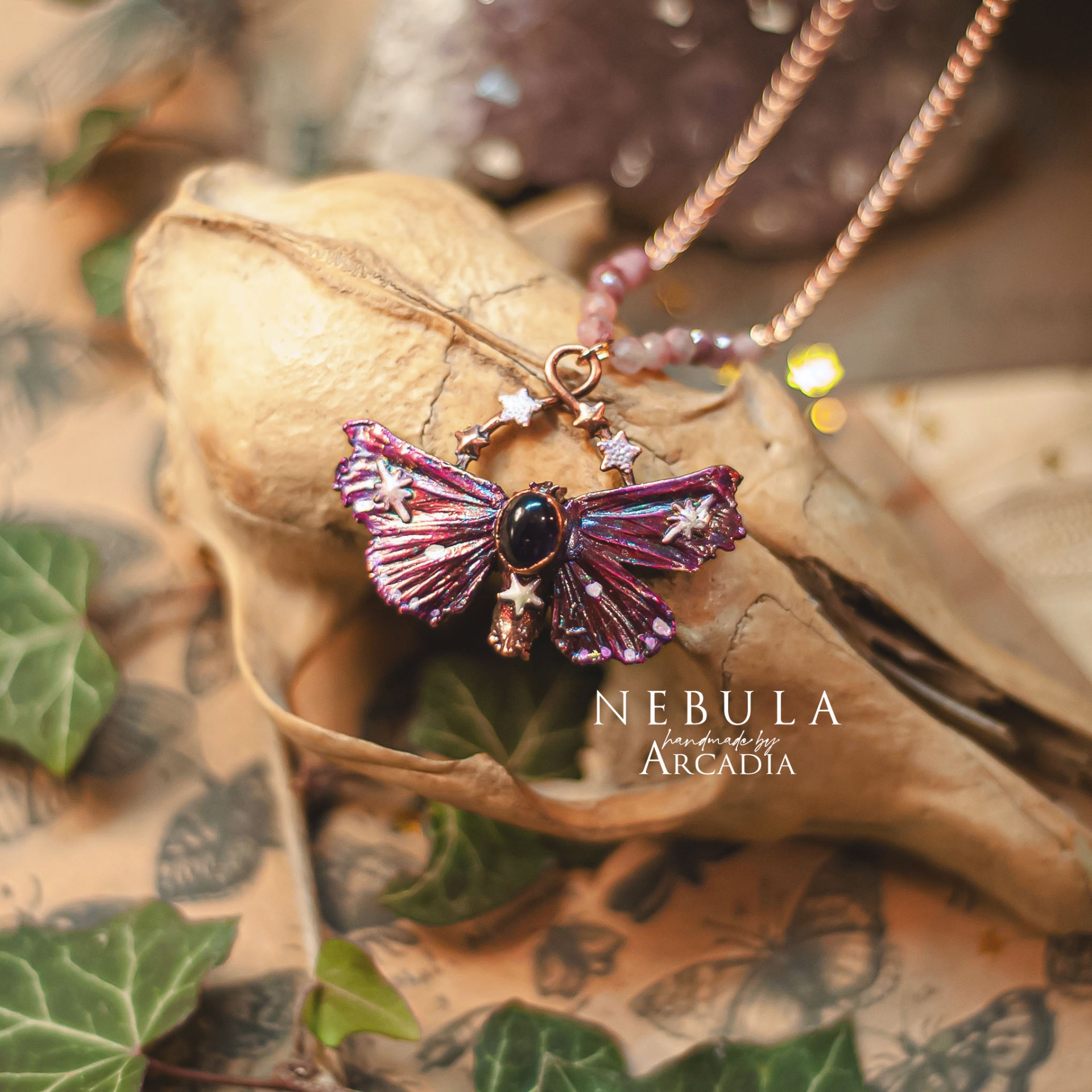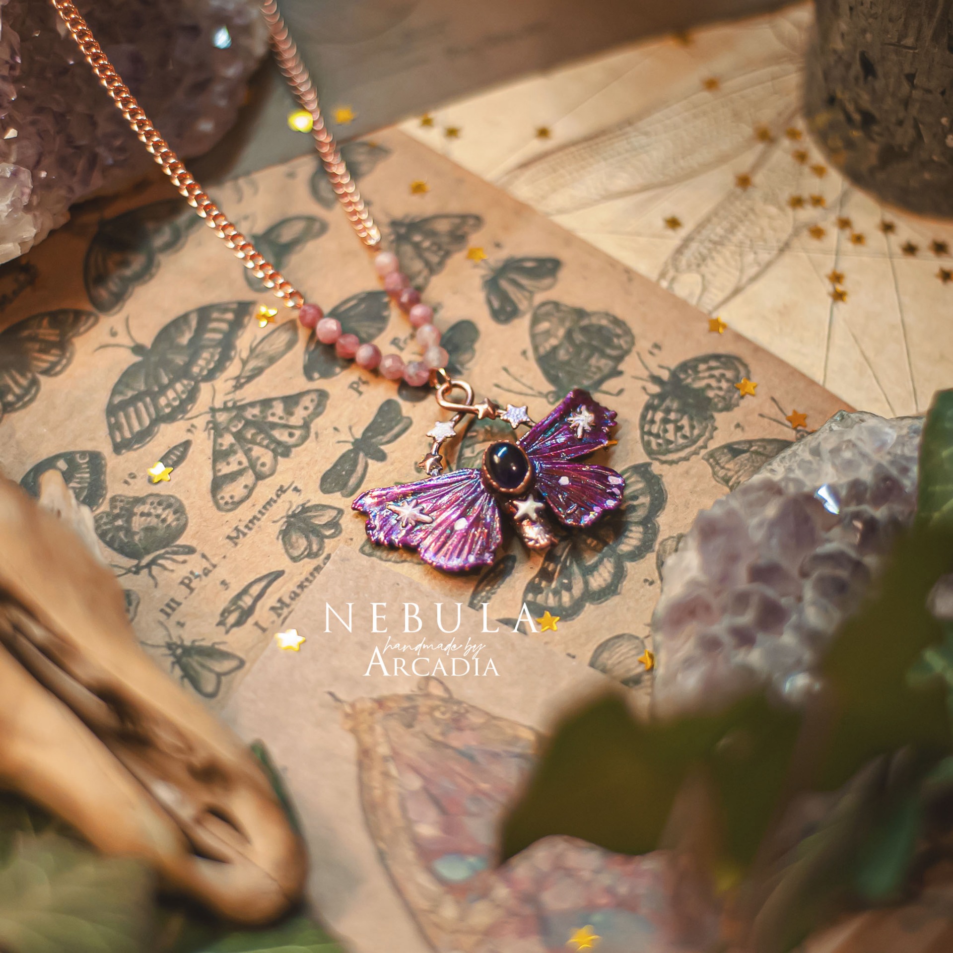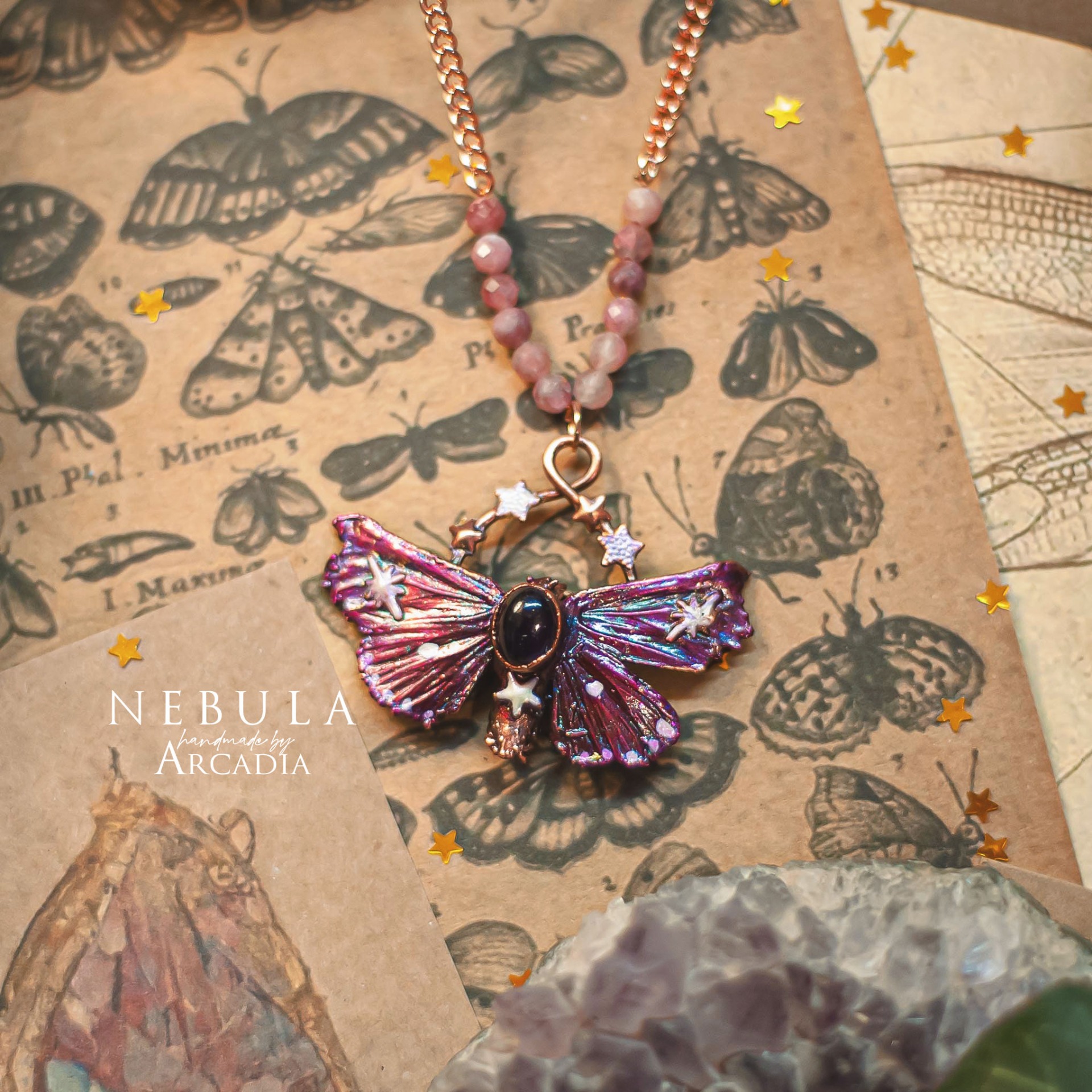 Náhrdelník se skutečnou pokovenou můrkou s třpytivými křidélky v tónech růžové až fialkové, zdobenou kabošonem fialového ametystu. Rosegold náhrdelník s perličkami z broušeného růžového turmalínu. Vyrobeno rukama a srdcem v alchymistické dílně na severu Čech.