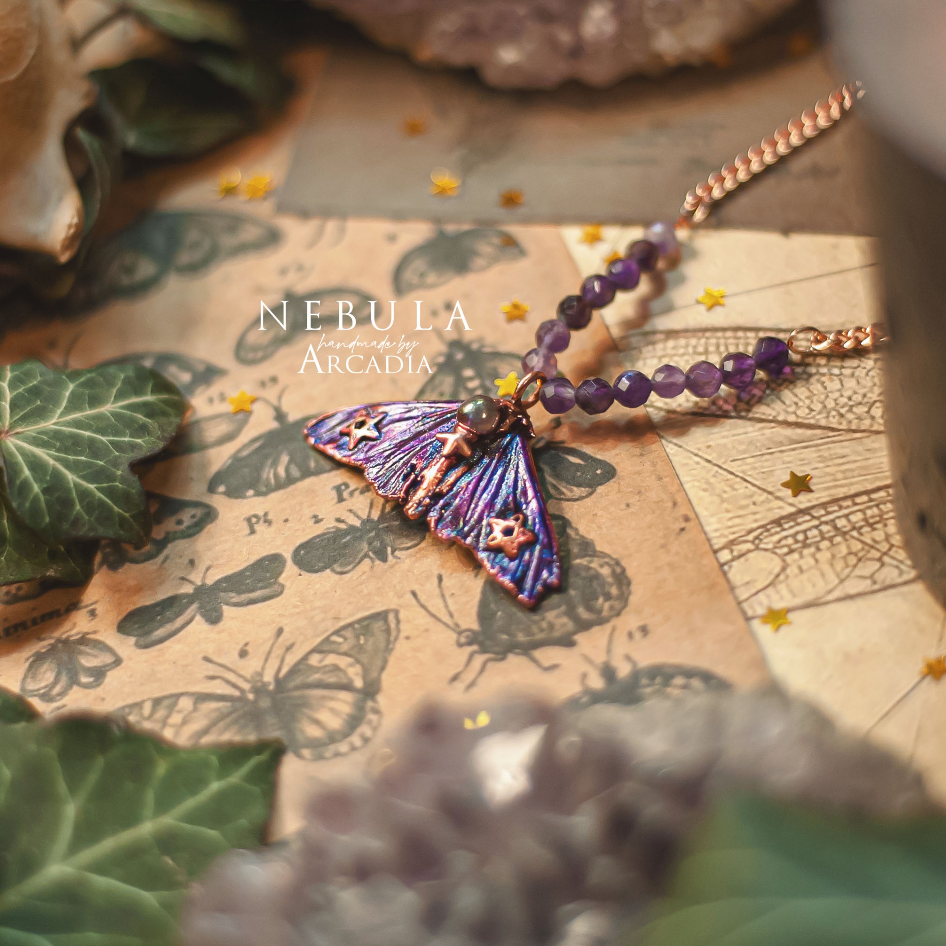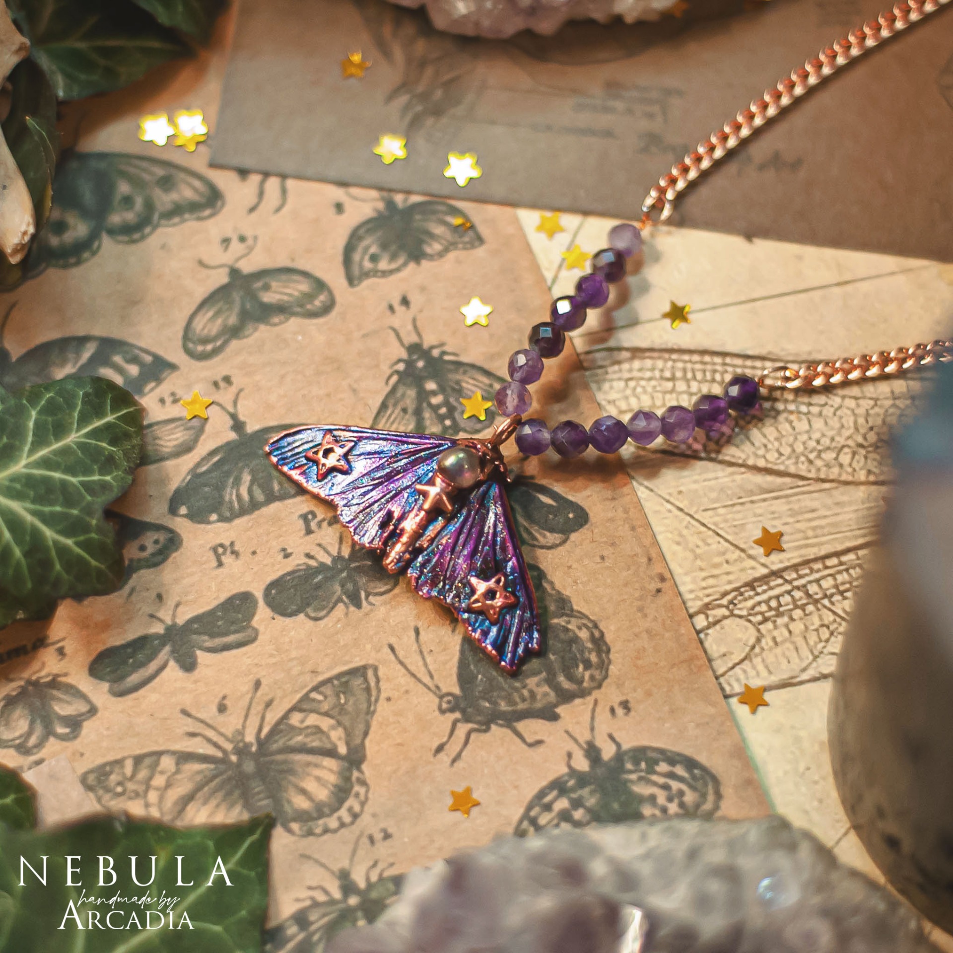 Náhrdelník se skutečnou pokovenou můrkou s třpytivými křidélky v tónech fialové, zdobenou tromlovaným aura křišťálkem. Rosegold náhrdelník s perličkami z broušeného ametystu. Vyrobeno rukama a srdcem v alchymistické dílně na severu Čech.