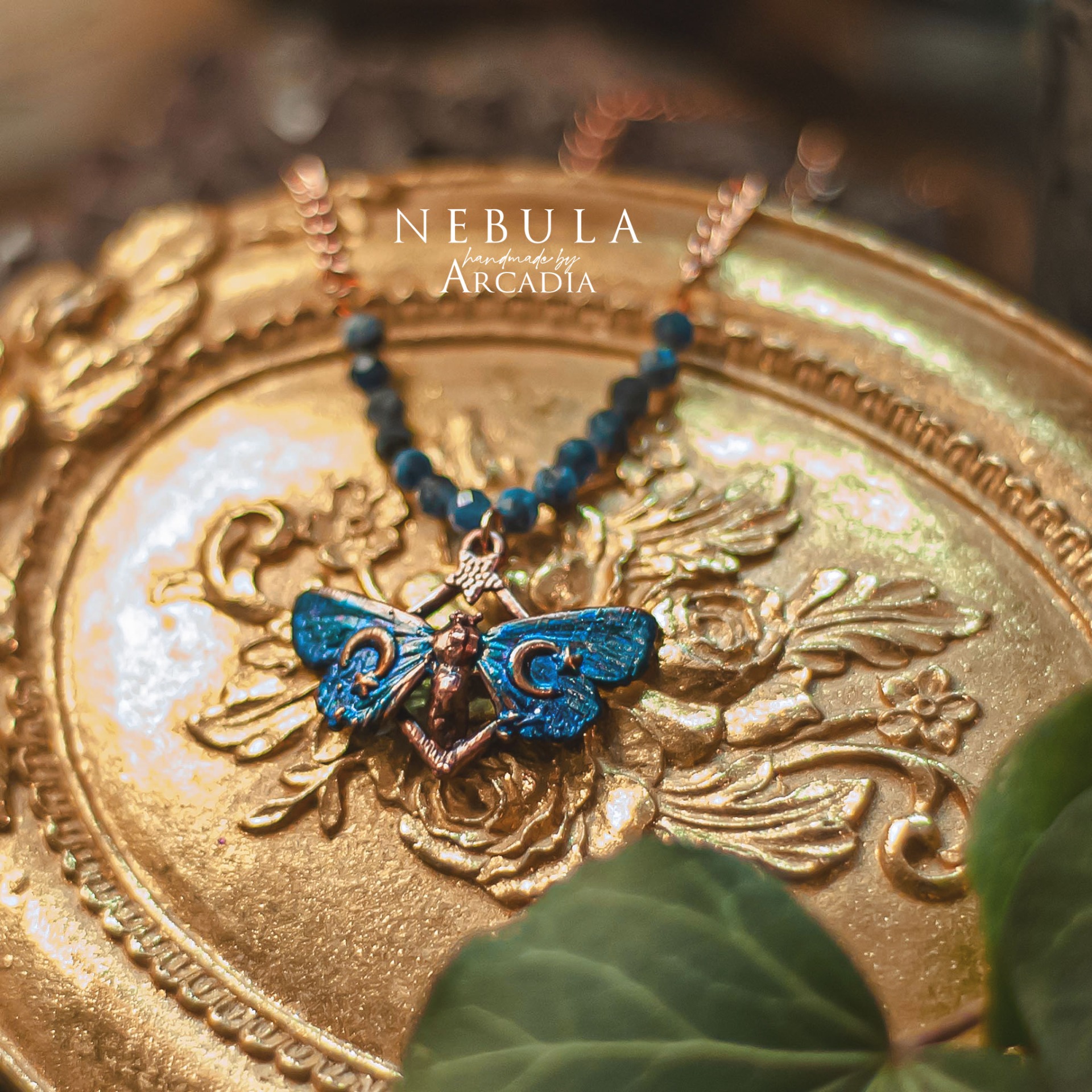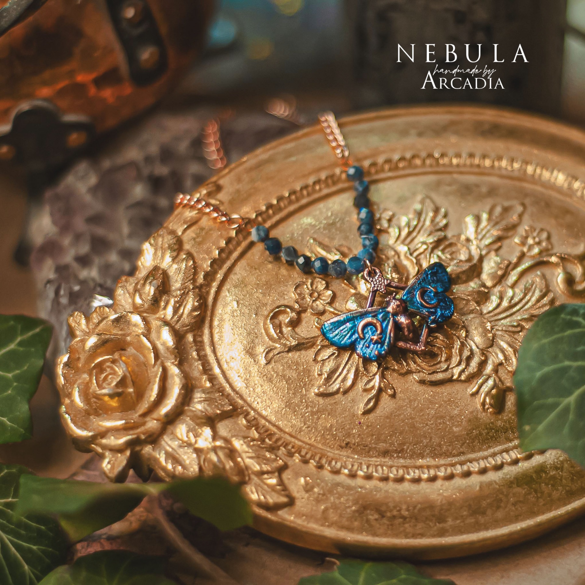 Náhrdelník se skutečnou pokovenou můrkou s třpytivými křidélky v tónech půlnoční modré. Rosegold náhrdelník s perličkami z broušeného sodalitu. Vyrobeno rukama a srdcem v alchymistické dílně na severu Čech.