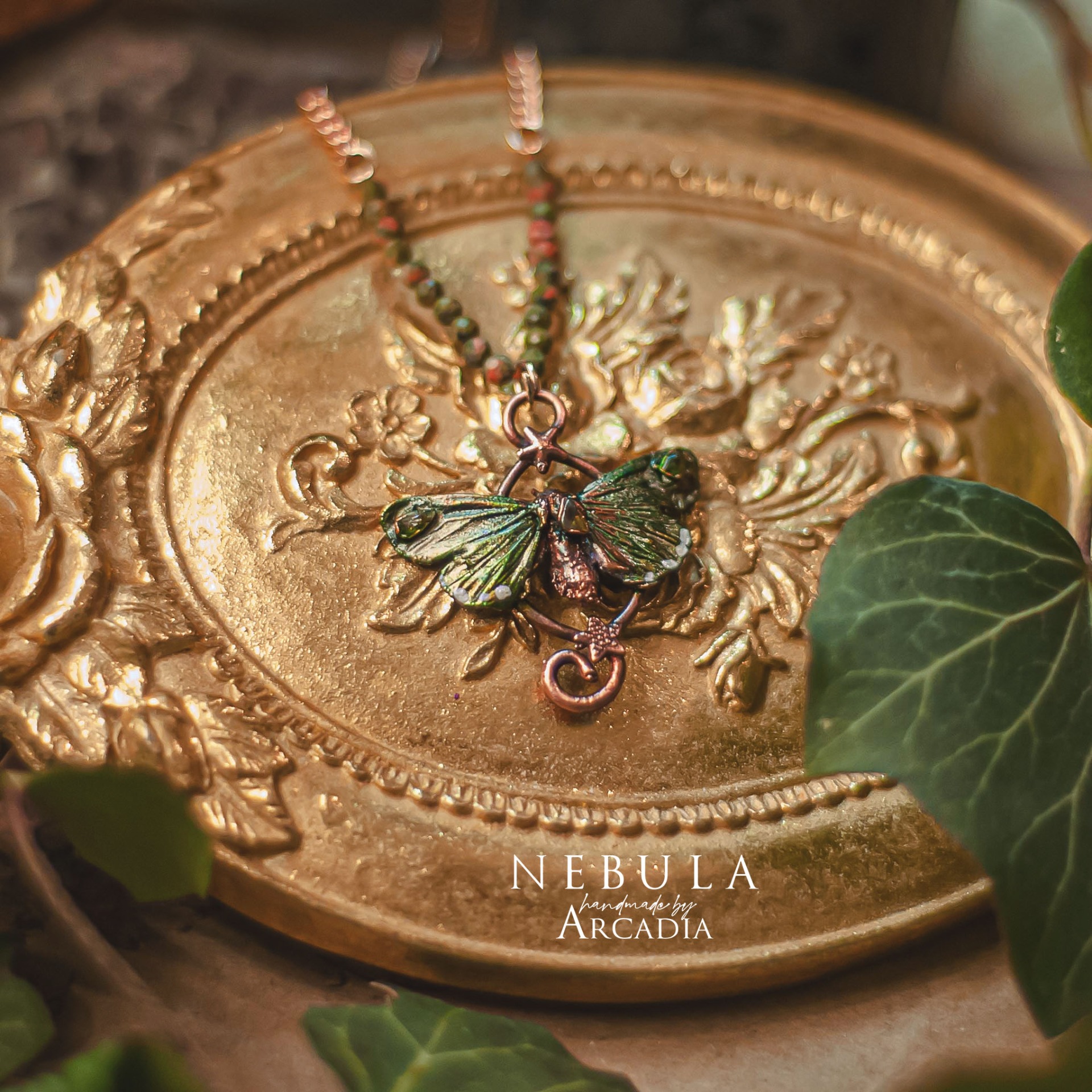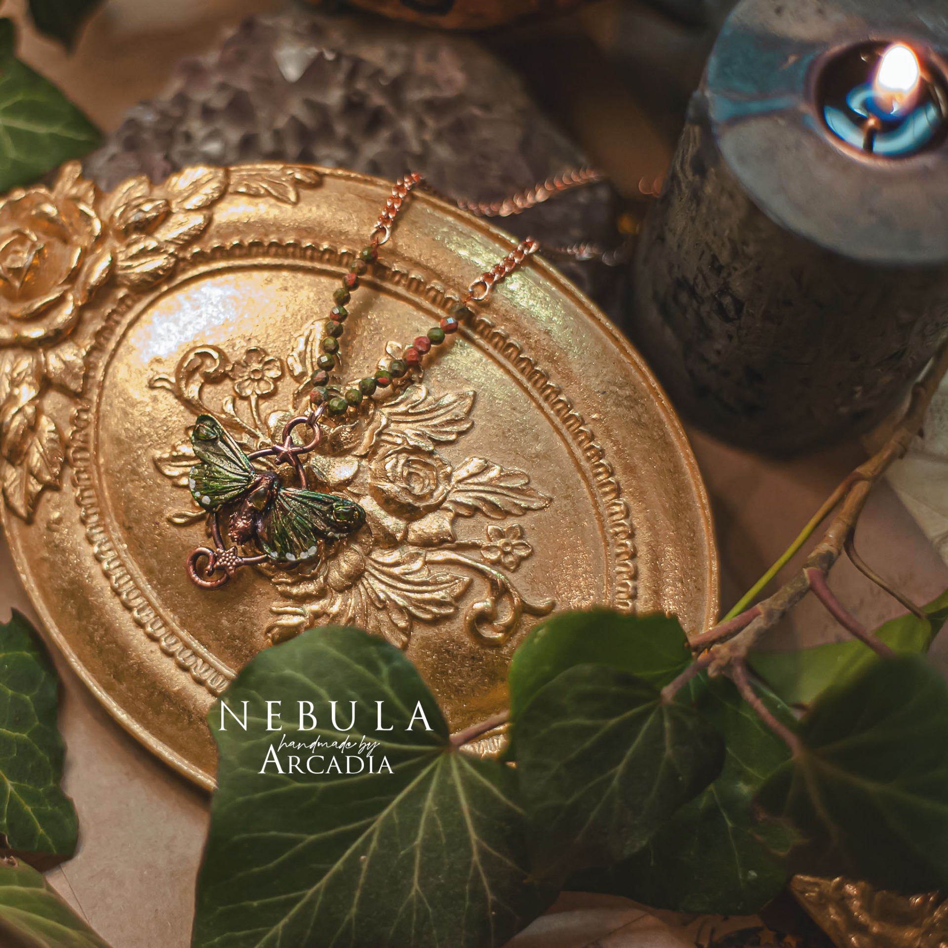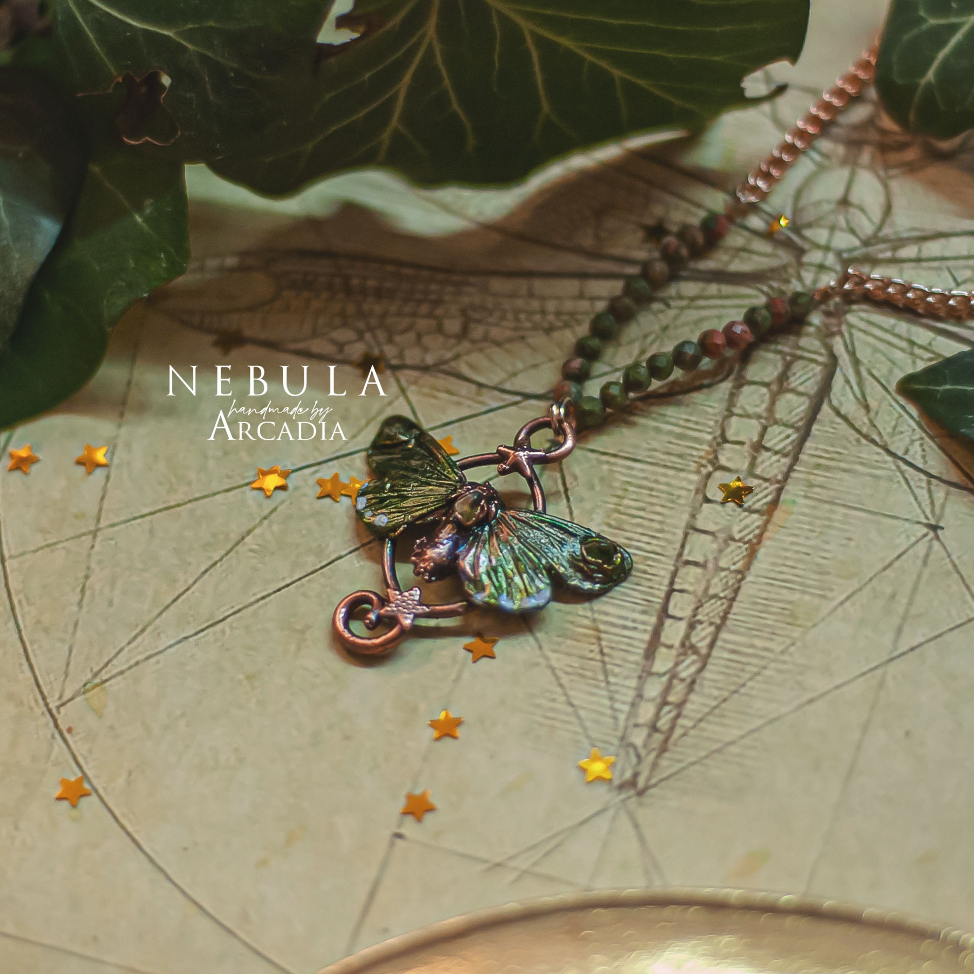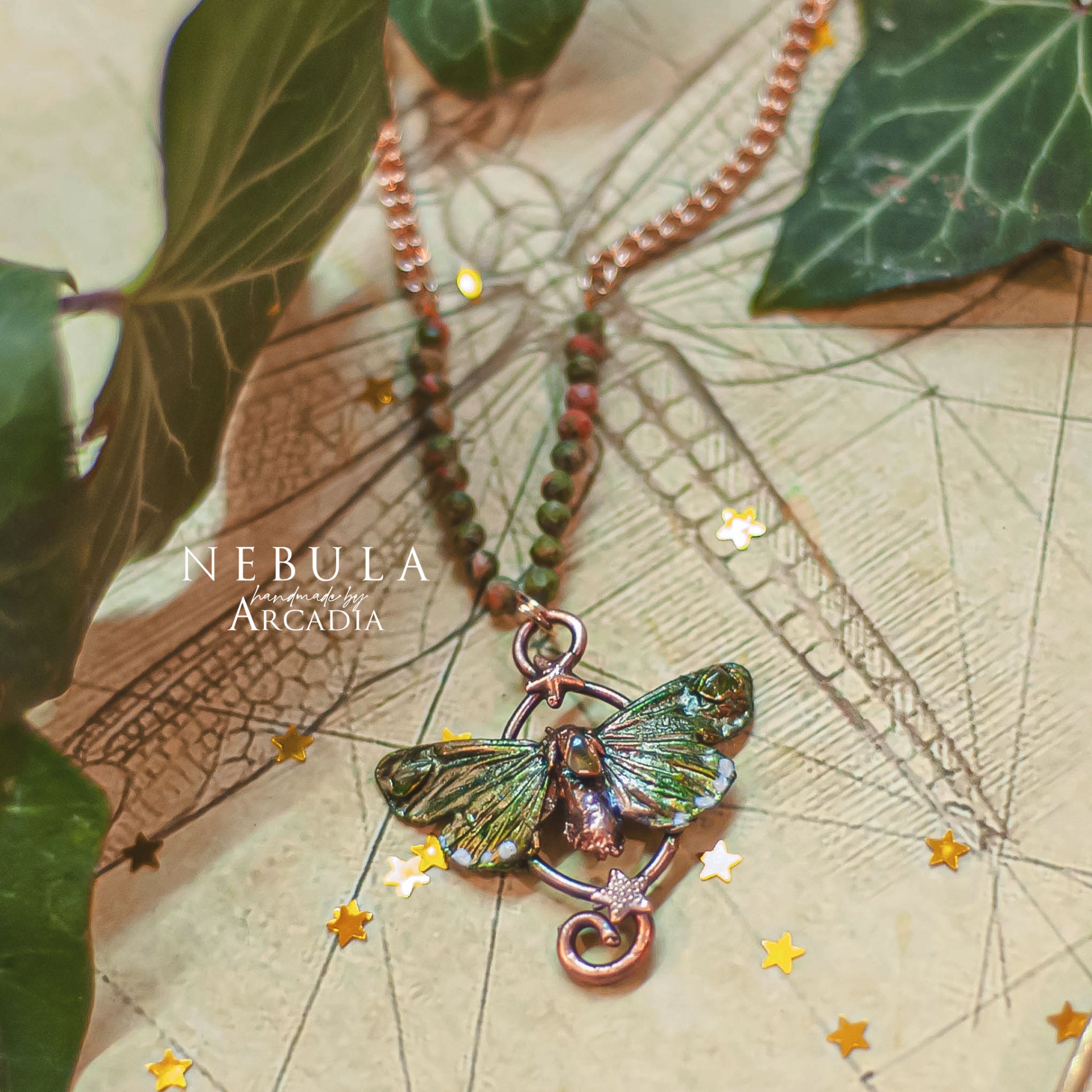 Náhrdelník se skutečnou pokovenou můrkou s třpytivými křidélky v tónech lesní zelené, zdobené dvojicí surových olivínů. Rosegold náhrdelník s perličkami z broušeného unakitu. Vyrobeno rukama a srdcem v alchymistické dílně na severu Čech.