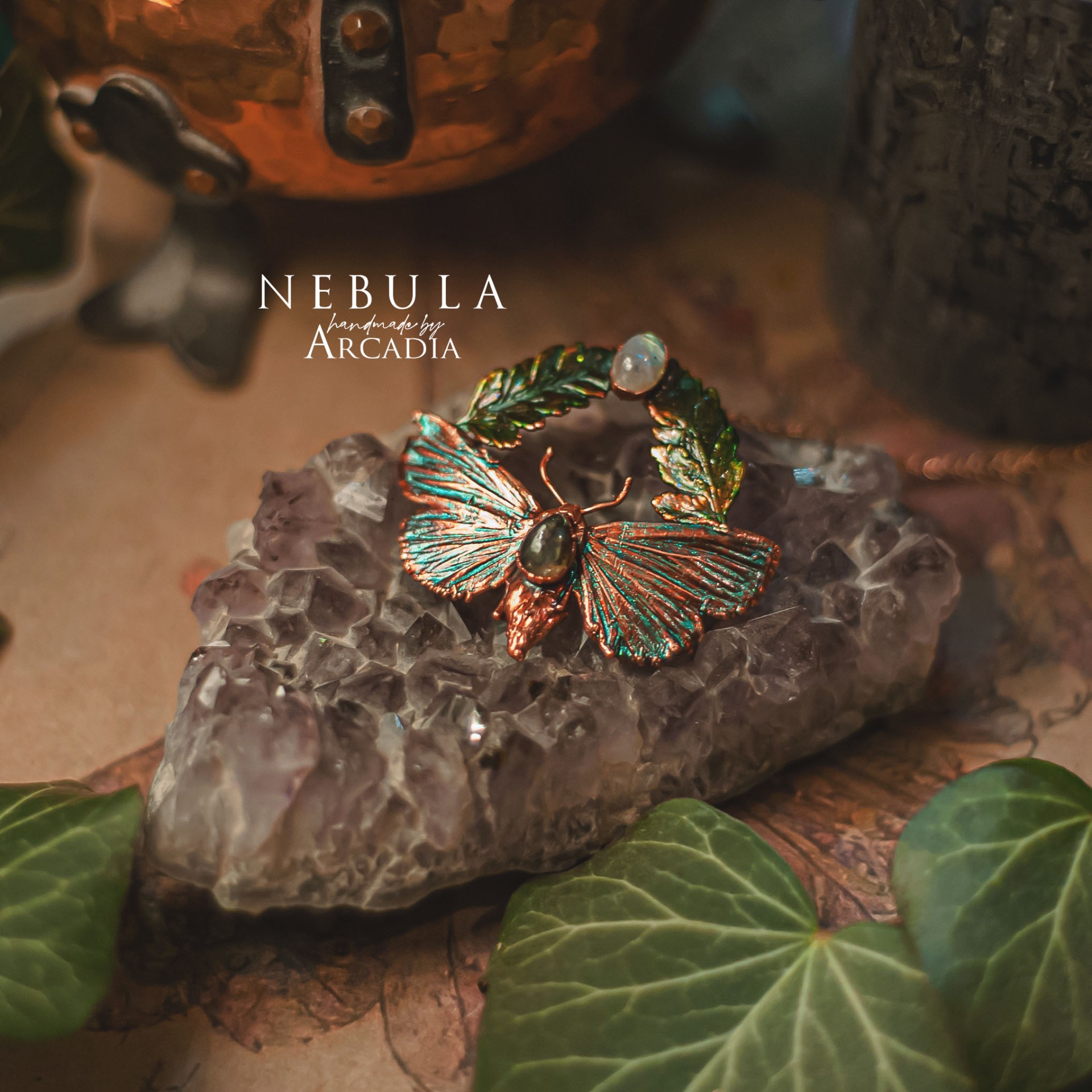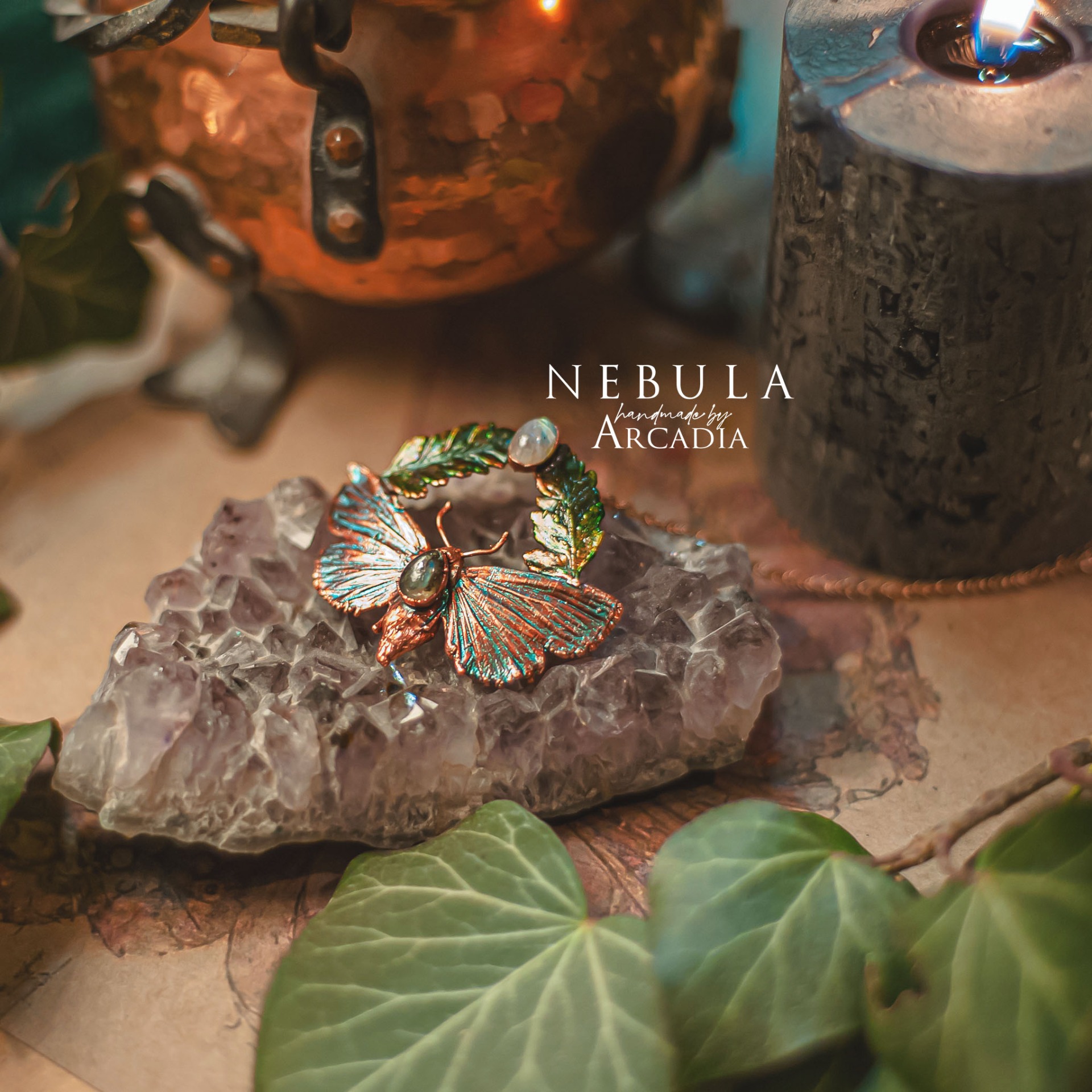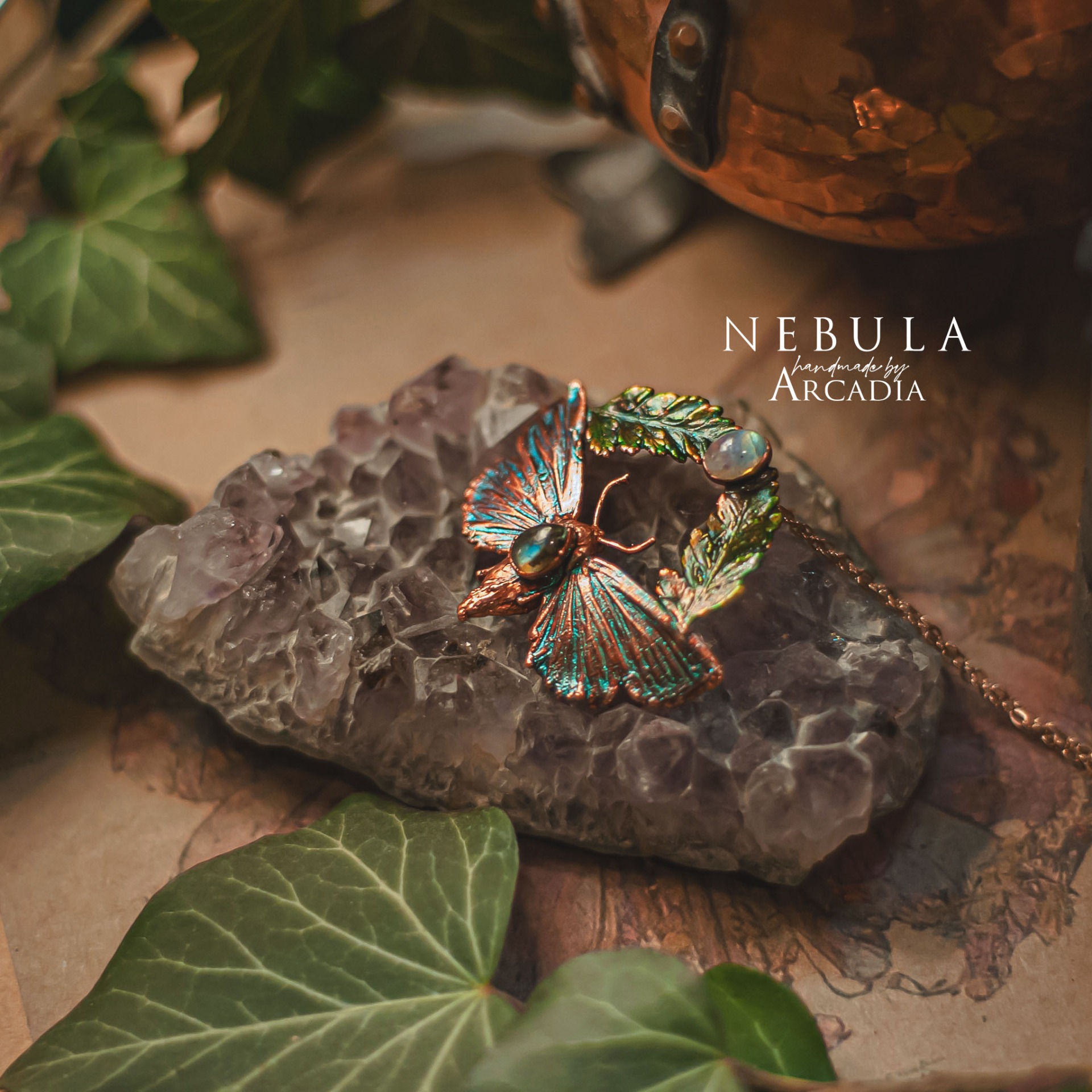Náhrdelník se skutečnou pokovenou můrkou s třpytivými křidélky v tónech modrozelené, zdobenou kabošony labradoritu a měsíčního kamene a dvojicí kapradinových lístků. Jemný řetízek z nerezové oceli s rosegold pokovením. Vyrobeno rukama a srdcem v alchymistické dílně na severu Čech.