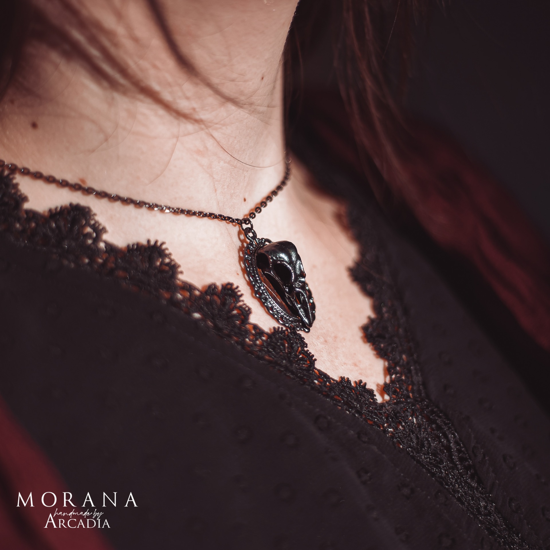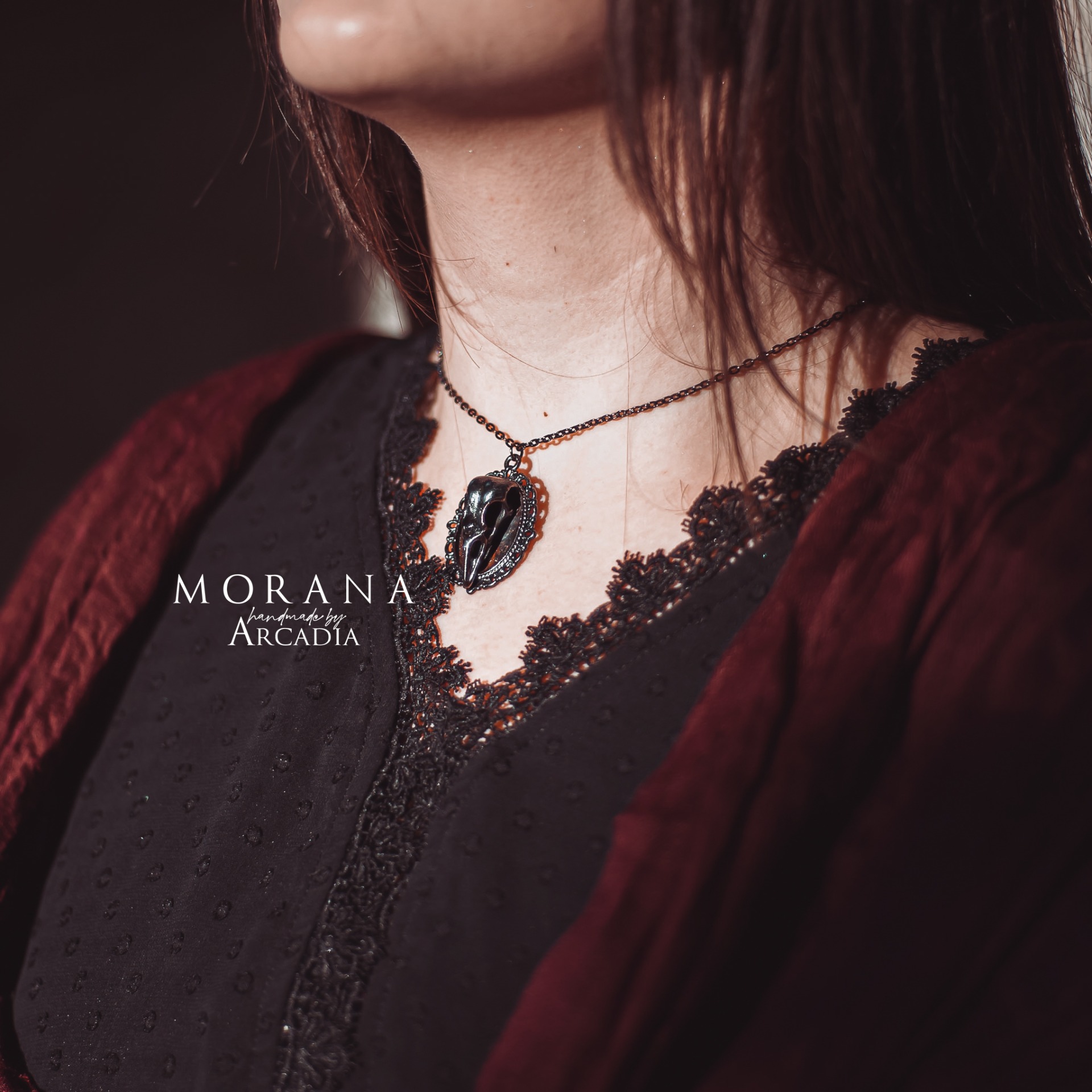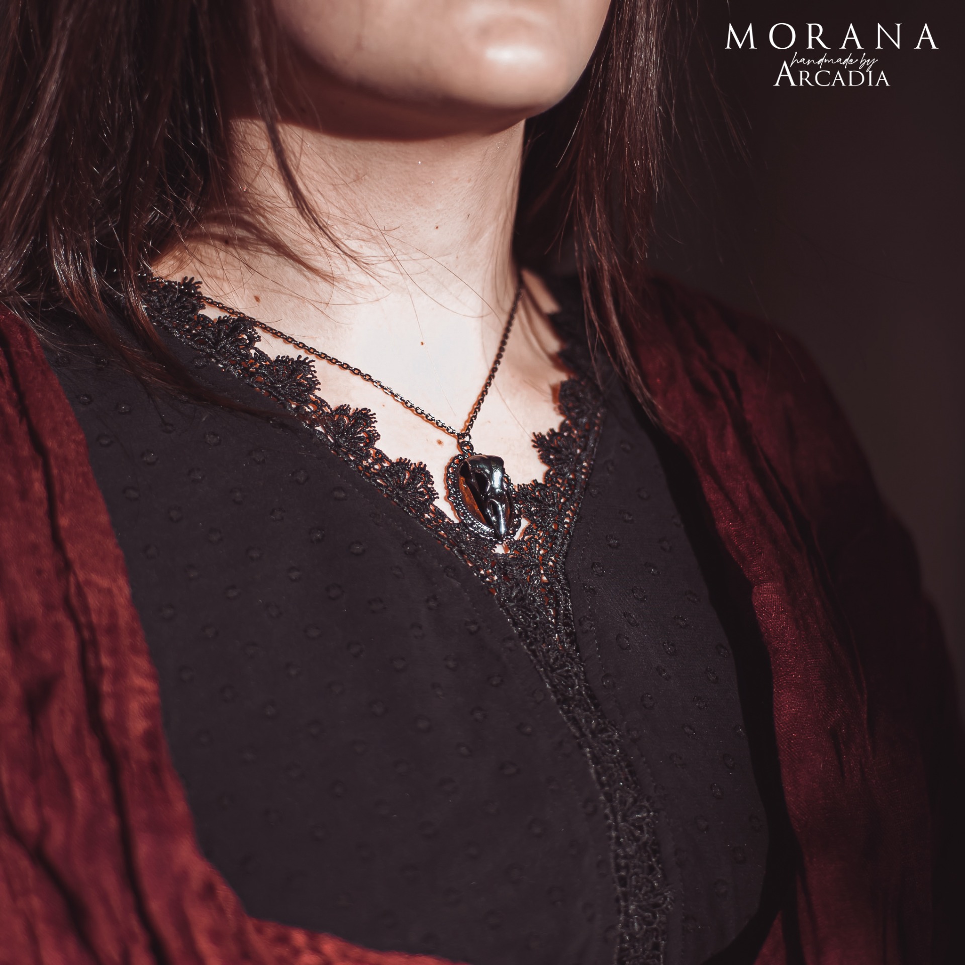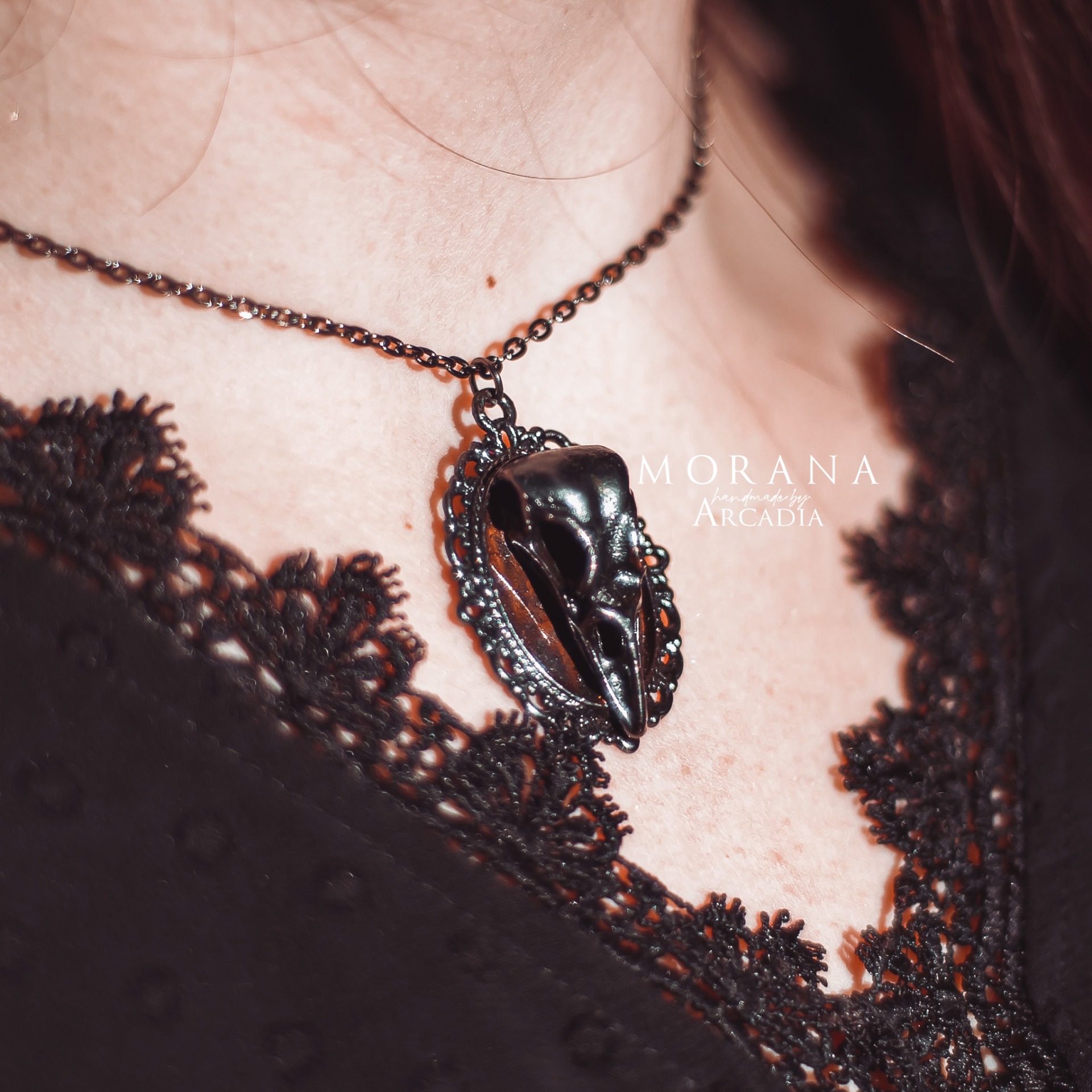 Náhrdelník s přívěskem se zdobným medailonkem s havraní lebkou v temné gunmetal patině. Vintage staroměděná patina. Vyrobeno rukama a srdcem v alchymistické dílně na severu Čech.
