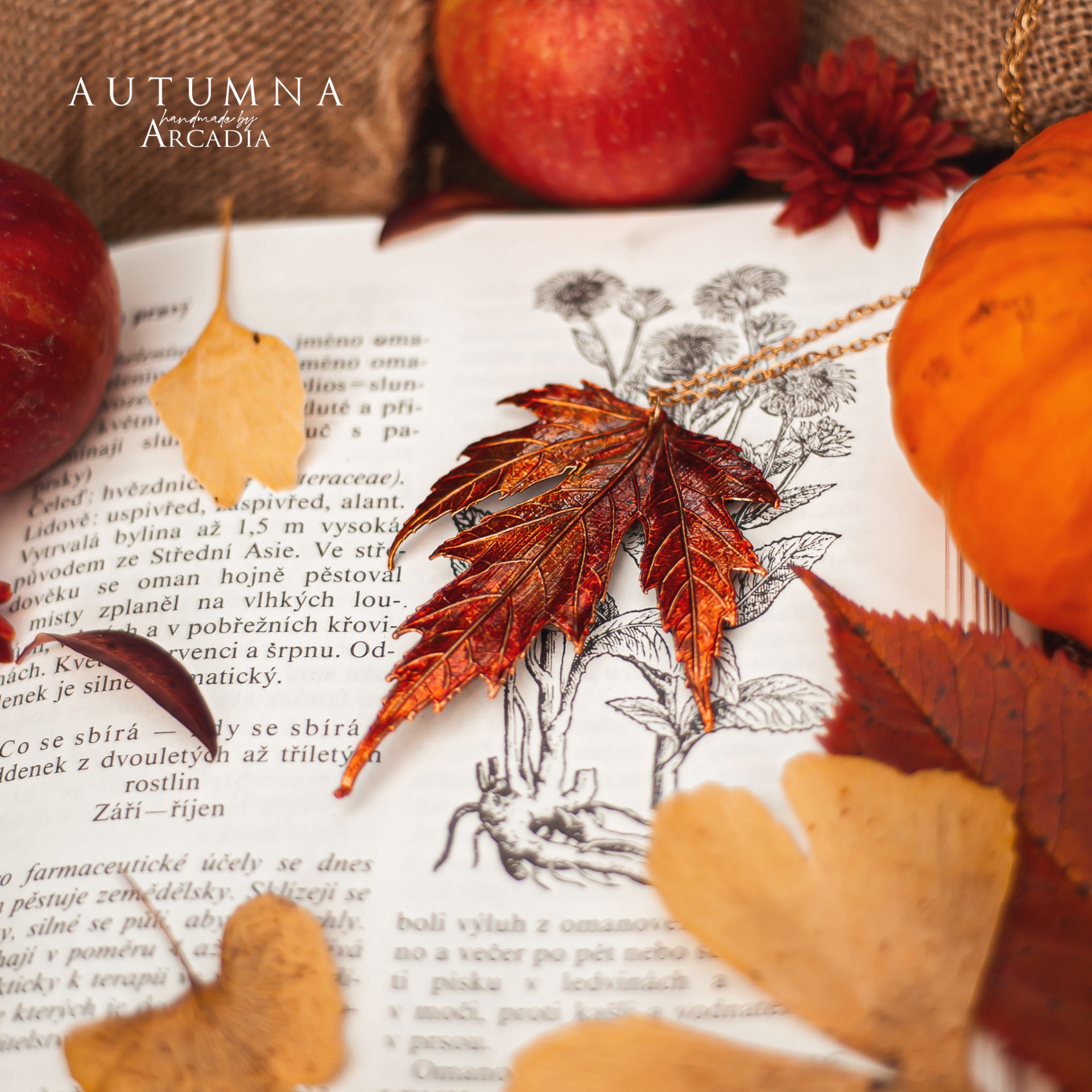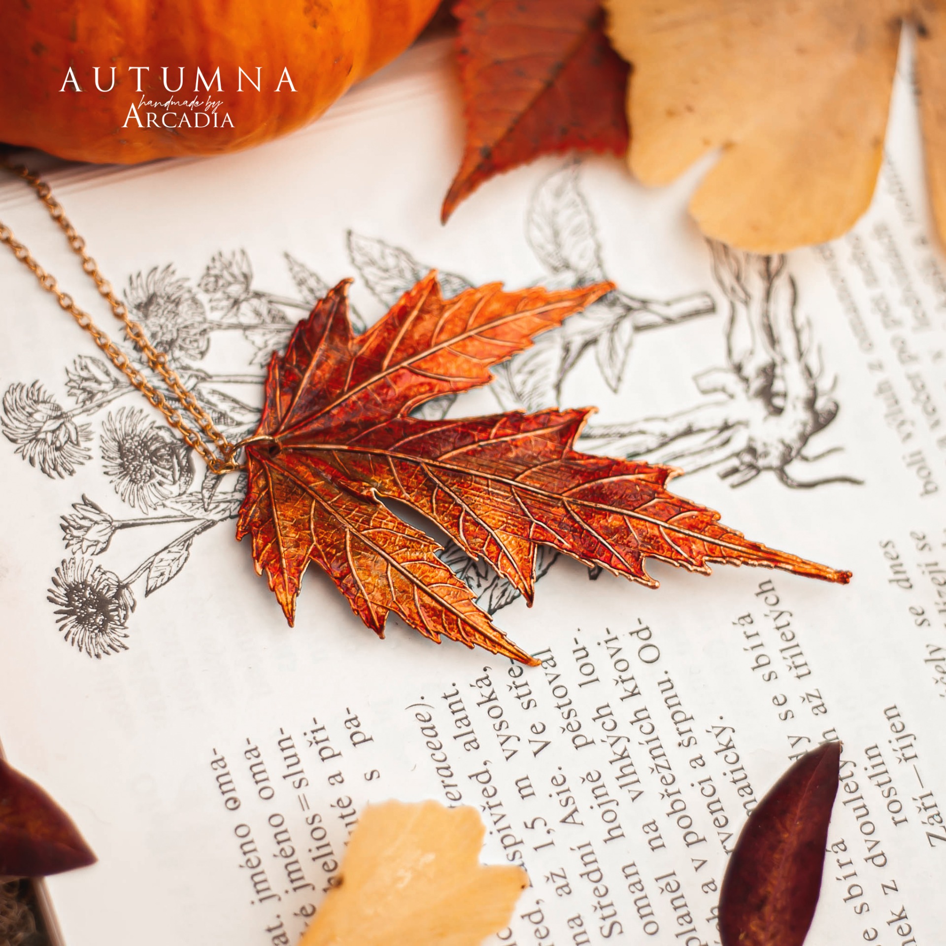 Náhrdelník s přívěskem ze skutečného pokoveného lístku cukrového javoru v podzimních ohnivých tónech. Jemný pozlacený řetízek z nerezové oceli. Vyrobeno rukama a srdcem v alchymistické dílně na severu Čech.