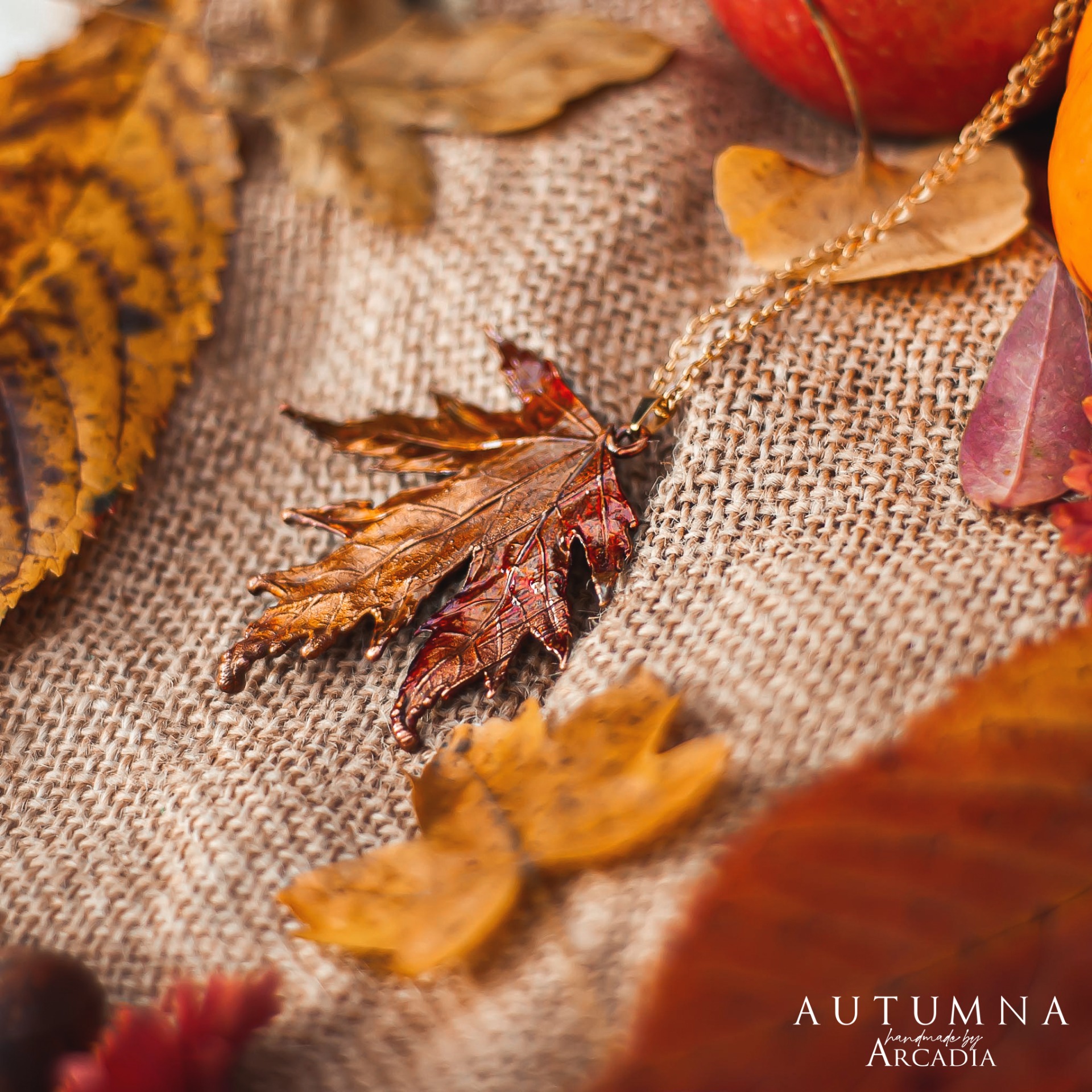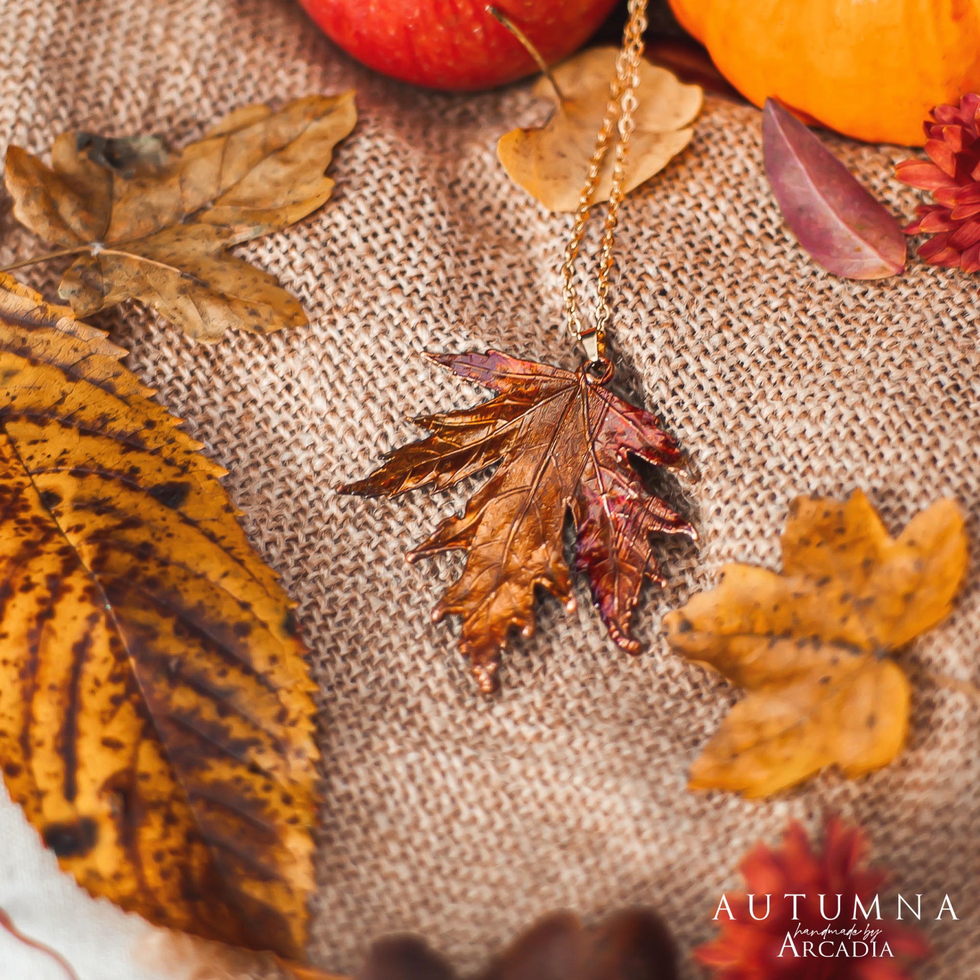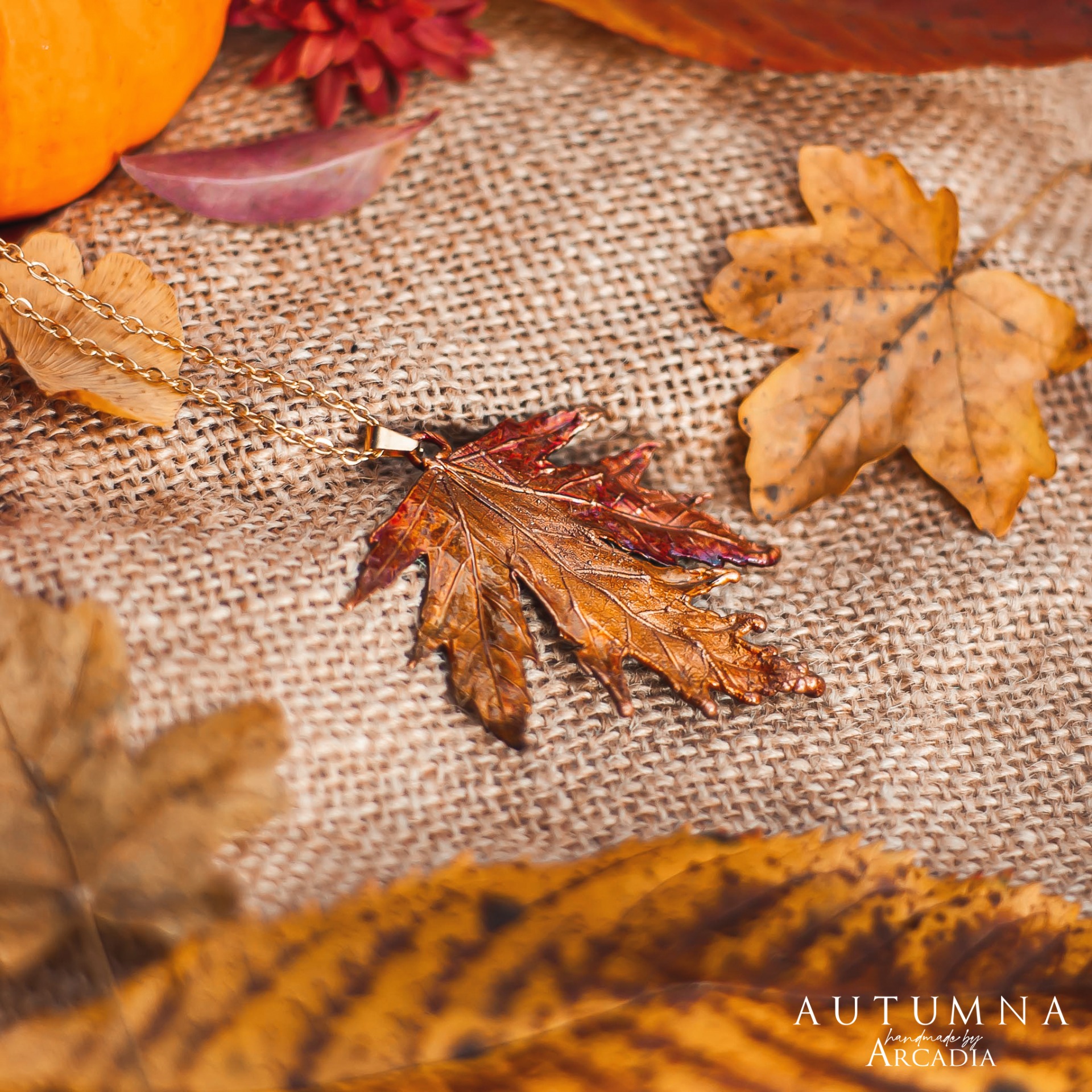 Náhrdelník s přívěskem ze skutečného pokoveného lístku cukrového javoru v podzimních ohnivých tónech. Jemný pozlacený řetízek z nerezové oceli. Vyrobeno rukama a srdcem v alchymistické dílně na severu Čech.