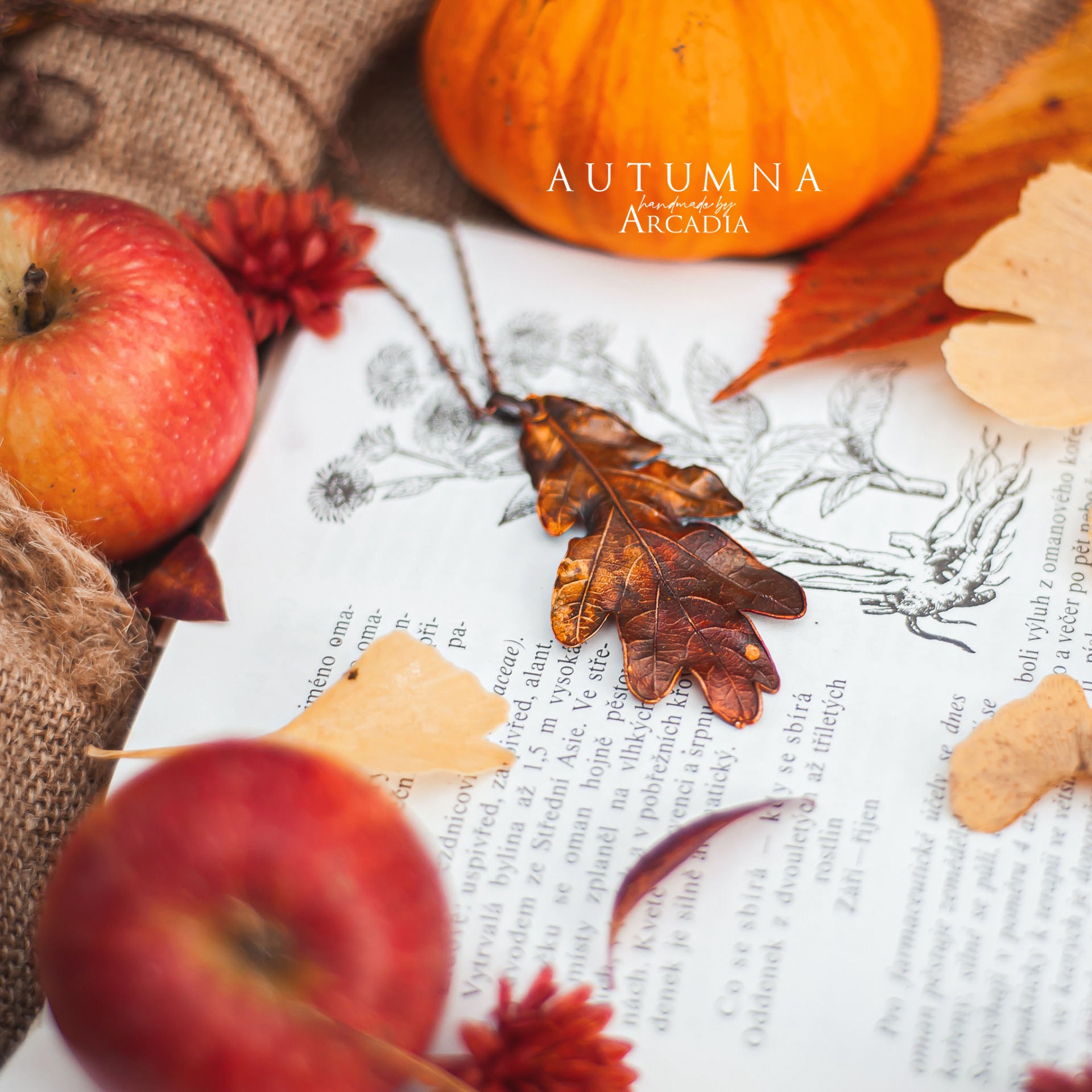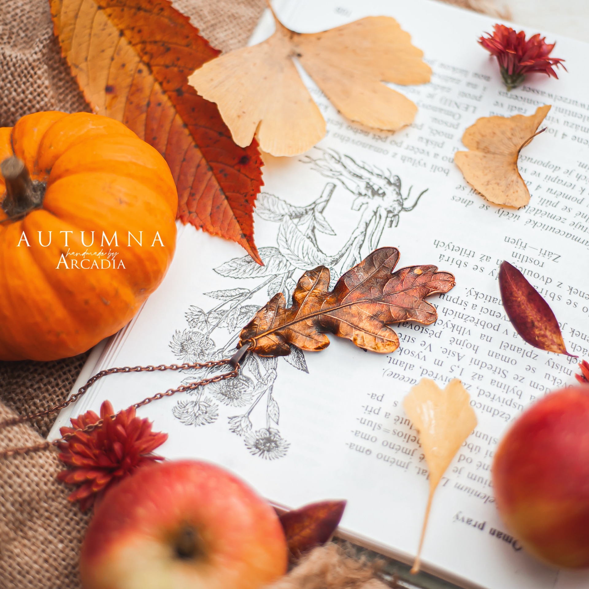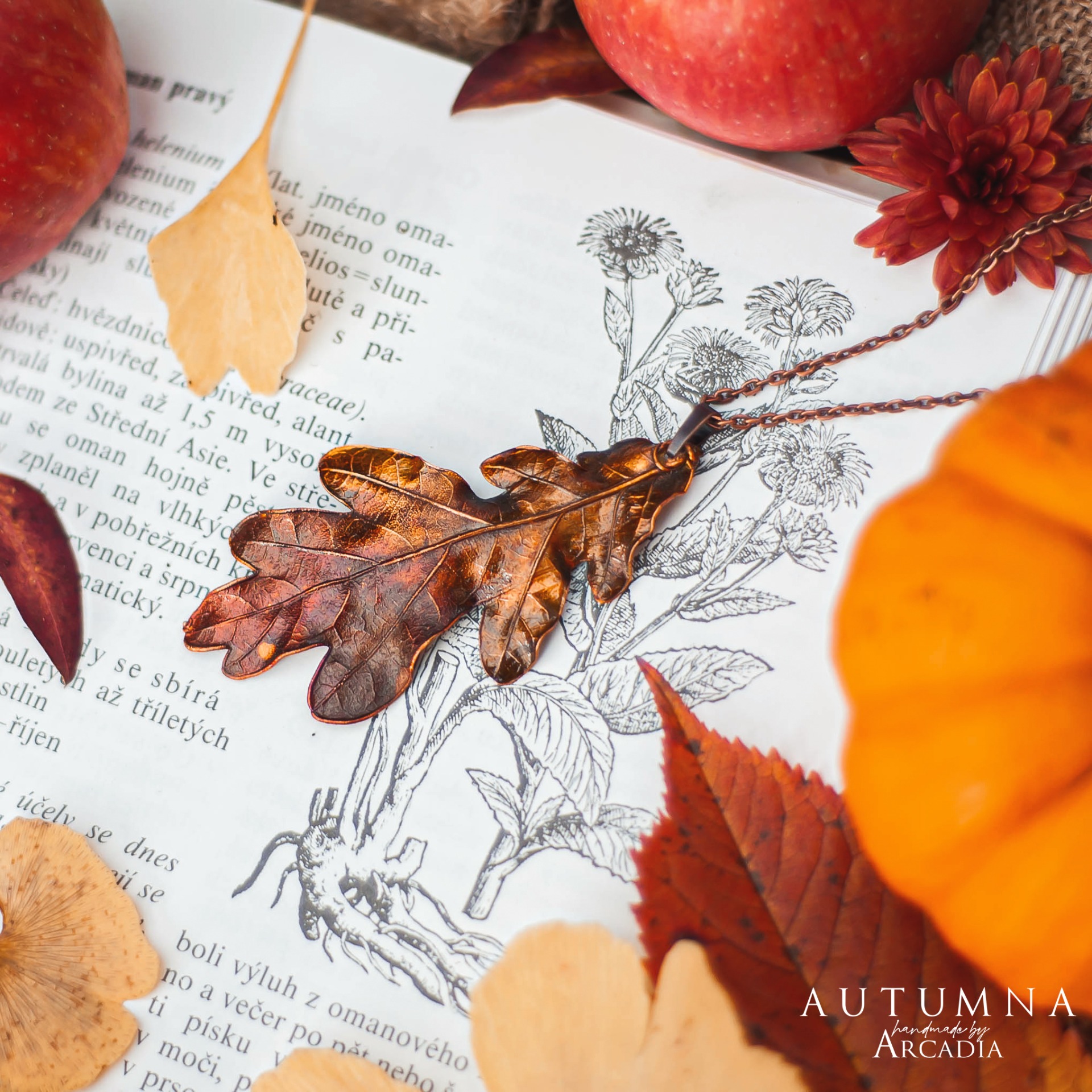 Náhrdelník s přívěskem ze skutečného pokoveného lístku dubu v podzimních tónech. Jemný staroměděný řetízek. Vyrobeno rukama a srdcem v alchymistické dílně na severu Čech.