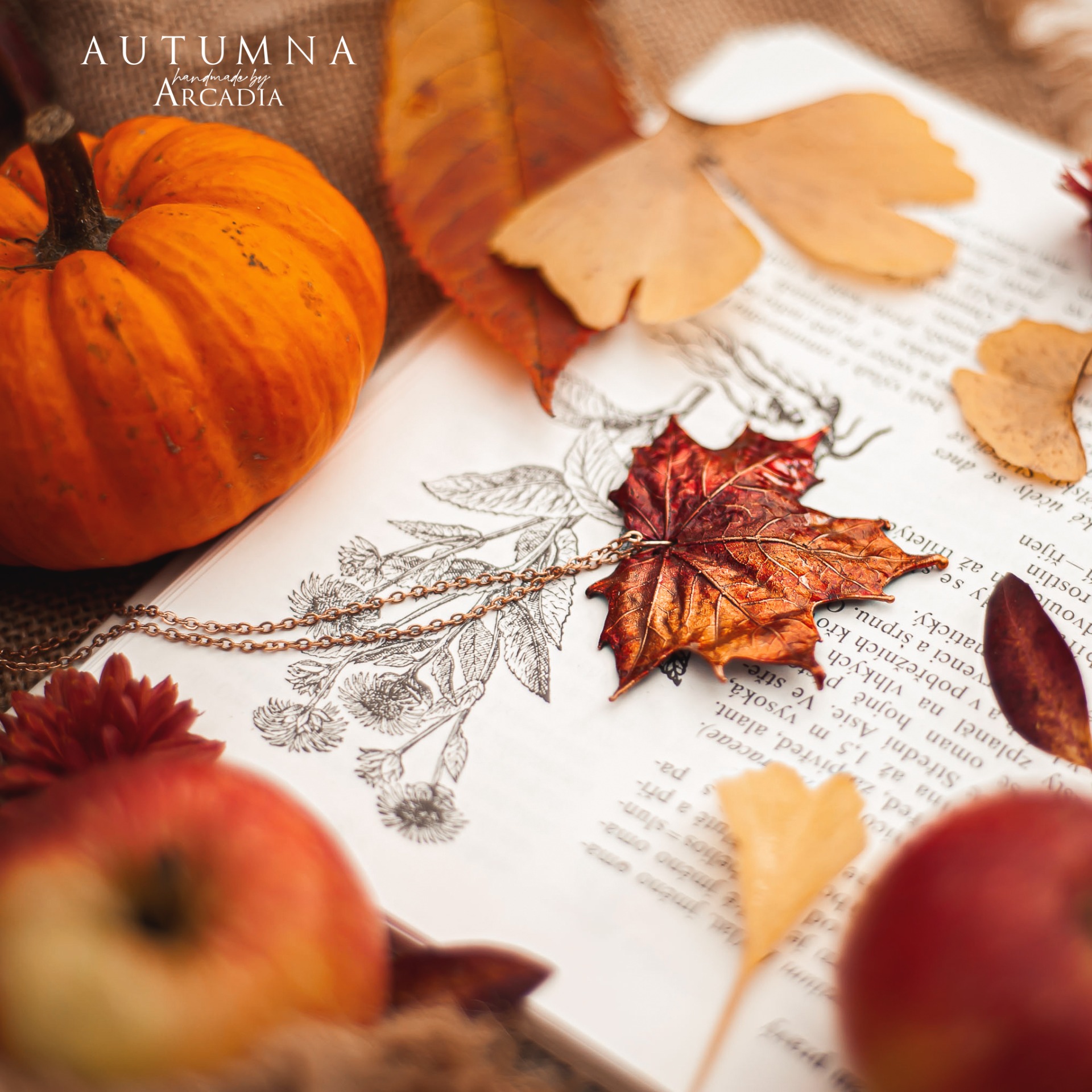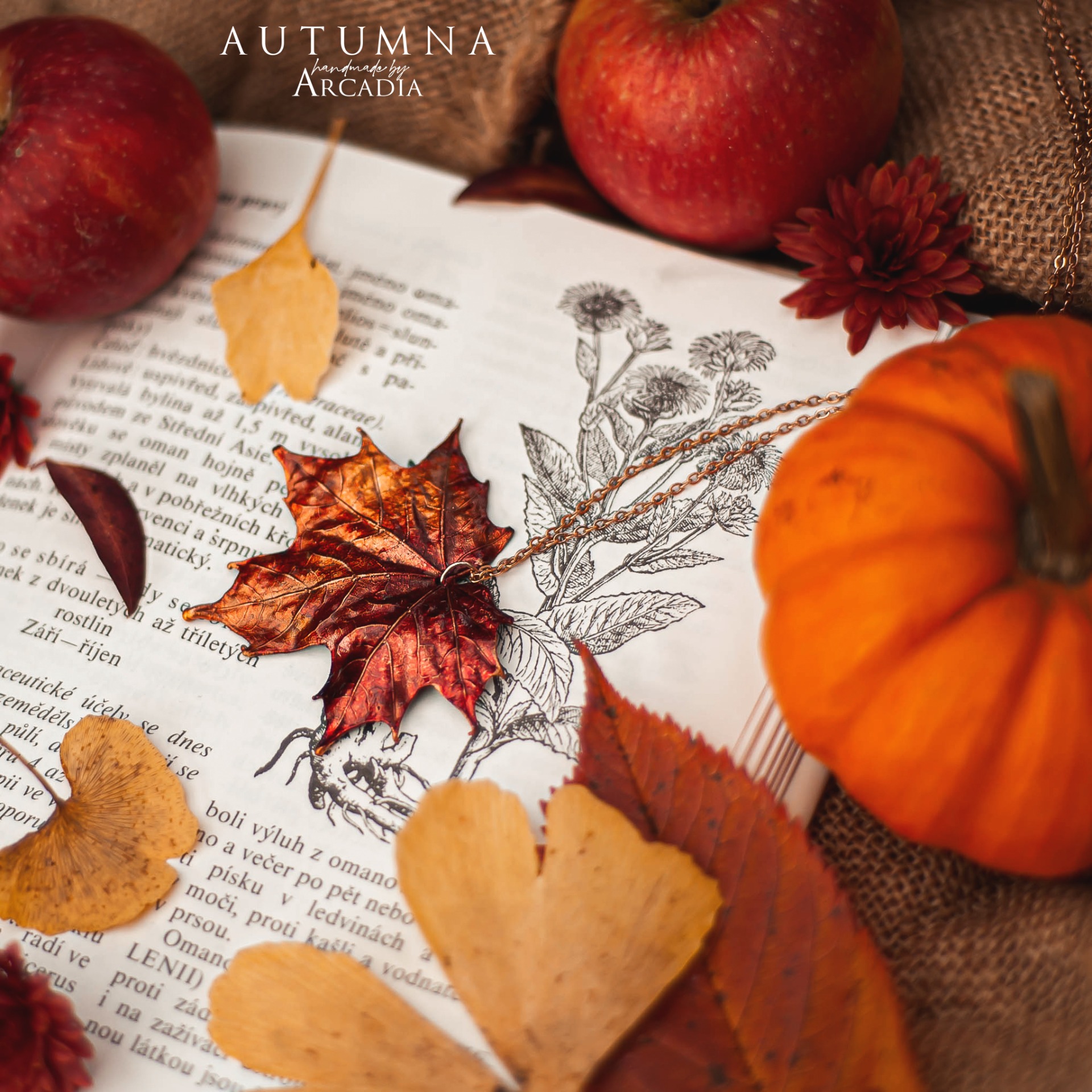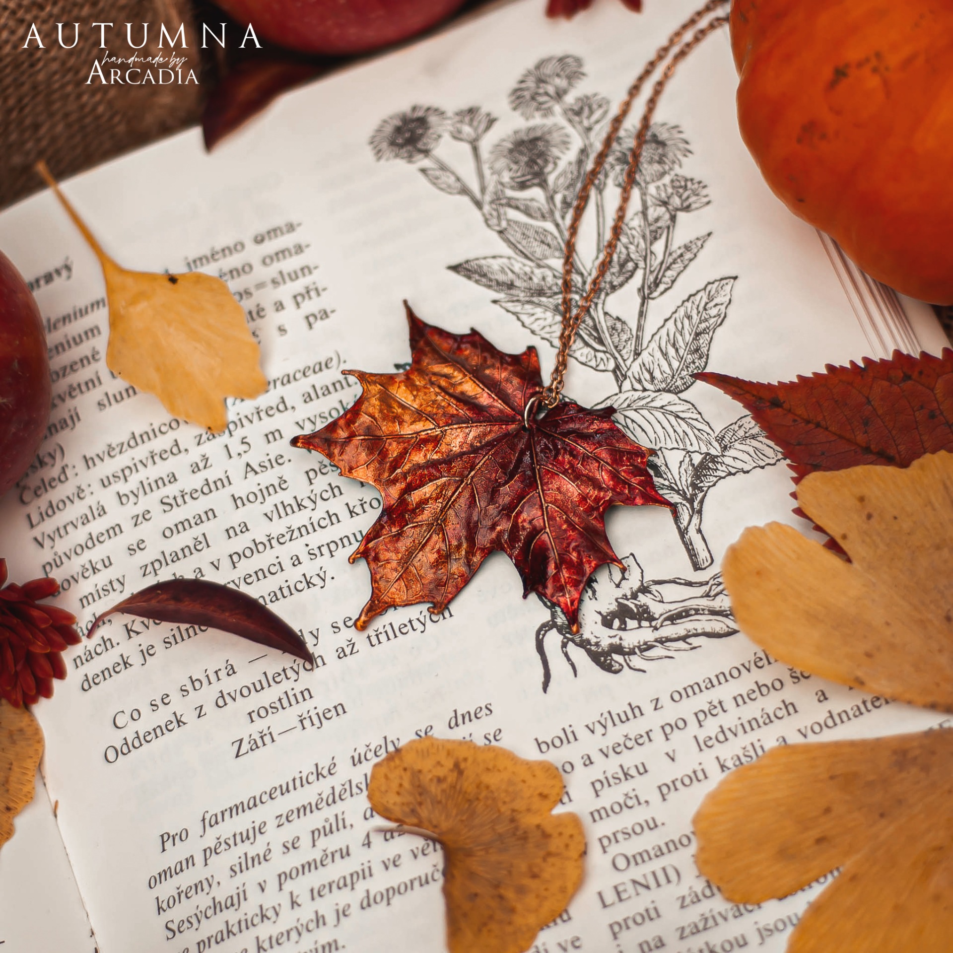 Náhrdelník s přívěskem ze skutečného pokoveného lístku javoru v podzimních ohnivých tónech. Jemný rosegold řetízek z nerezové oceli. Vyrobeno rukama a srdcem v alchymistické dílně na severu Čech.