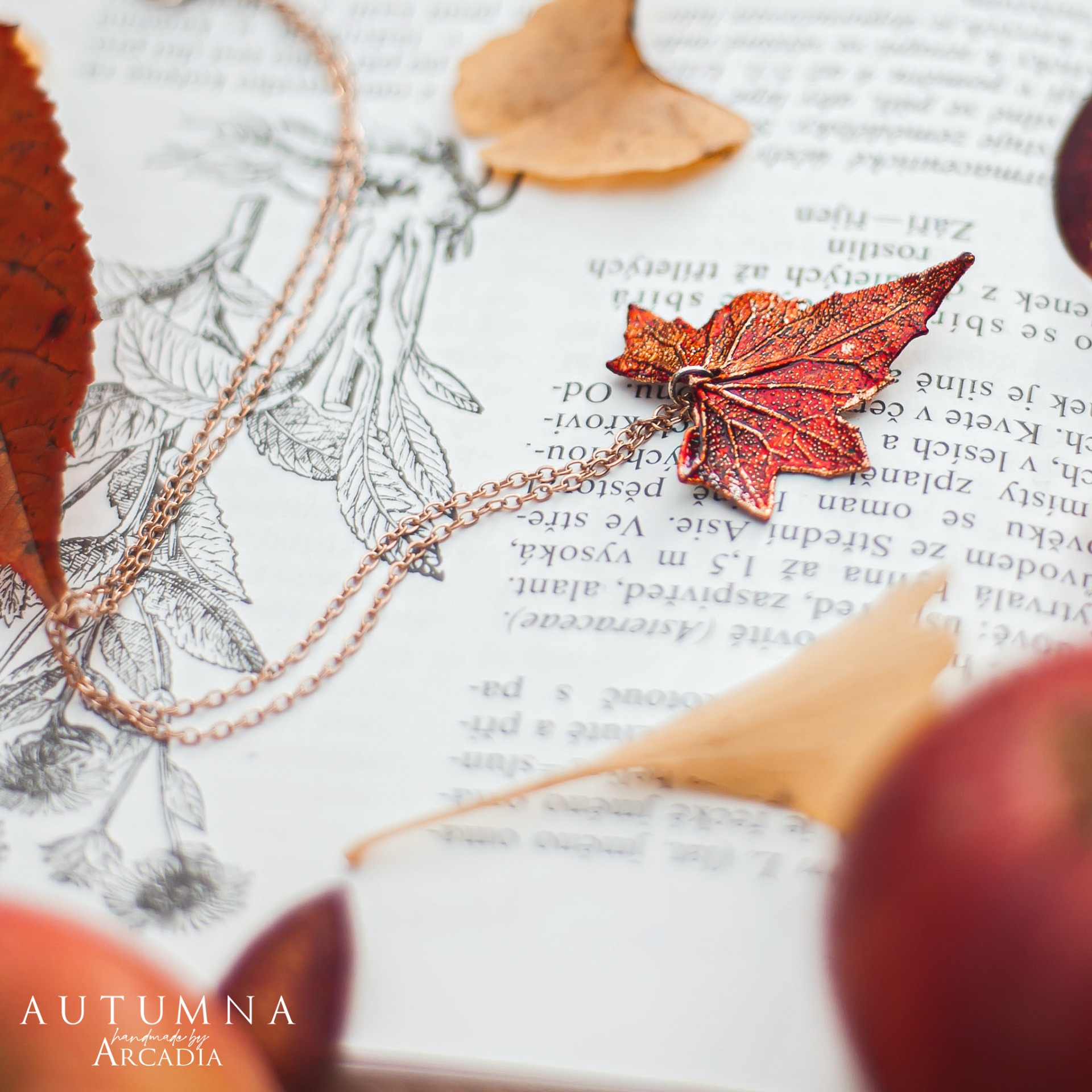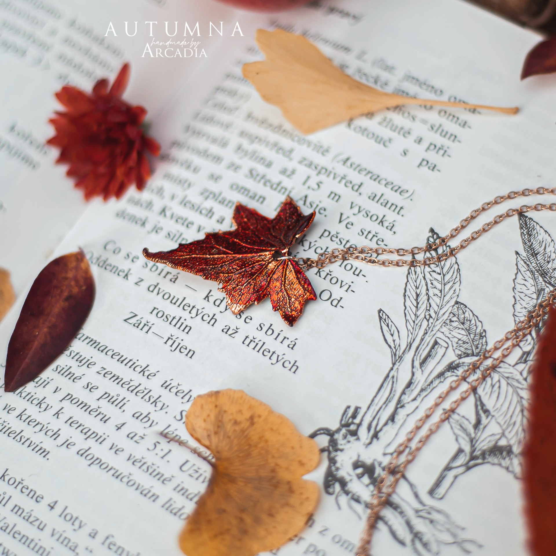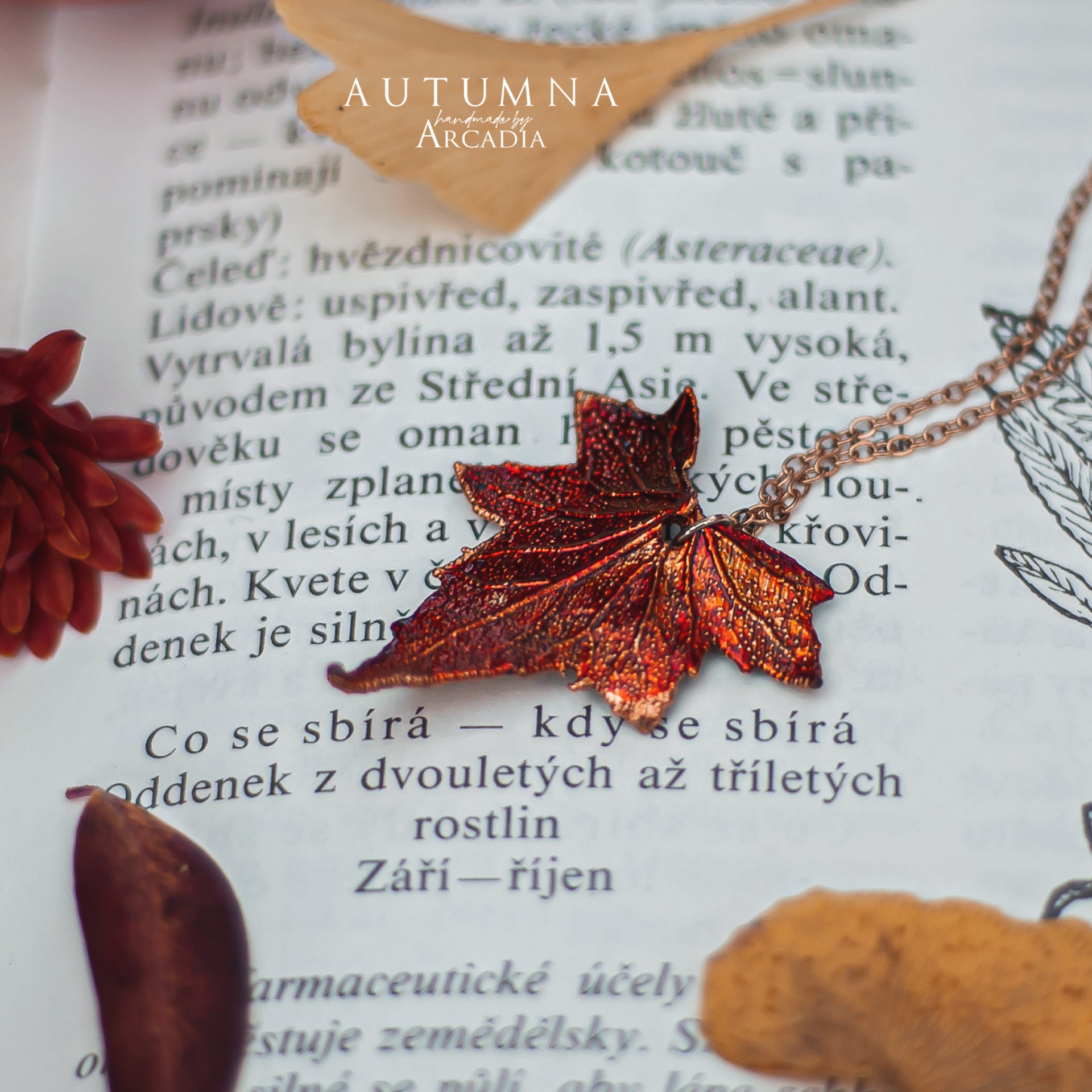 Náhrdelník s přívěskem ze skutečného pokoveného lístku posedu v ohnivých tónech. Jemný rosegold řetízek z nerezové oceli. Vyrobeno rukama a srdcem v alchymistické dílně na severu Čech.