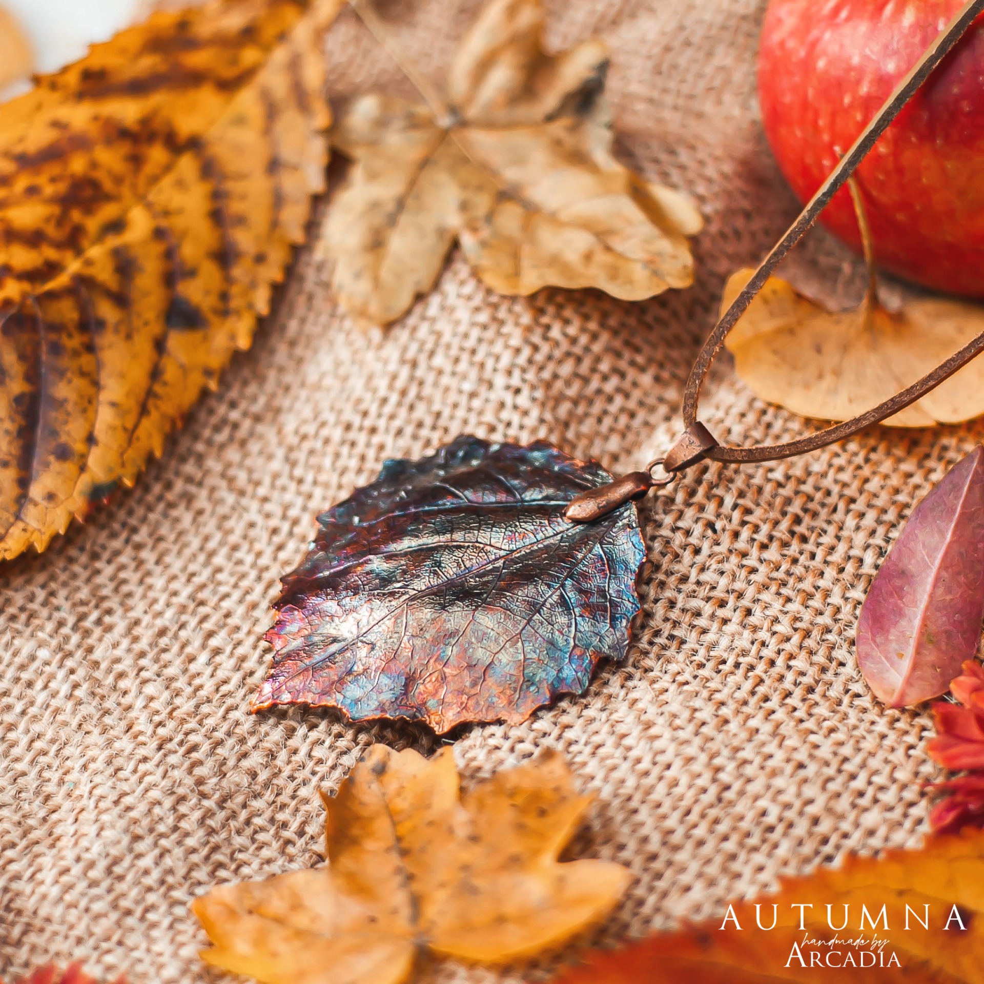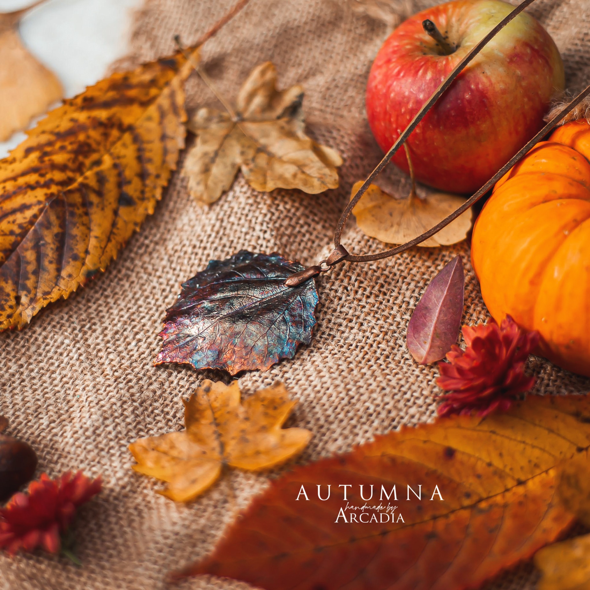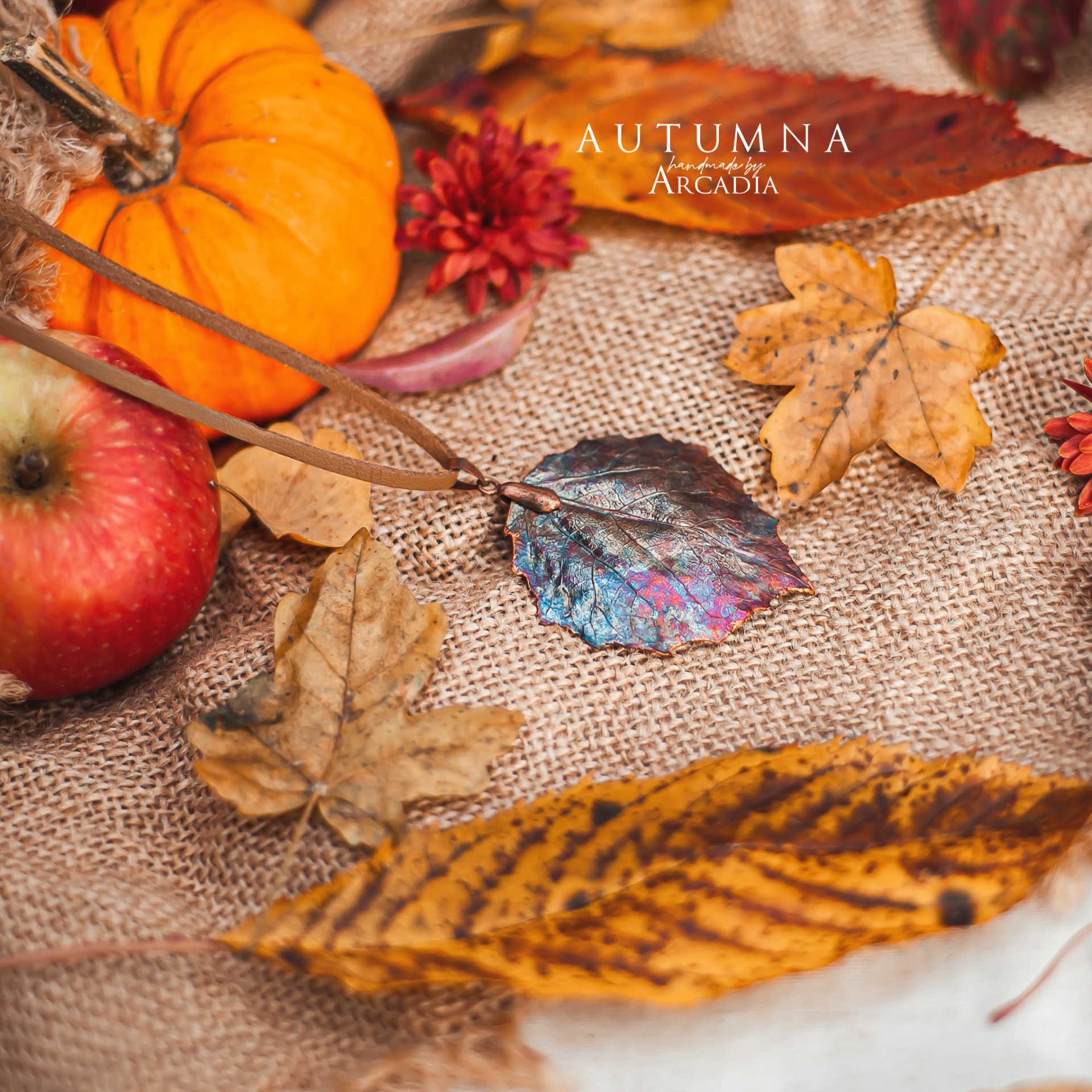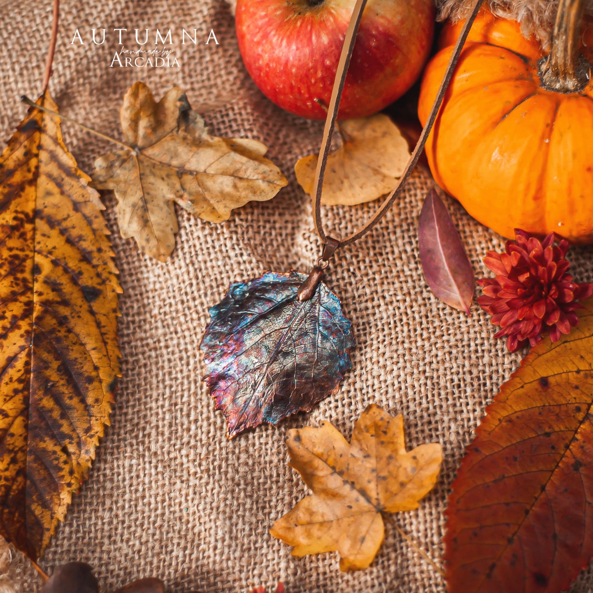 Náhrdelník s přívěskem ze skutečného pokoveného lístku osiky v olejově duhové patině. Řemínek se zapínáním ze světle hvědé umělé kůže. Vyrobeno rukama a srdcem v alchymistické dílně na severu Čech.