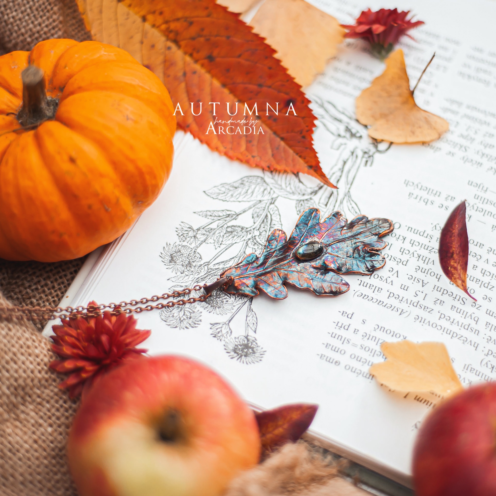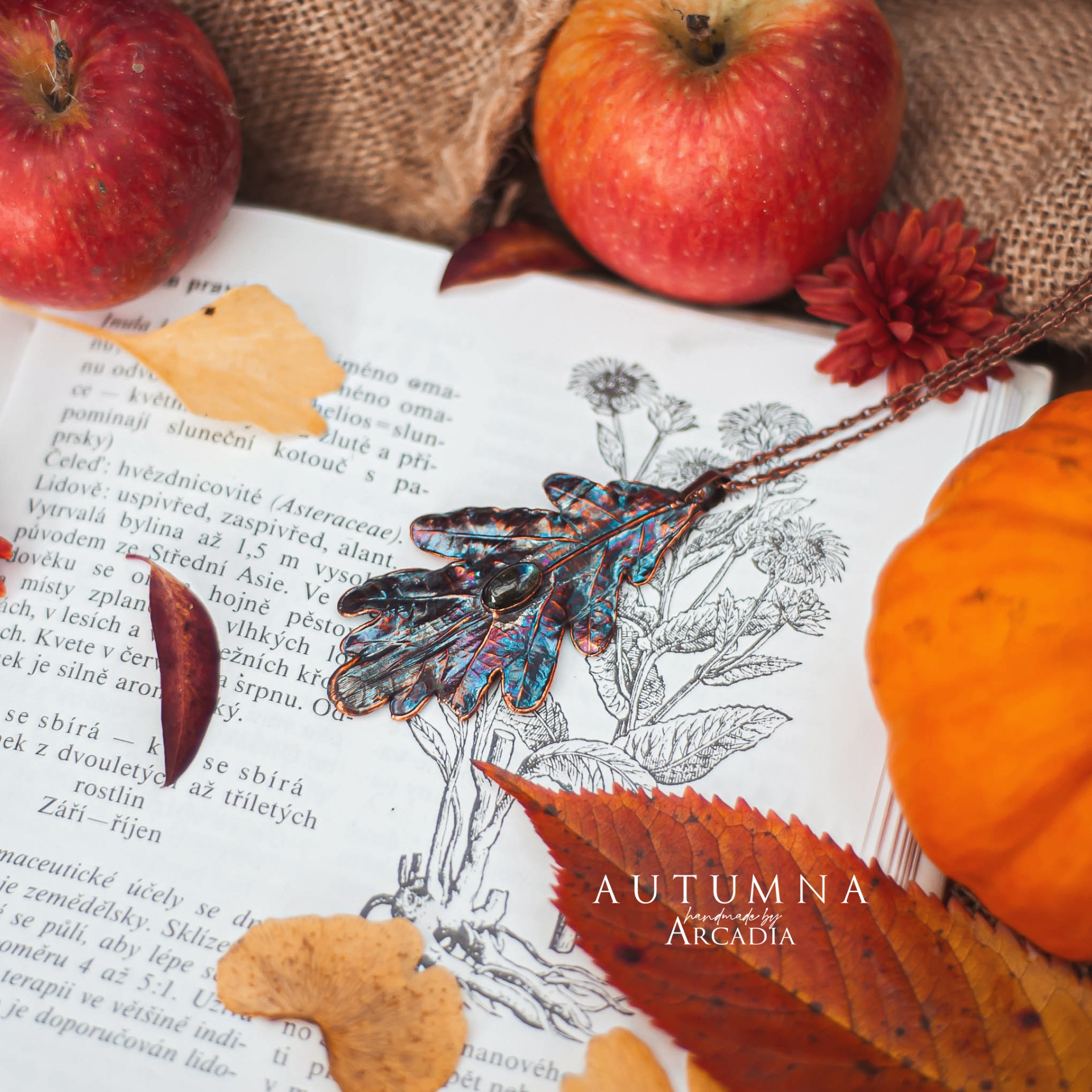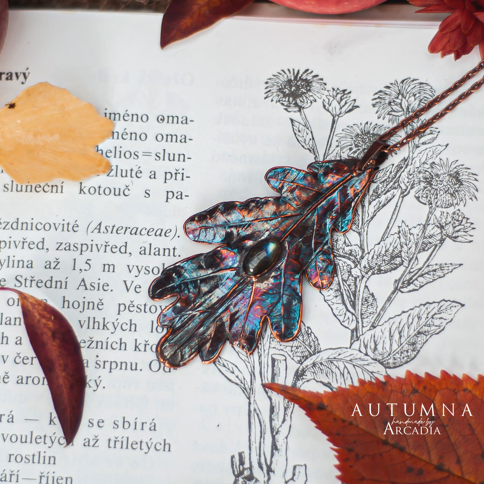 Náhrdelník s přívěskem ze skutečného pokoveného dubového lístku v olejově duhové patině s kabošonem modrozeleného labradoritu. Vyrobeno rukama a srdcem v alchymistické dílně na severu Čech.