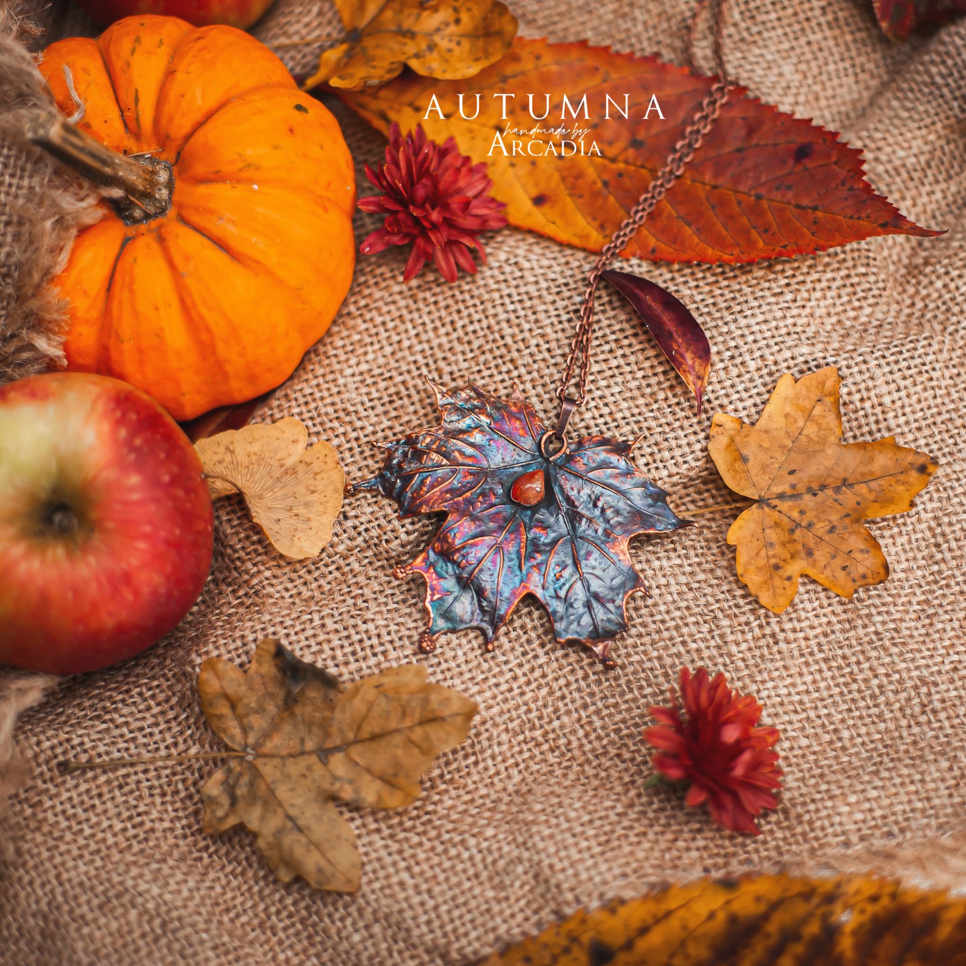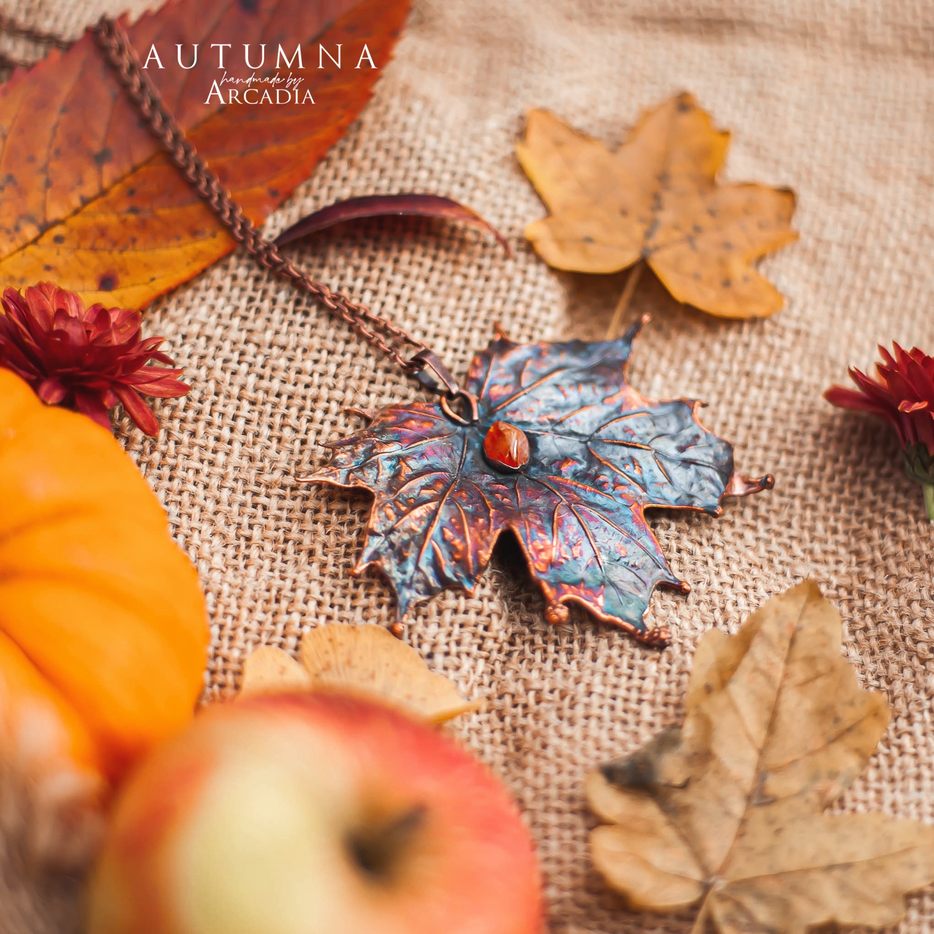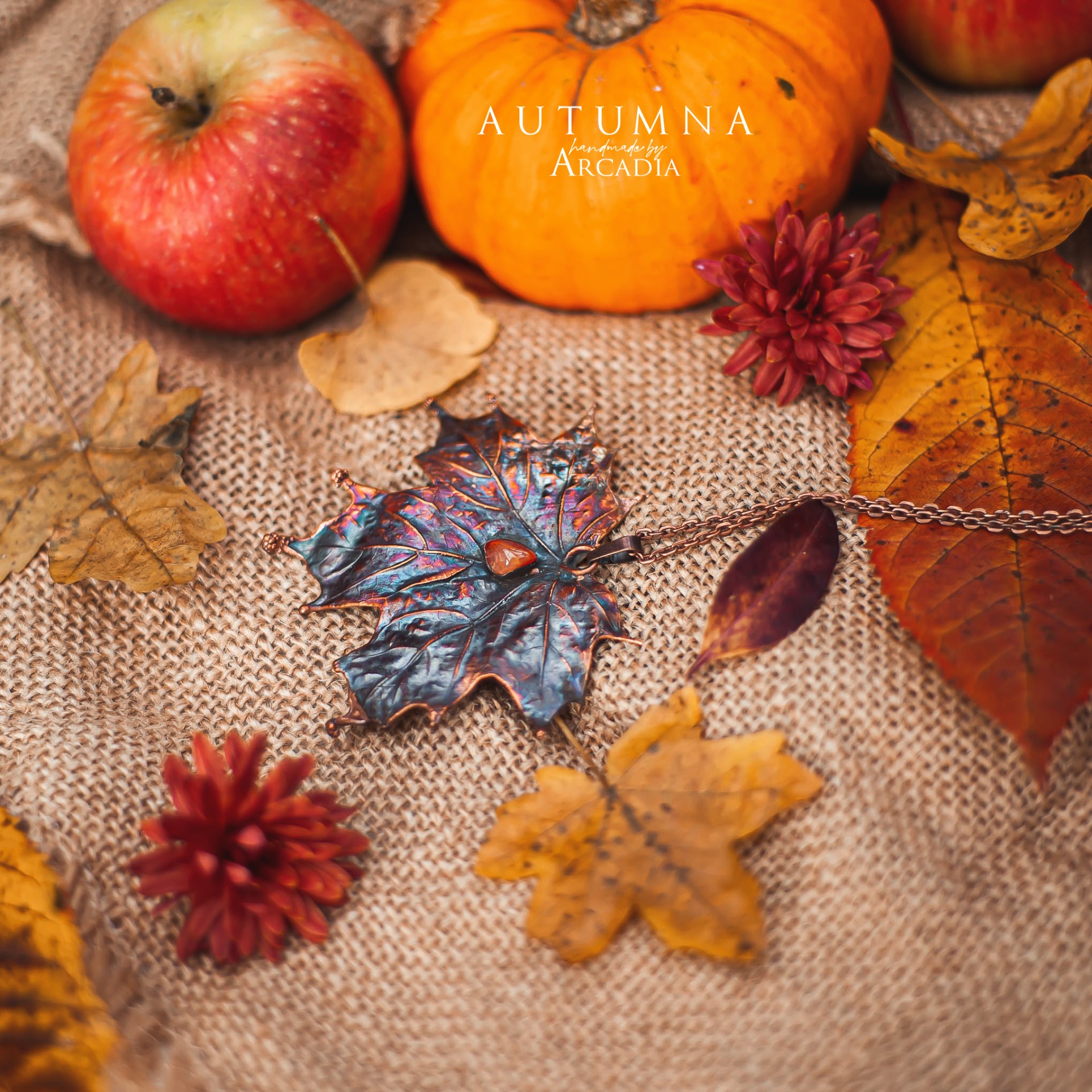 Náhrdelník s přívěskem ze skutečného pokoveného lístku javoru v olejově duhové patině ozdobeným karneolem. Jemný pozlacený řetízek z nerezové oceli. Vyrobeno rukama a srdcem v alchymistické dílně na severu Čech.