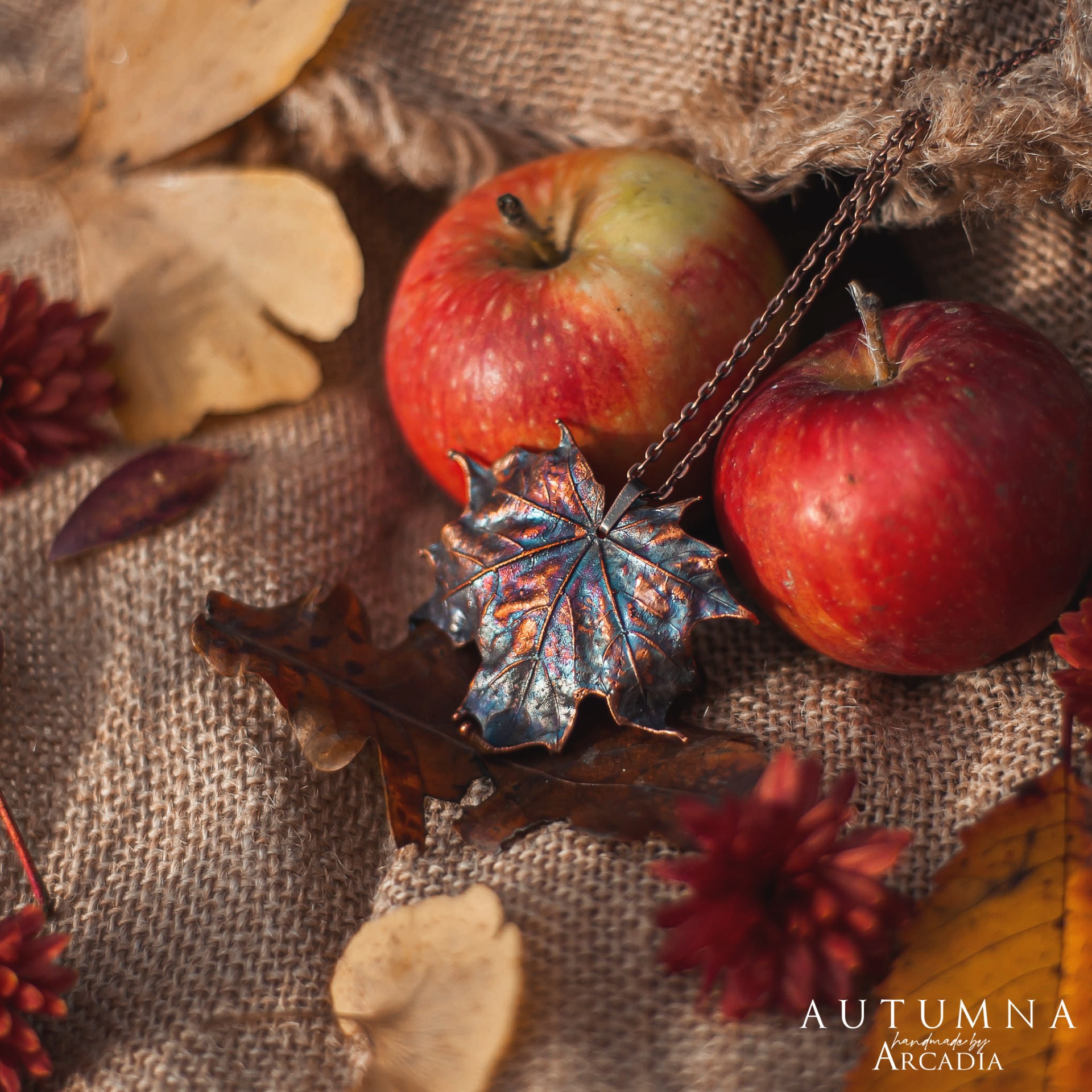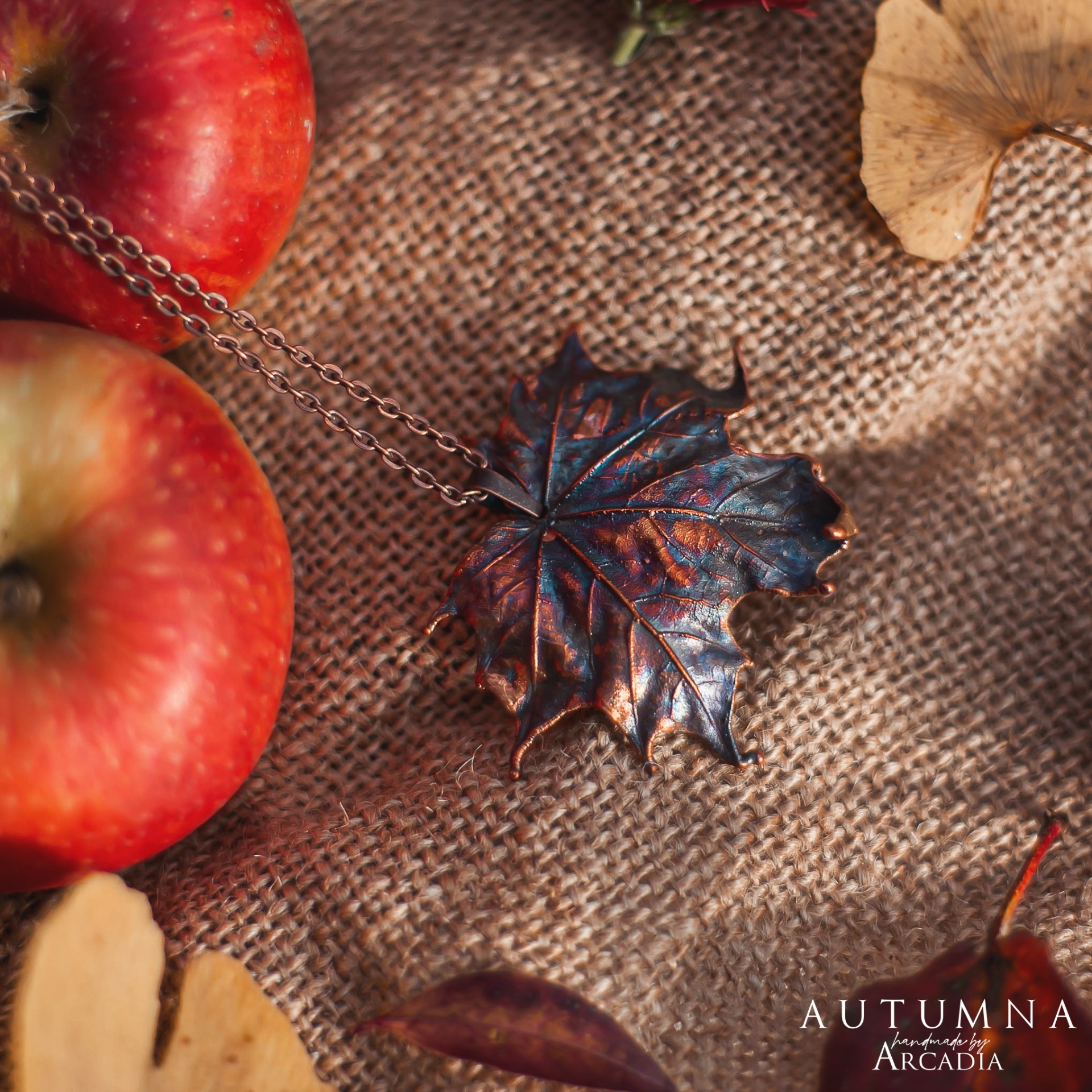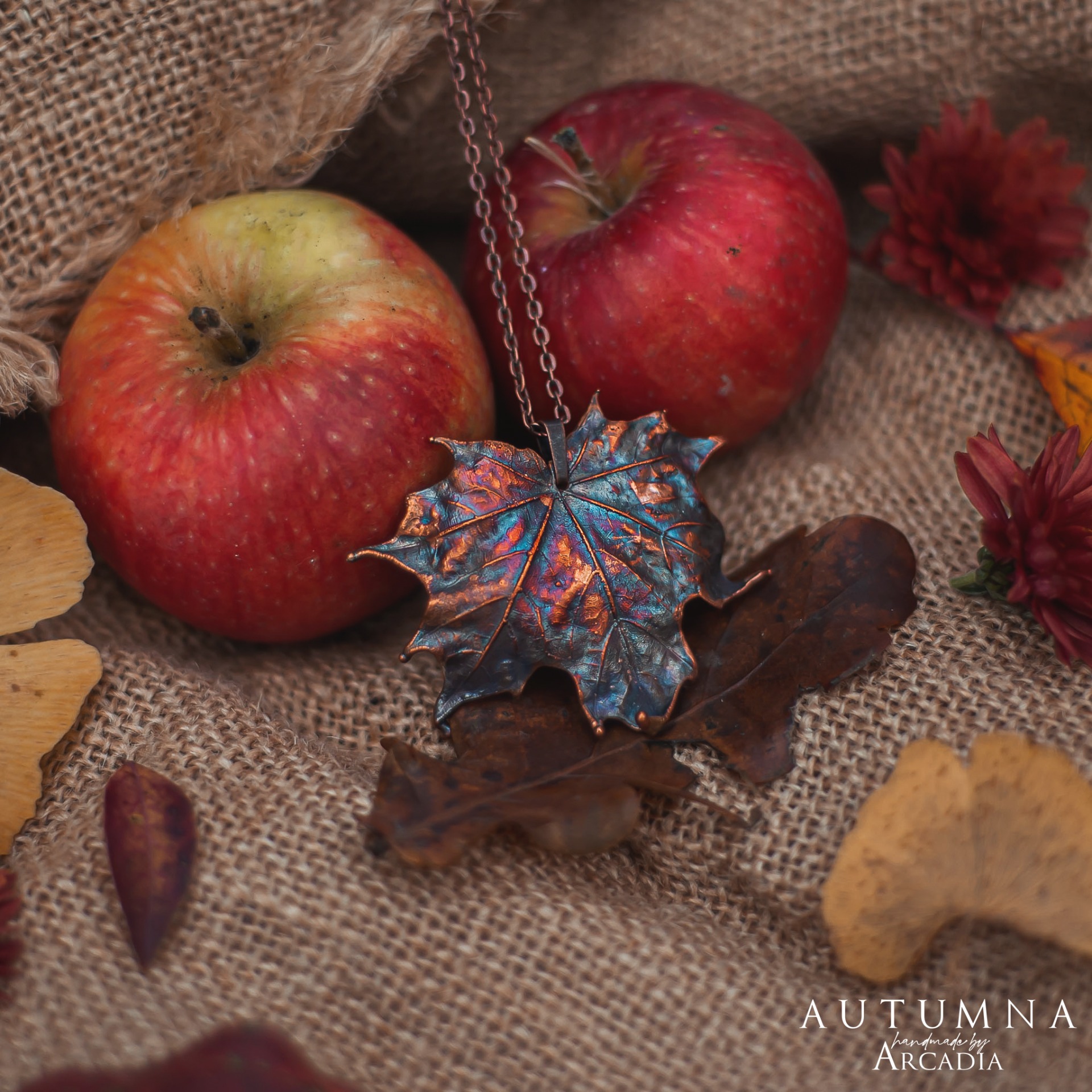 Náhrdelník s přívěskem ze skutečného pokoveného lístku javoru v olejově duhové patině. Jemný staroměděný řetízek. Vyrobeno rukama a srdcem v alchymistické dílně na severu Čech.