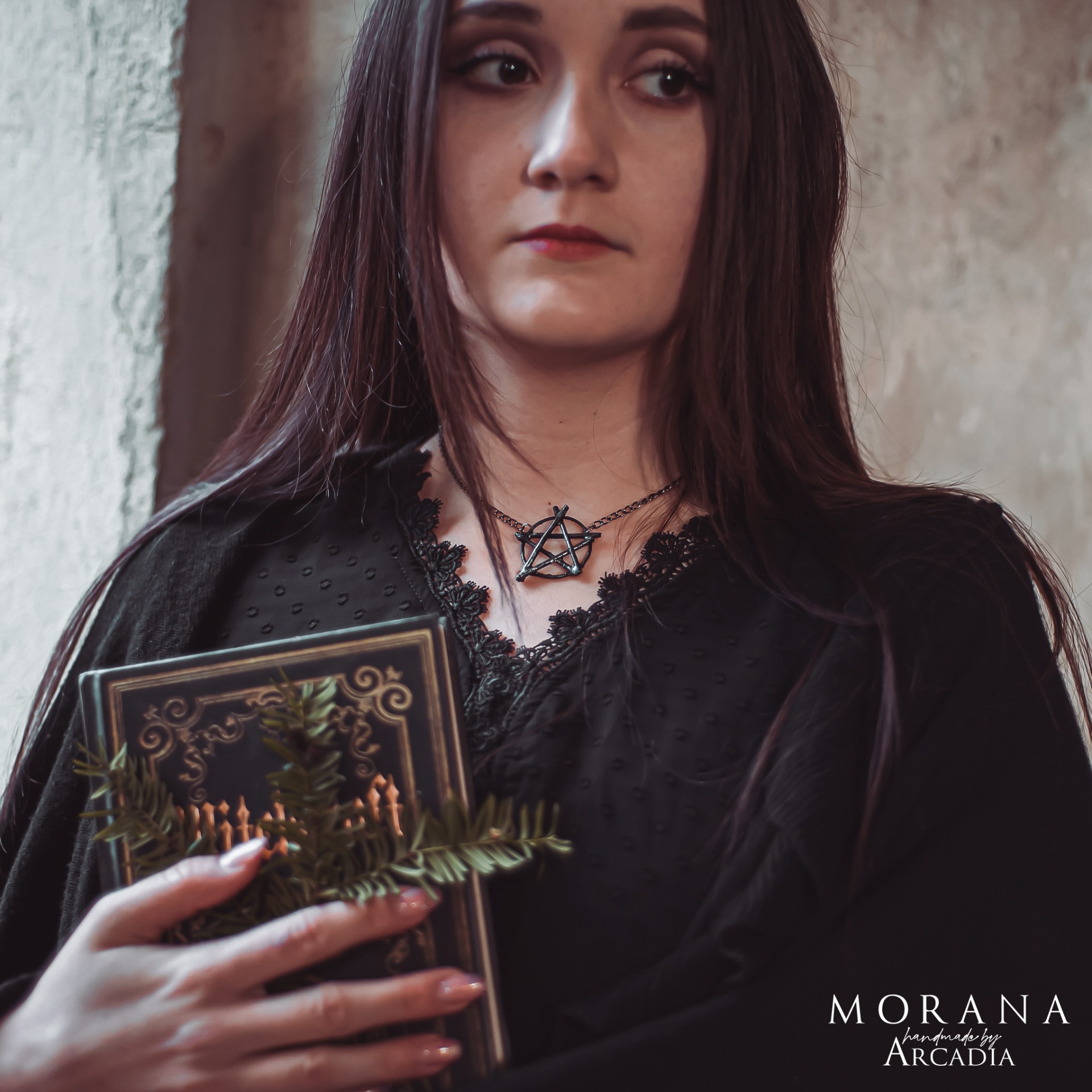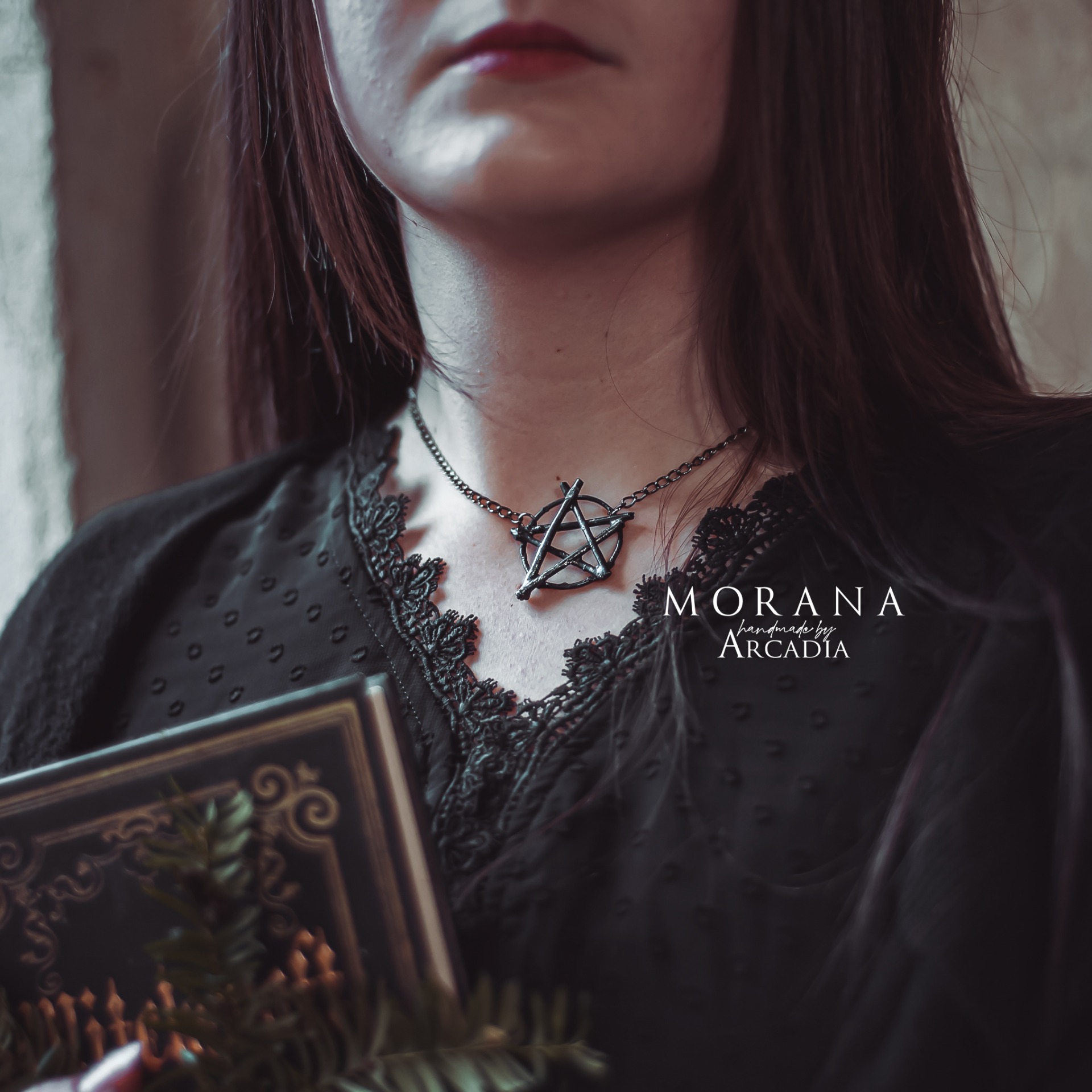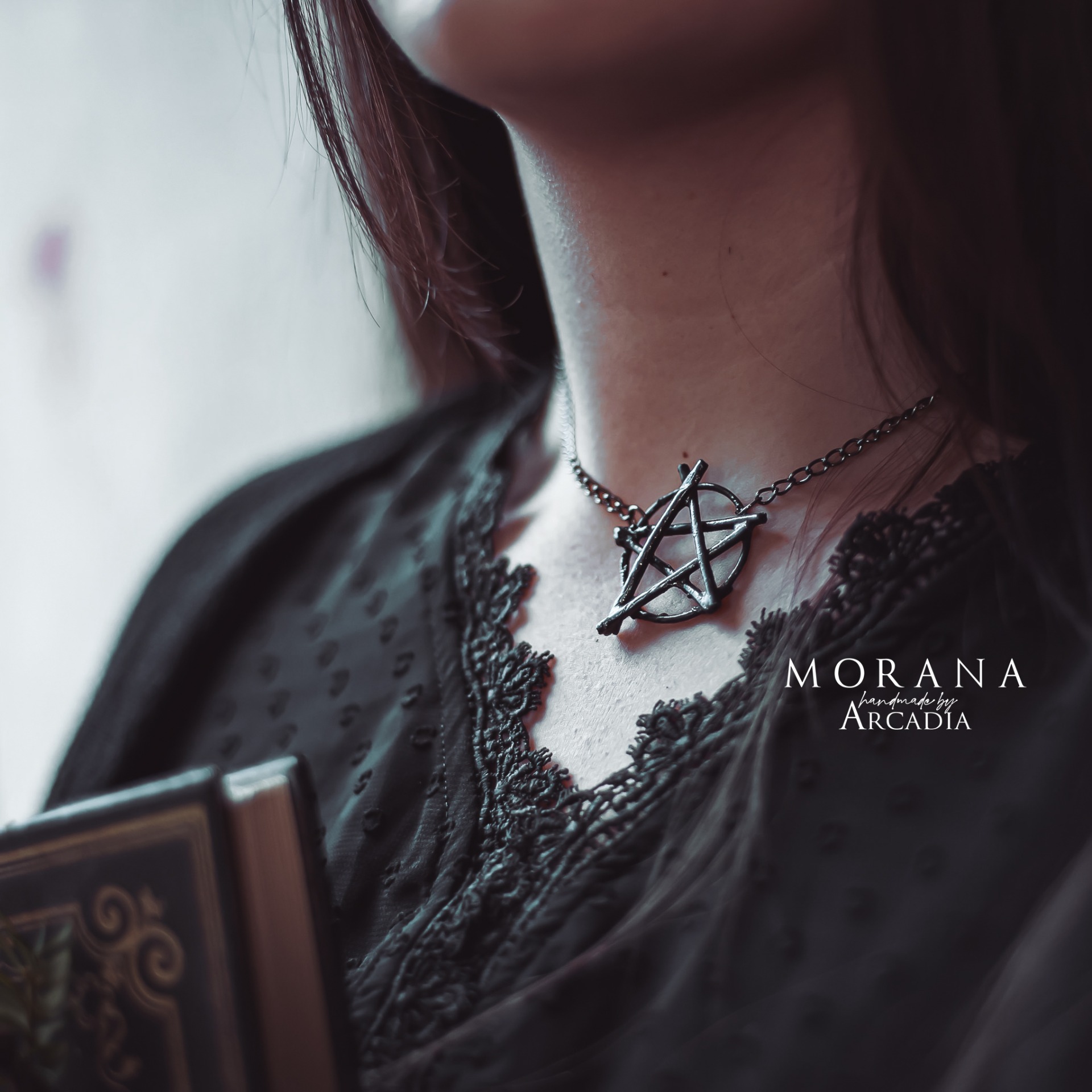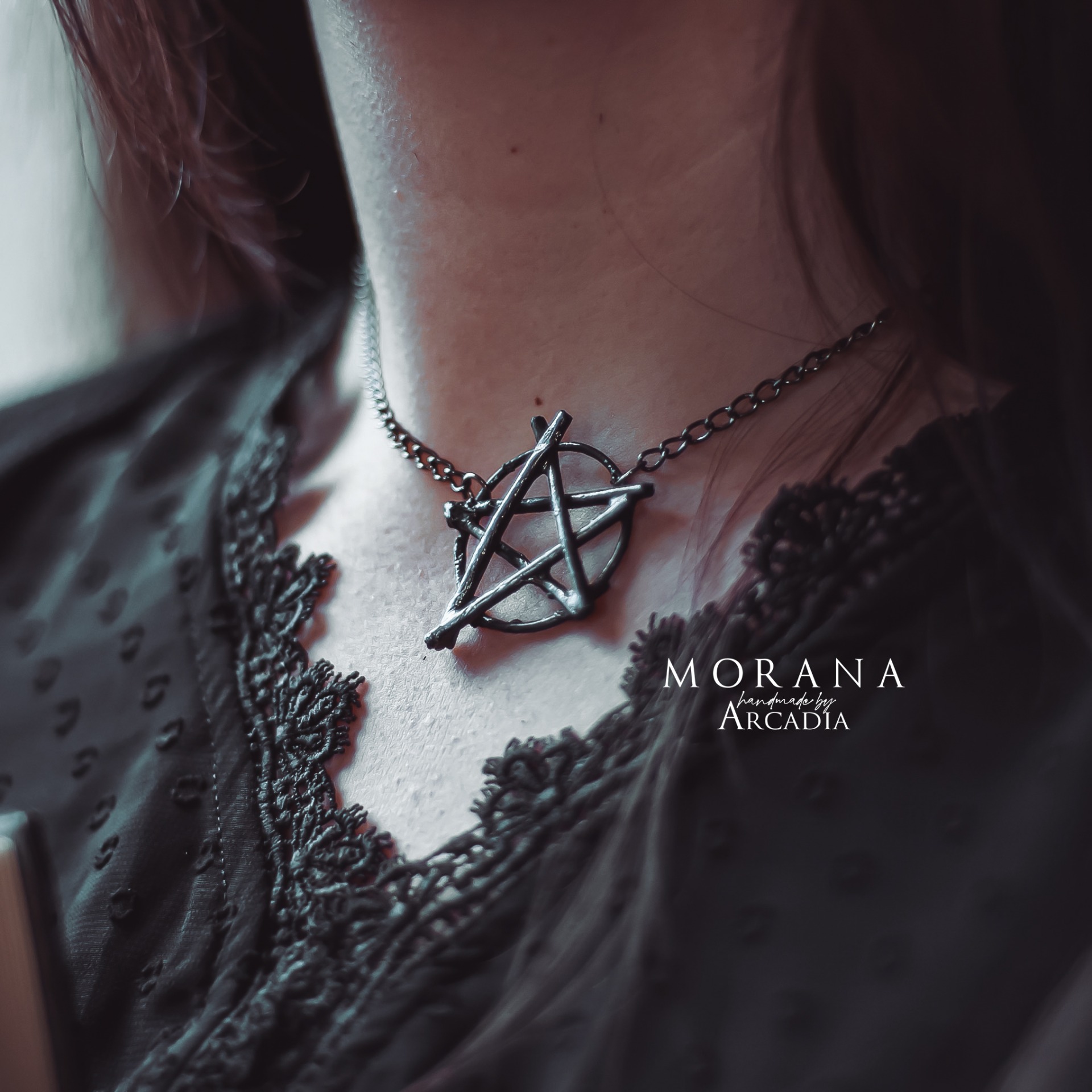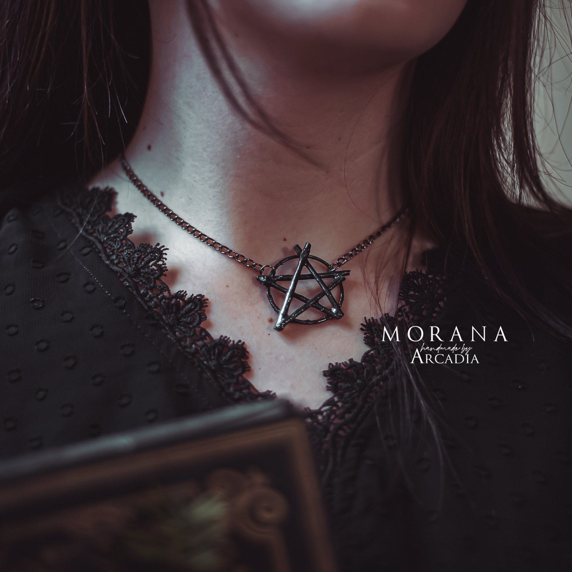 Náhrdelník s přívěskem ze skutečných pokovených větviček ve tvaru pentagramu v temné gunmetal patině. Must have každodenní ochrana pro každou praktikující čarodějku. Vyrobeno rukama a srdcem v alchymistické dílně na severu Čech.
