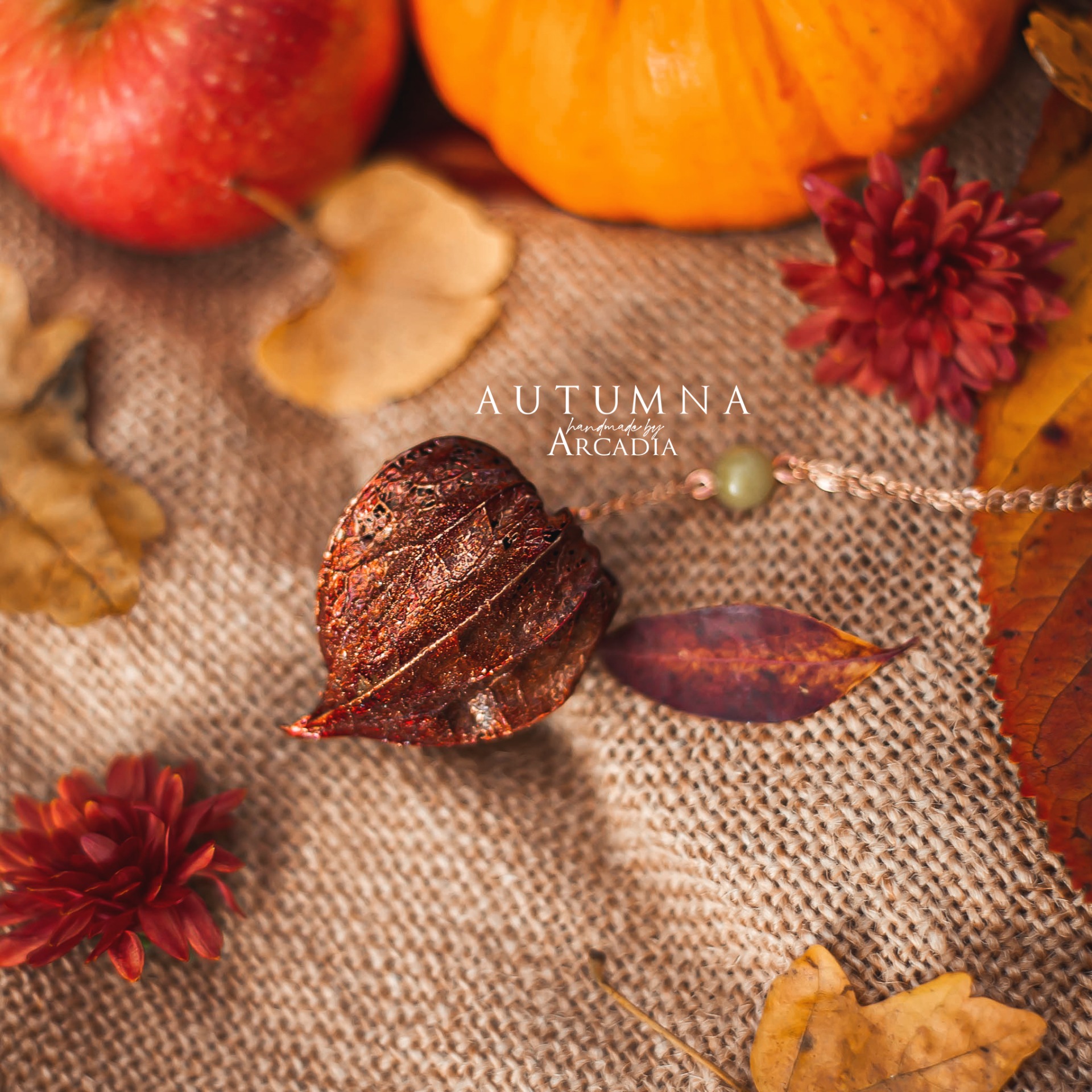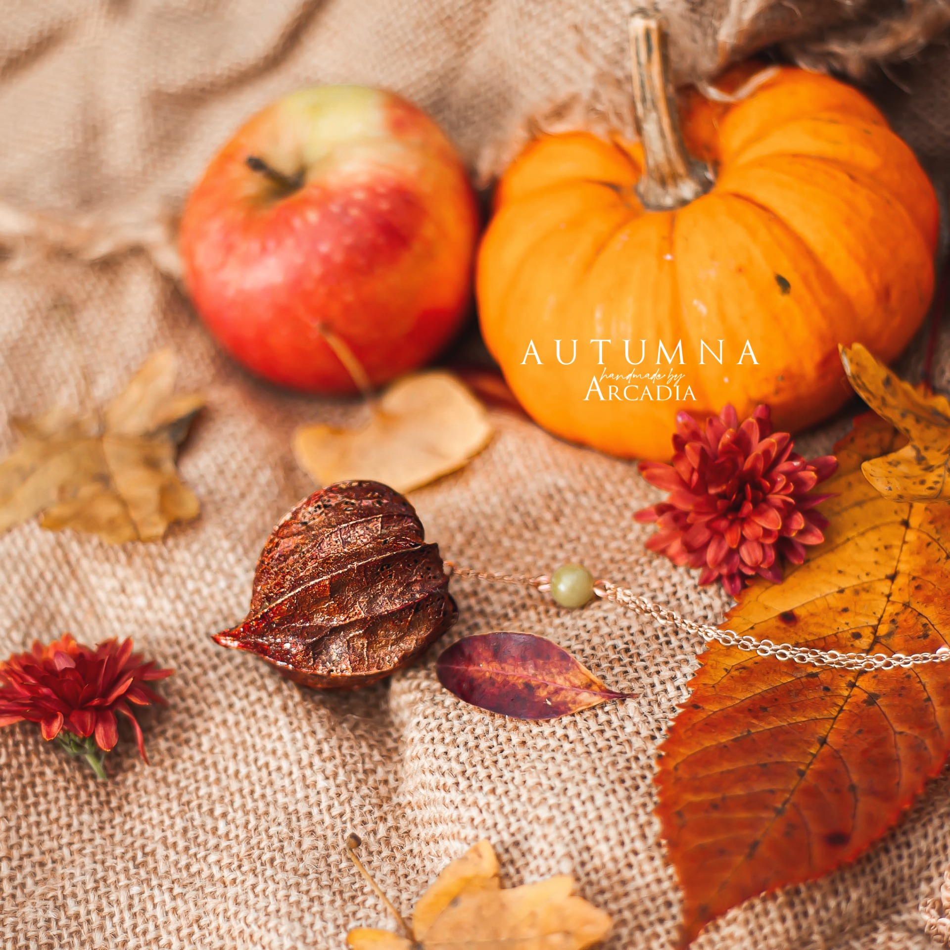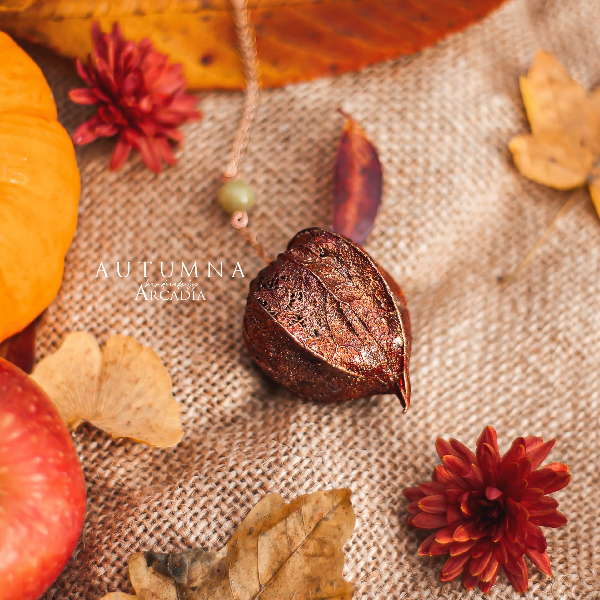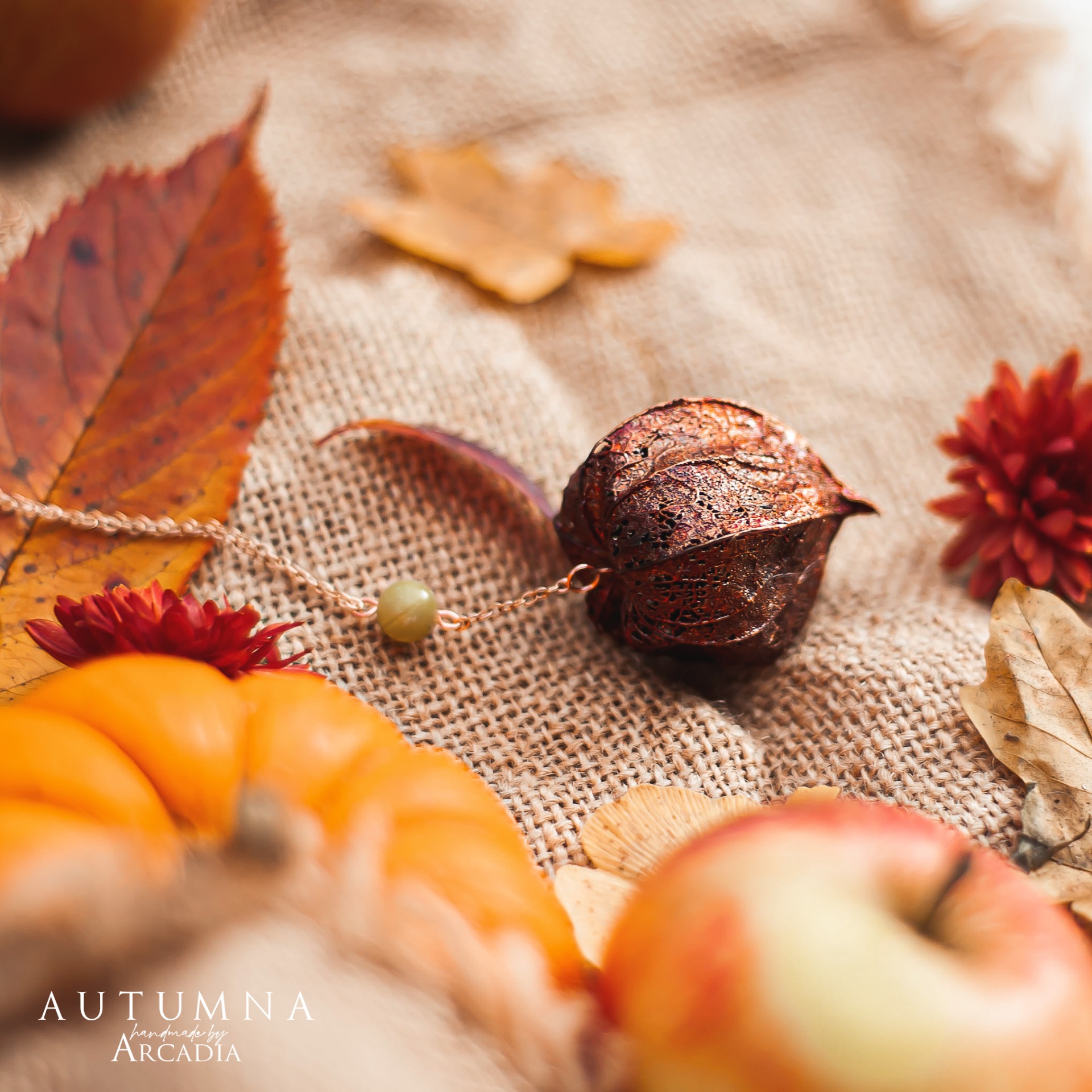 Náhrdelník s přívěskem ze skutečného pokoveného skeletu plodu physalis neboli mochyně a perličkou zeleného jadeitu. Vyrobeno rukama a srdcem v alchymistické dílně na severu Čech.