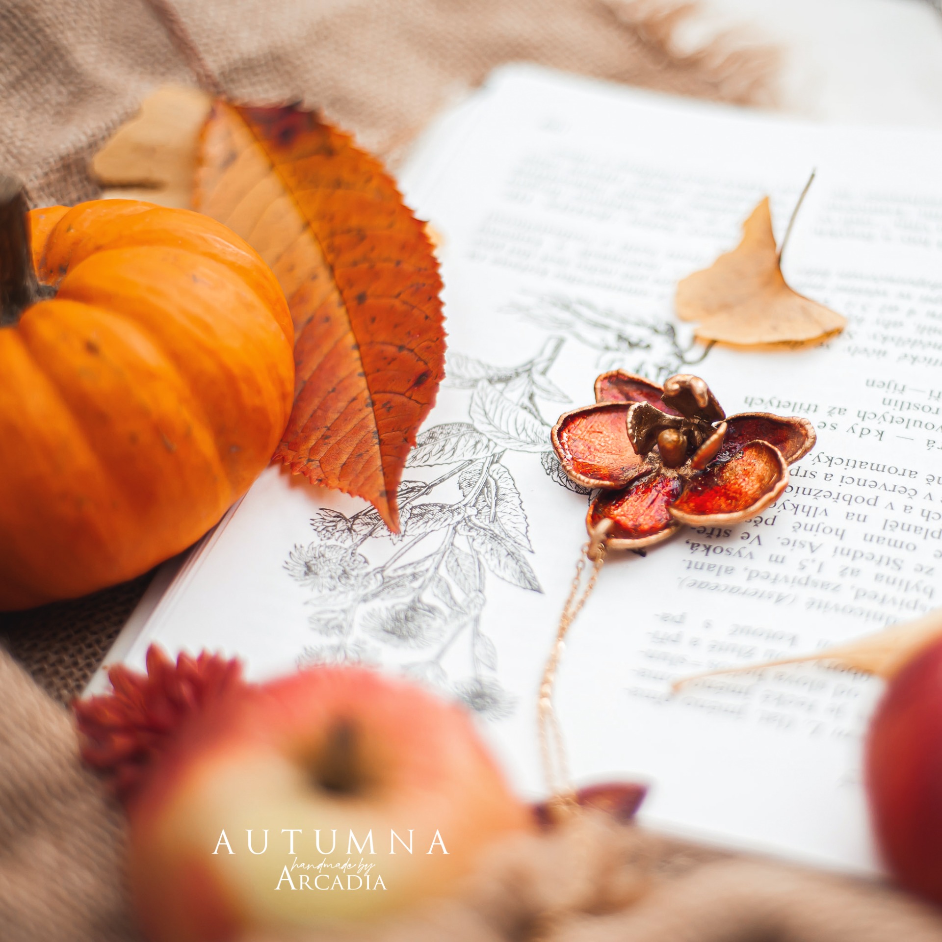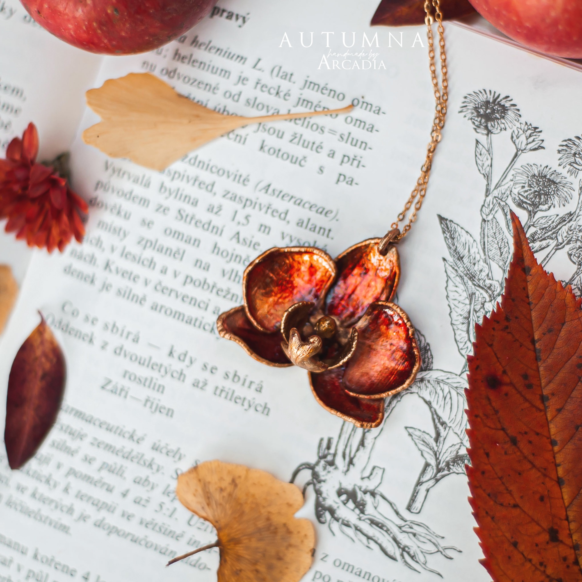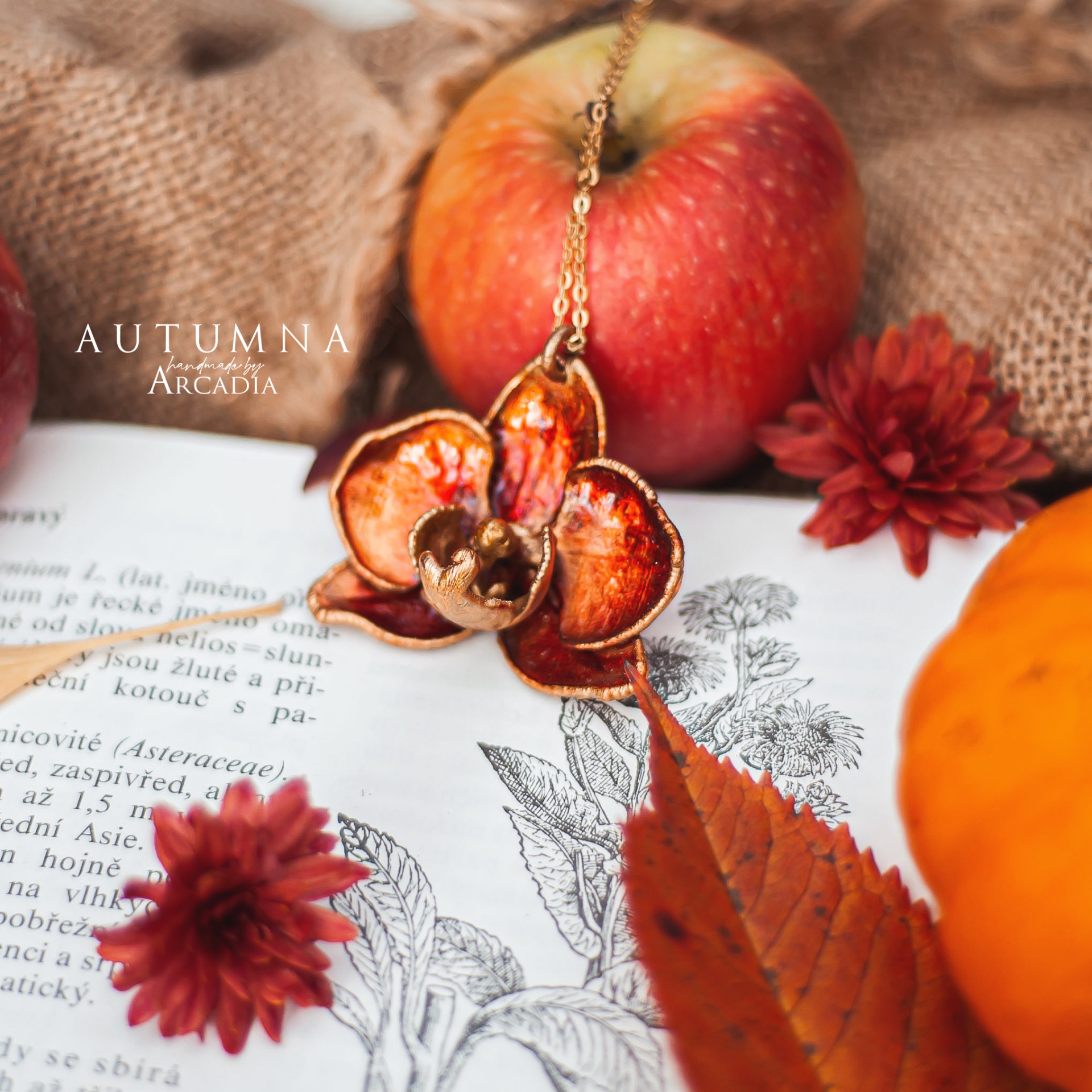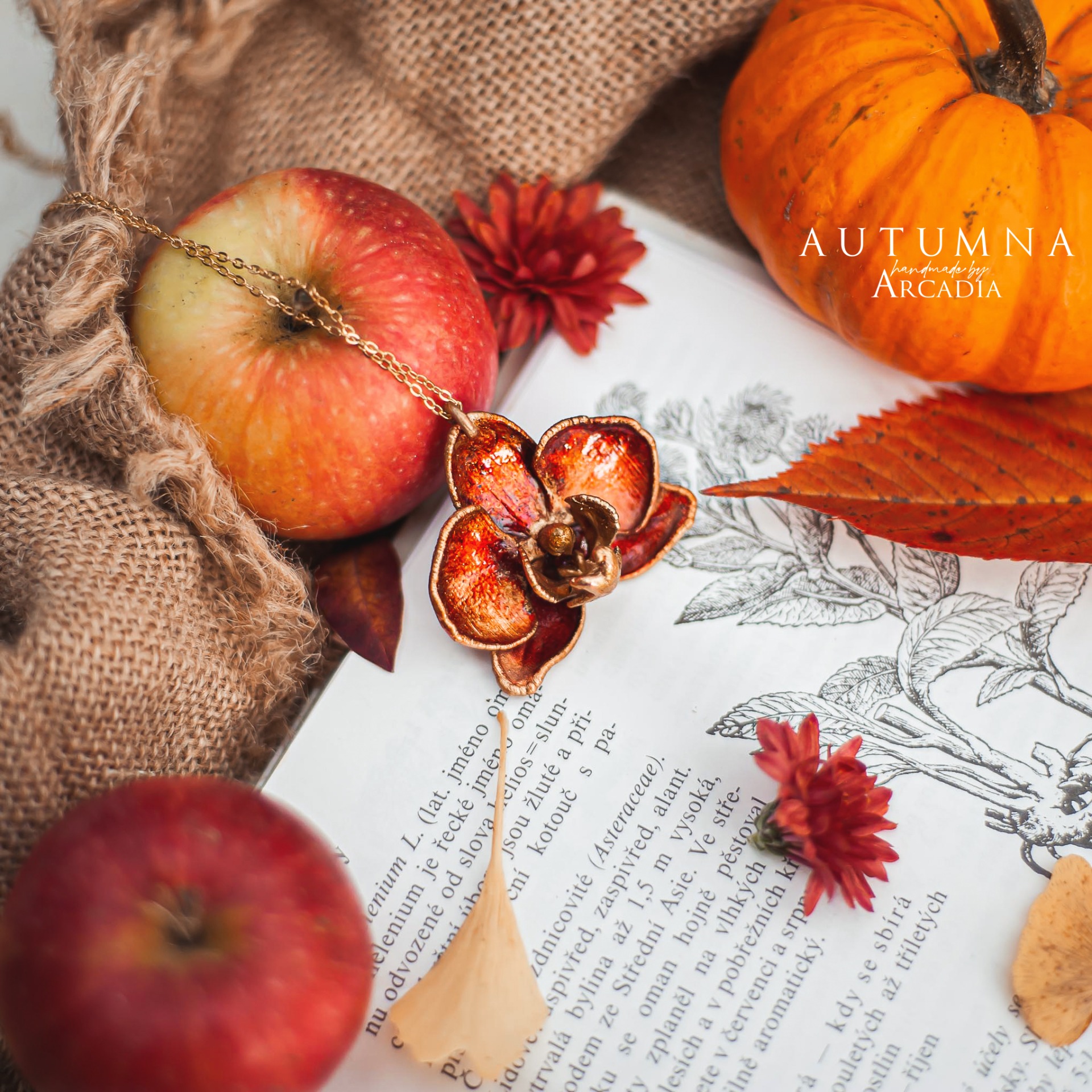 Náhrdelník s přívěskem ze skutečného pokoveného kvítku orchideje v podzimních tónech zlatavé a oranžové. Jemný pozlacený řetízek z nerezové oceli. Vyrobeno rukama a srdcem v alchymistické dílně na severu Čech.