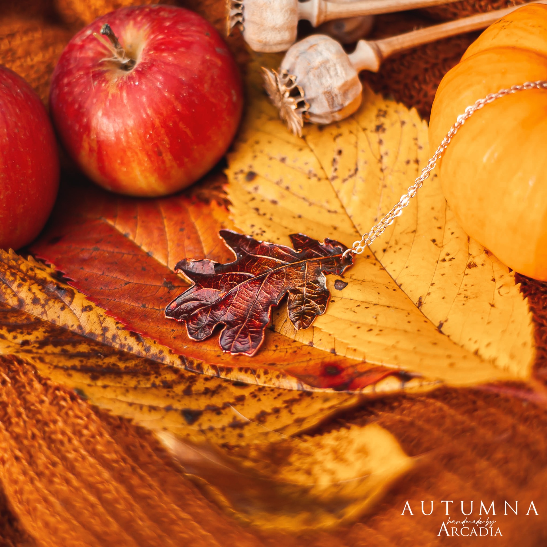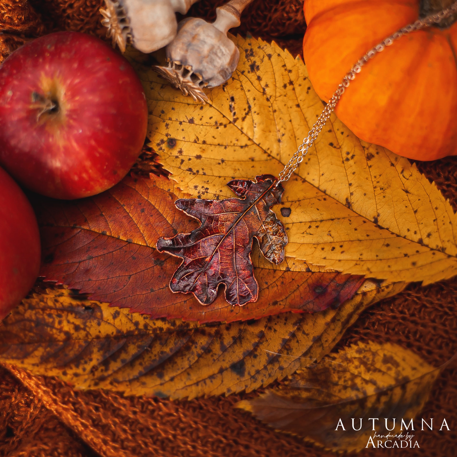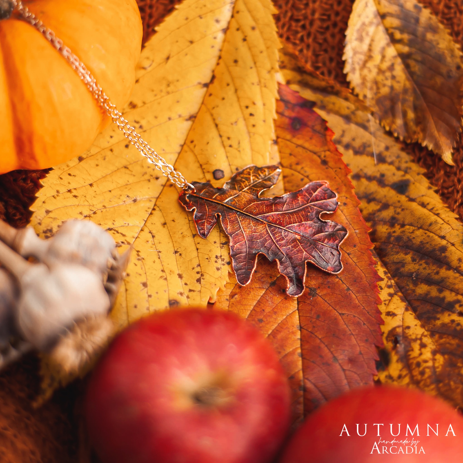 Náhrdelník s přívěskem ze skutečného pokoveného lístku dubu v podzimních odstínech. Jemný rosegold řetízek. Vyrobeno rukama a srdcem v alchymistické dílně na severu Čech.