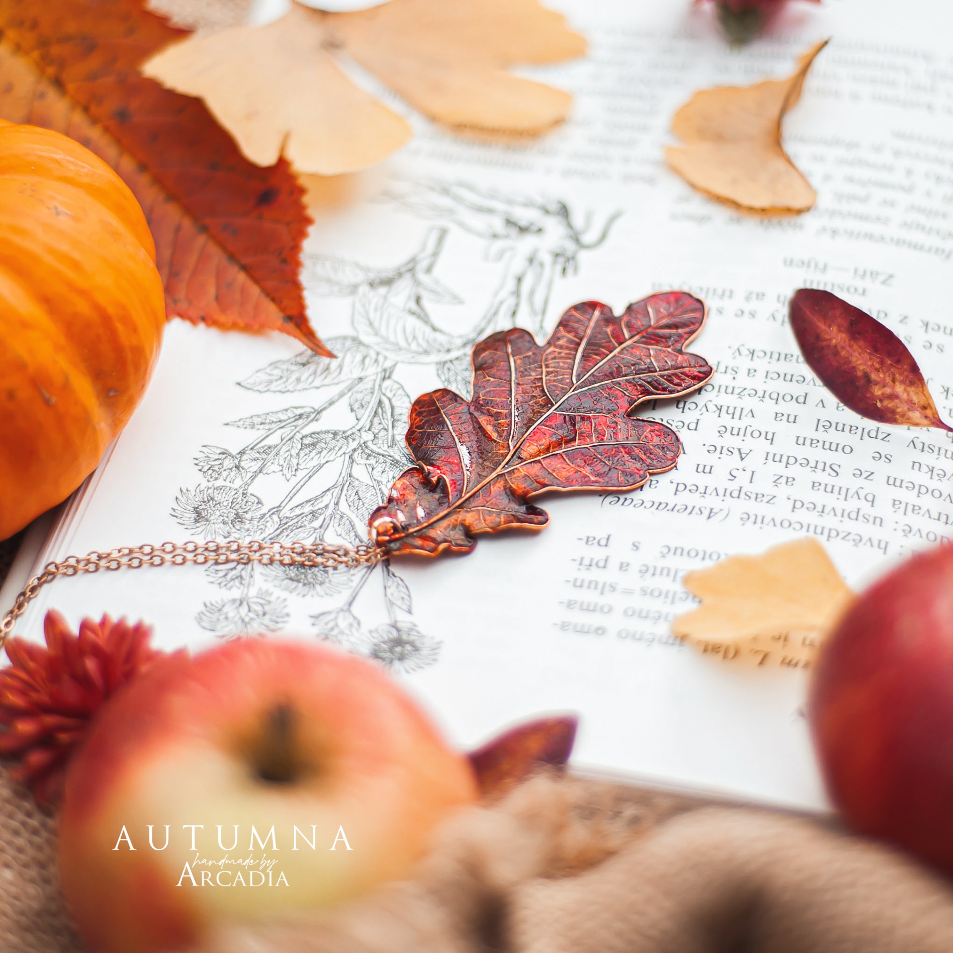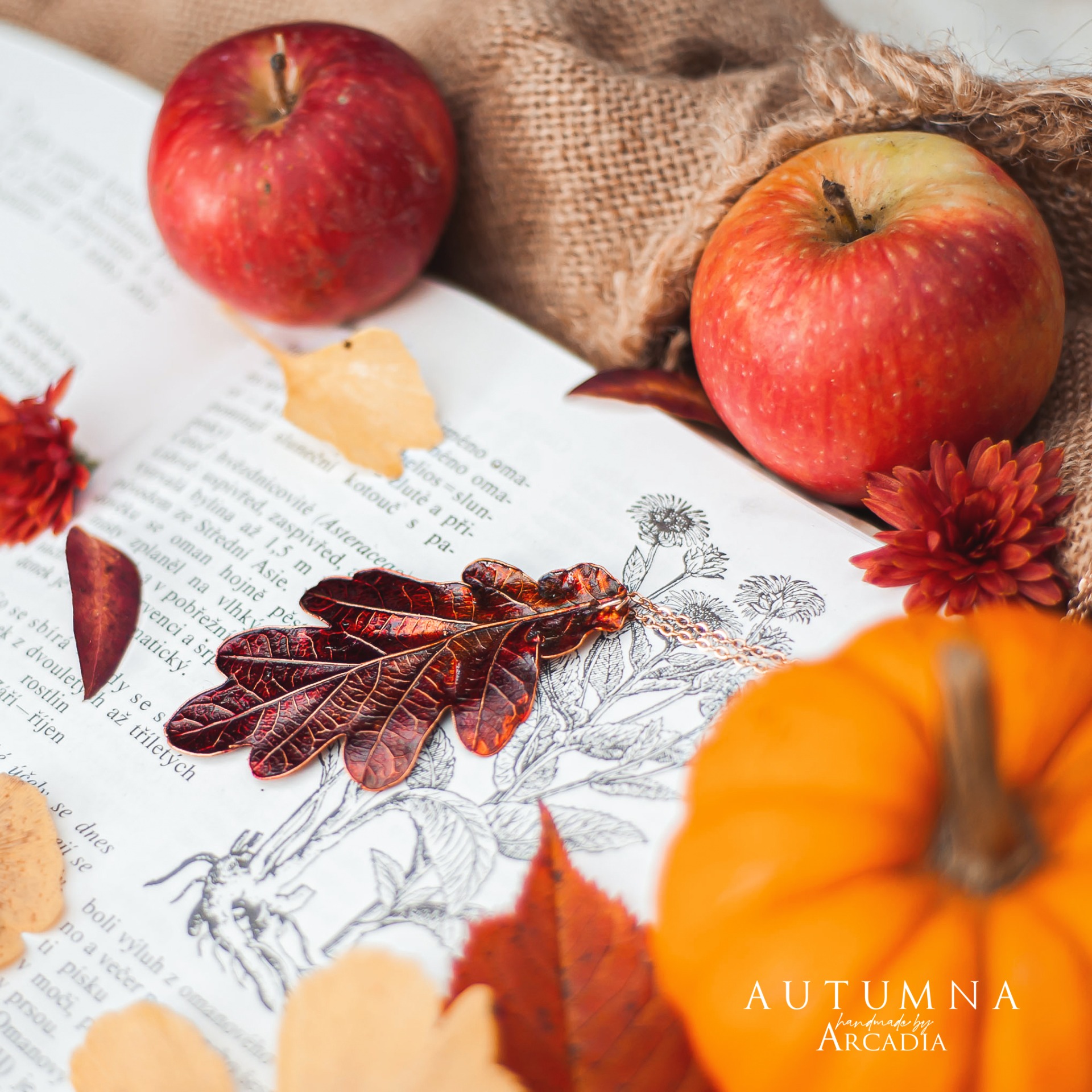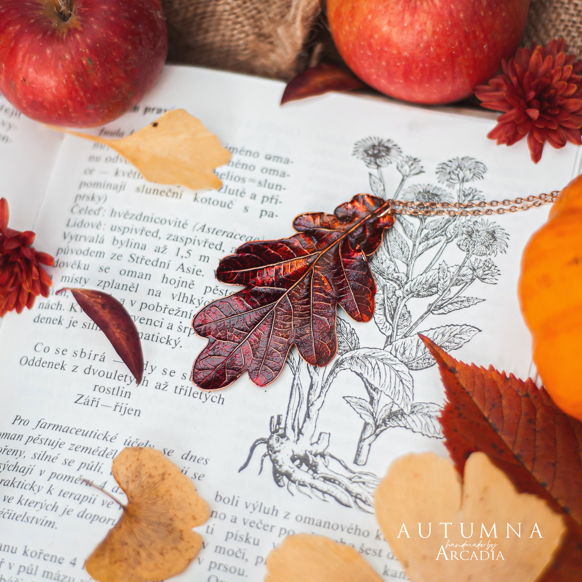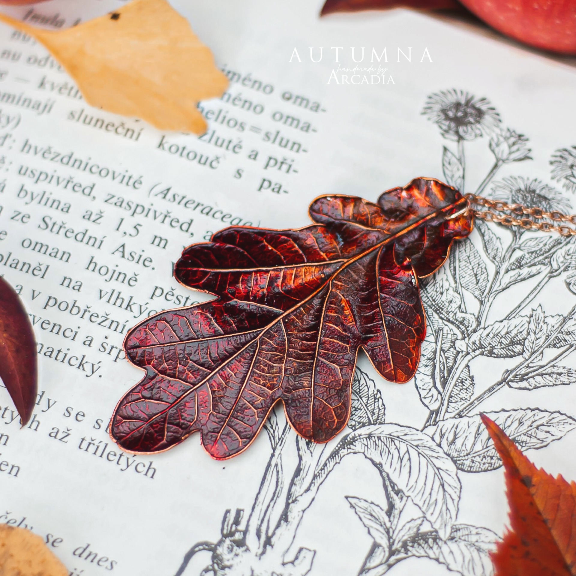 Náhrdelník s přívěskem ze skutečného pokoveného lístku dubu v podzimních tónech. Jemný rosegold řetízek z nerezové oceli. Vyrobeno rukama a srdcem v alchymistické dílně na severu Čech.