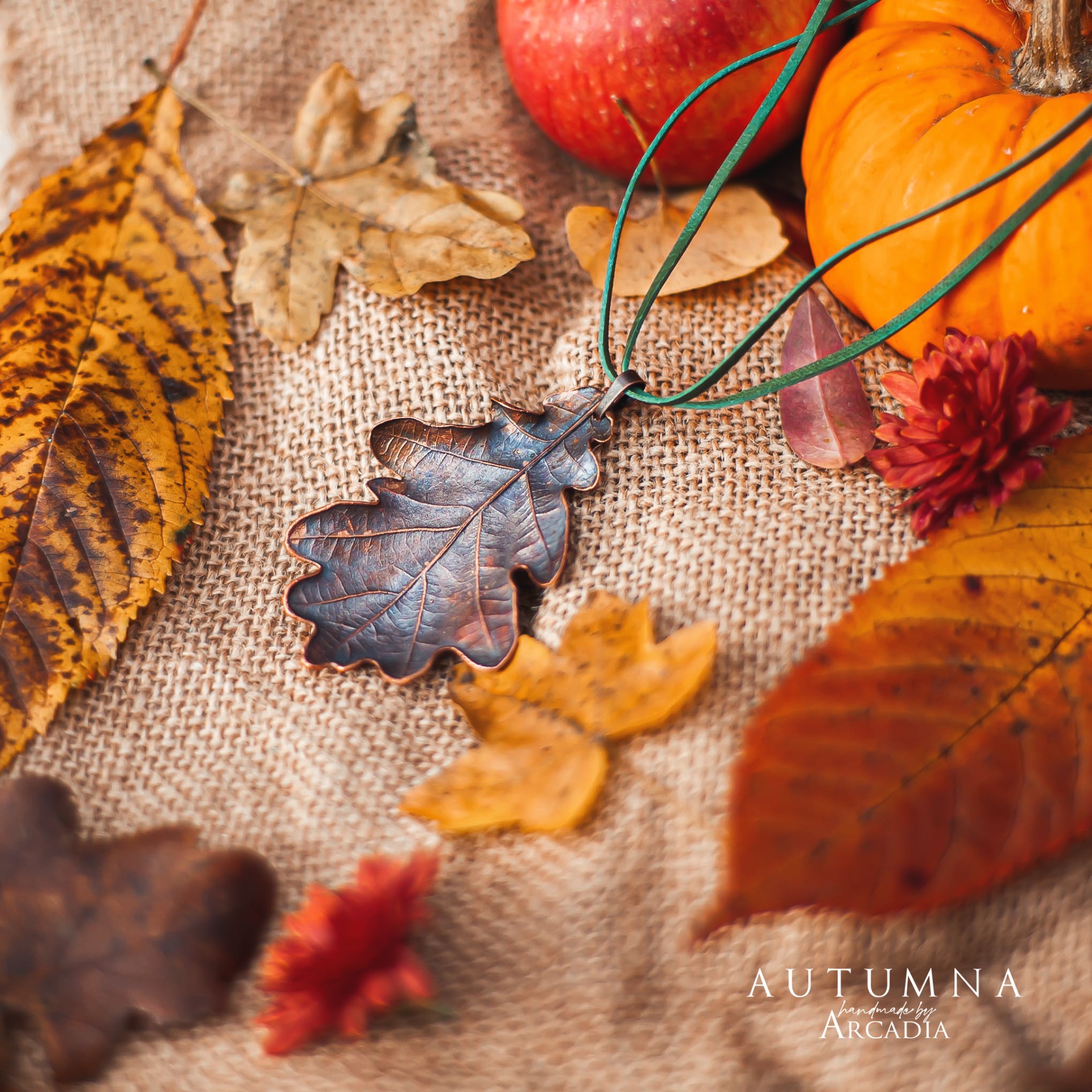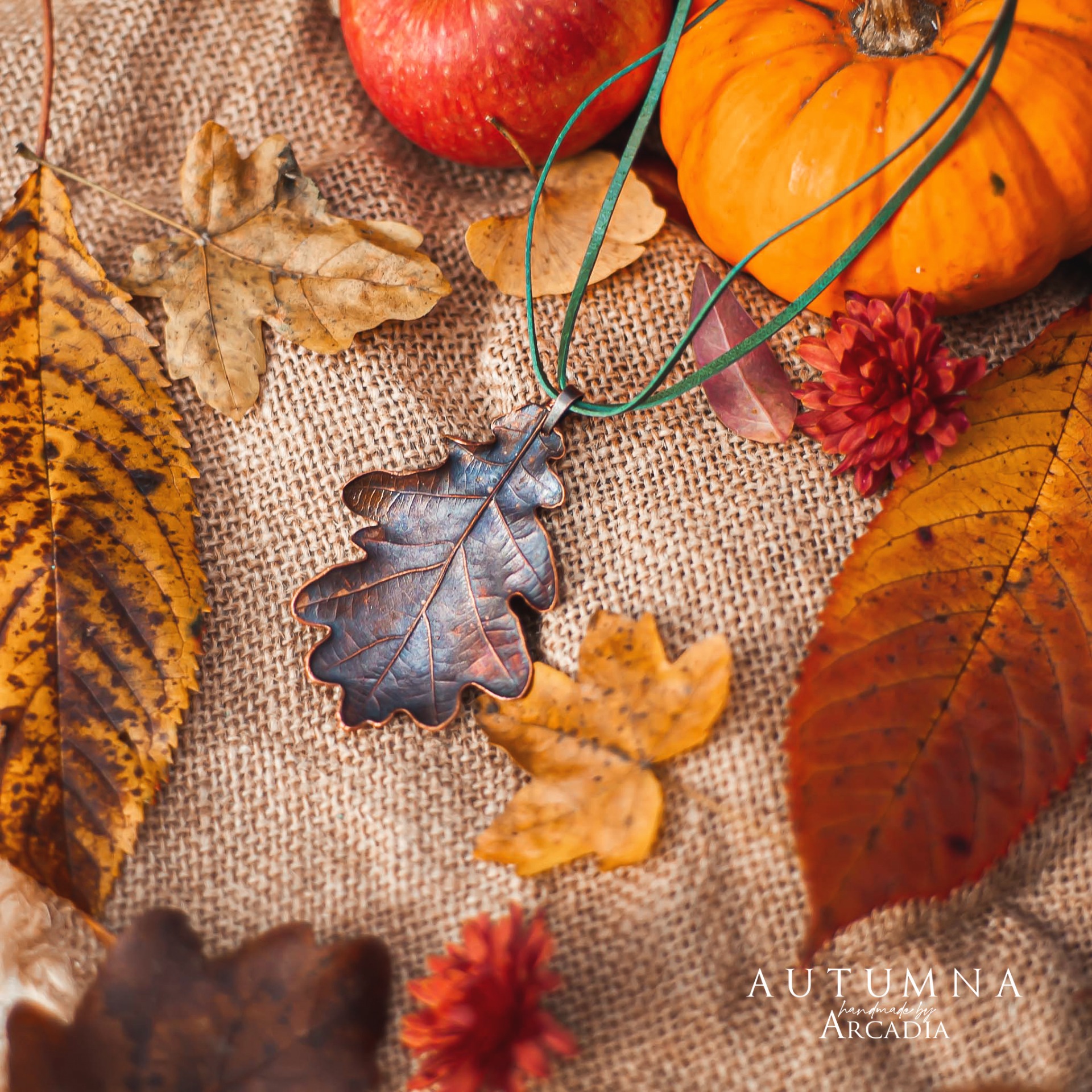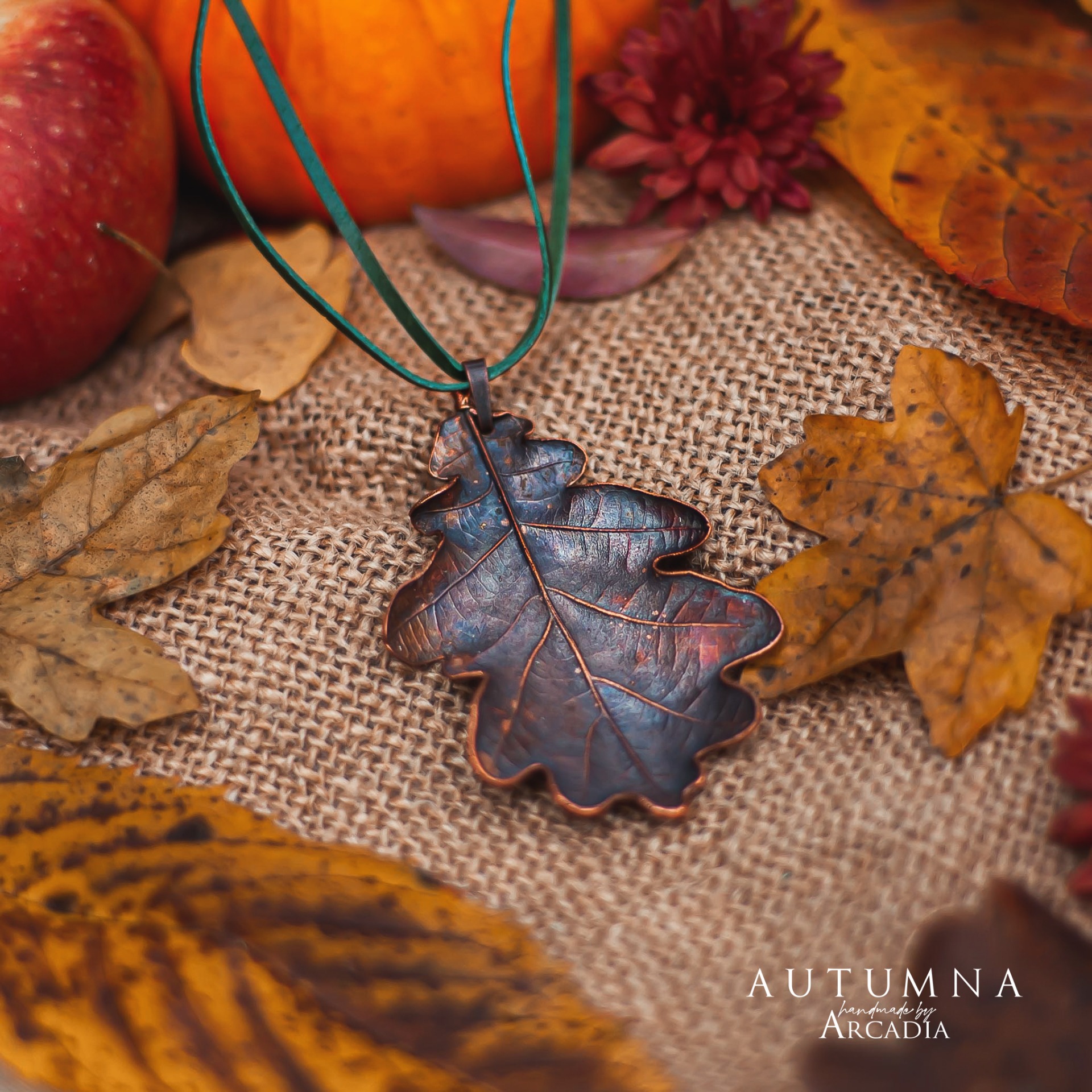 Náhrdelník s přívěskem ze skutečného pokoveného lístku dubu v rustikální patině. Dvojitý kožený řemínek se zapínáním v zelené barvě. Vyrobeno rukama a srdcem v alchymistické dílně na severu Čech.