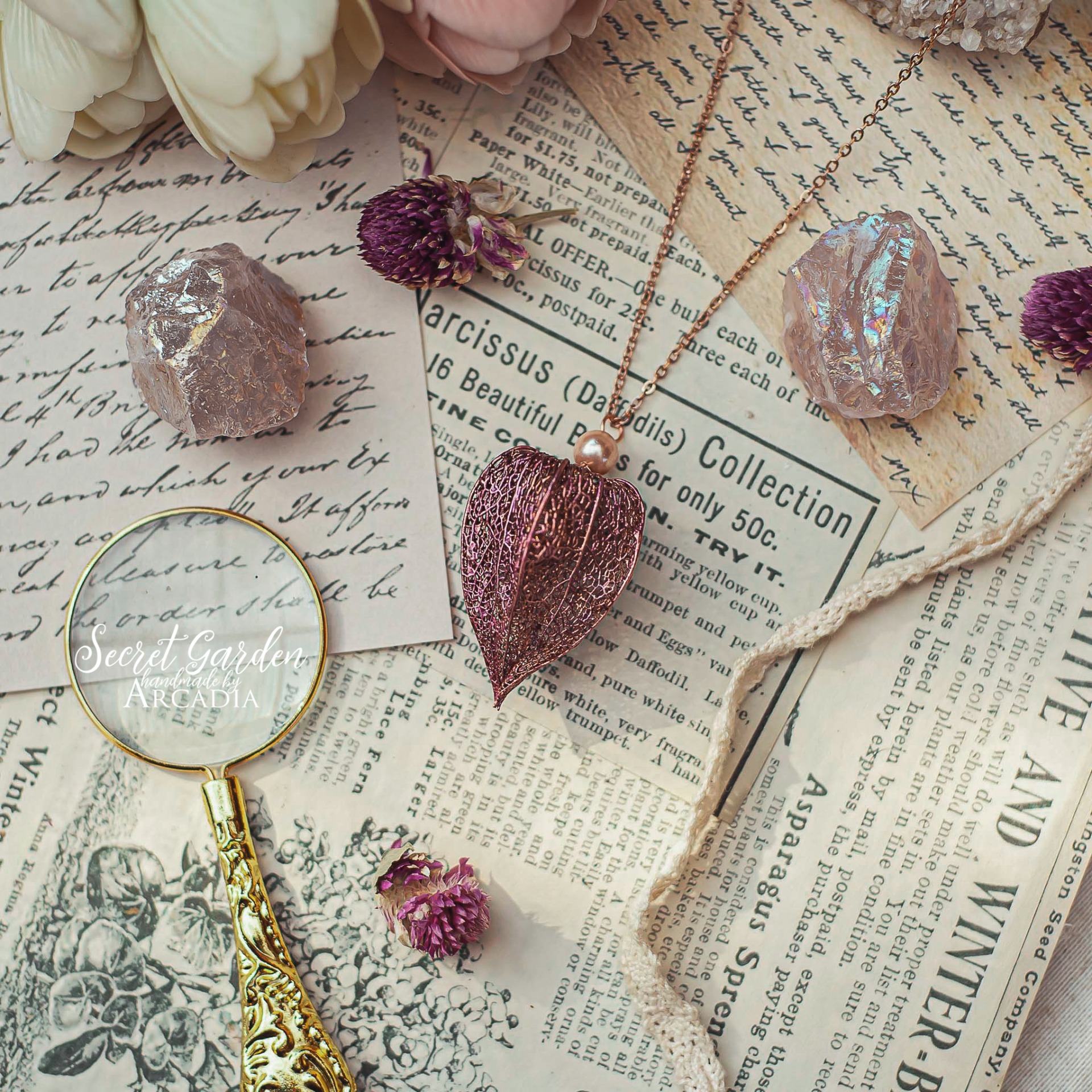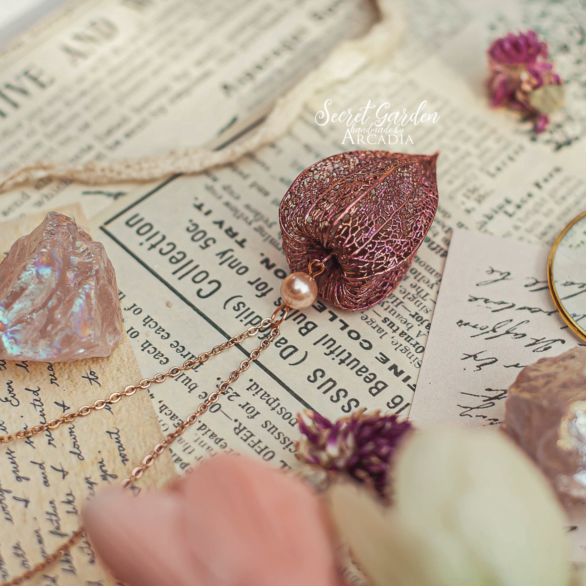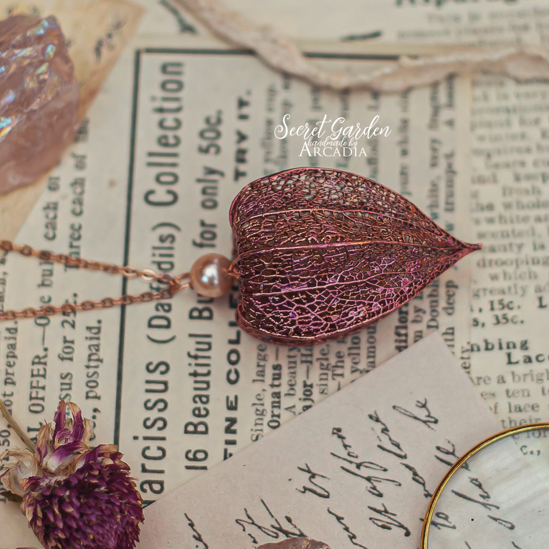 Náhrdelník s přívěskem ze skutečného pokoveného skeletu mochyně neboli physalis v měňavě růžové s drobnou růžovou říční perličkou. Jemný rosegold řetízek z nerezové oceli. Vyrobeno rukama a srdcem v alchymistické dílně na severu Čech.