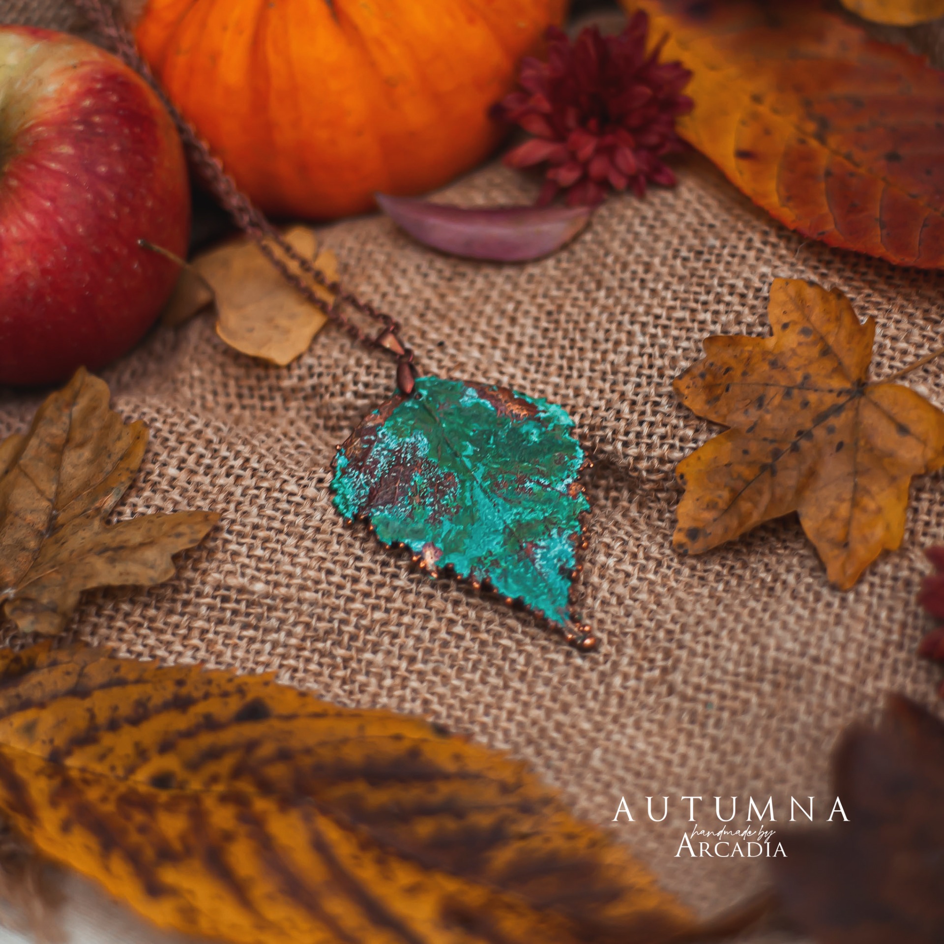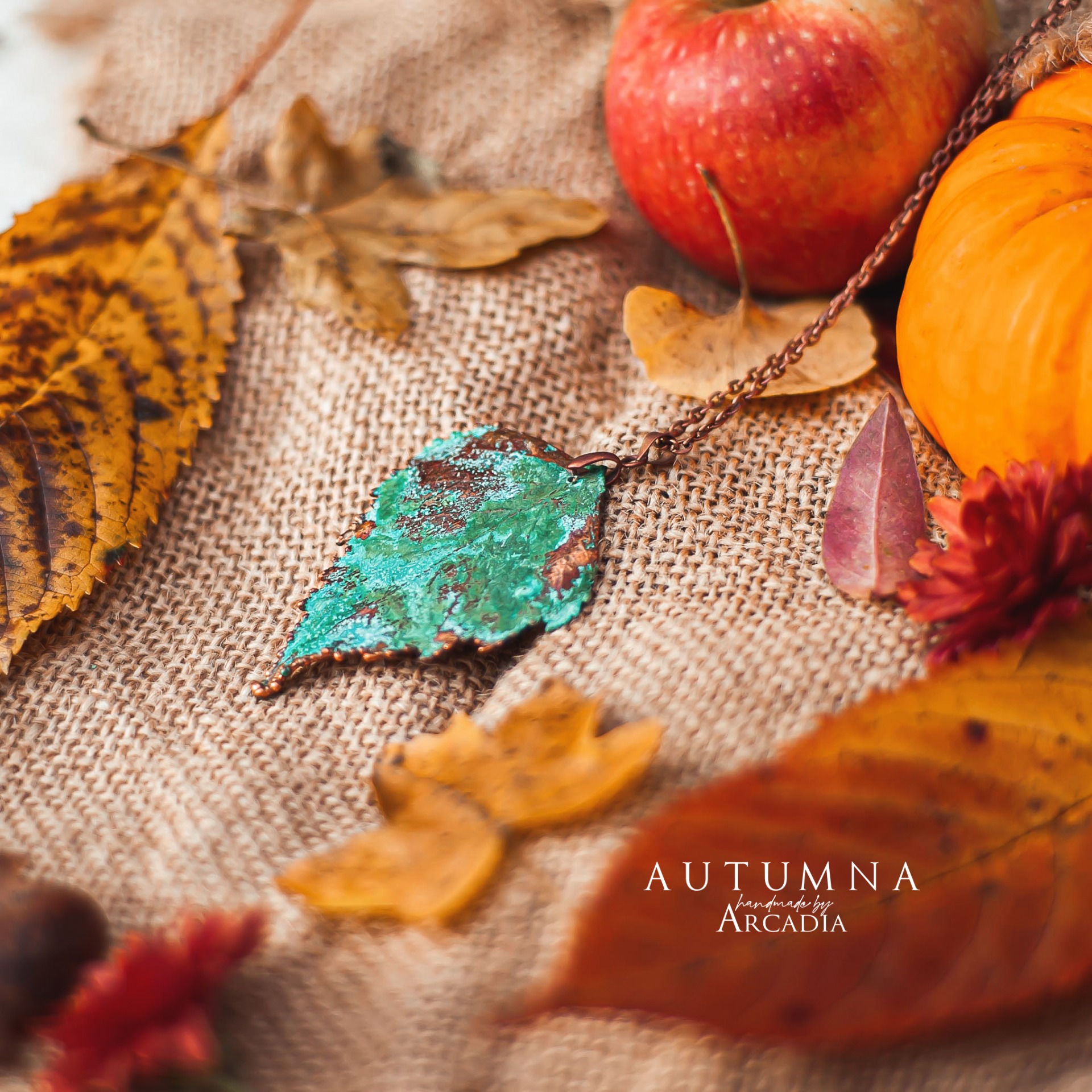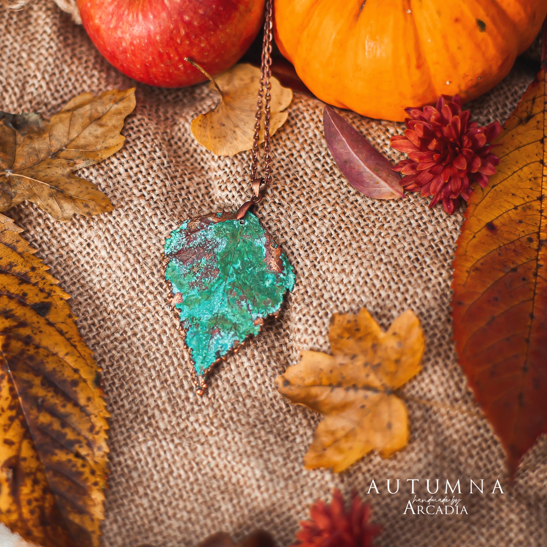 Náhrdelník s přívěskem ze skutečného pokoveného lístku břízy v modrozelené tiffany patině. Jemný staroměděný řetízek. Vyrobeno rukama a srdcem v alchymistické dílně na severu Čech.