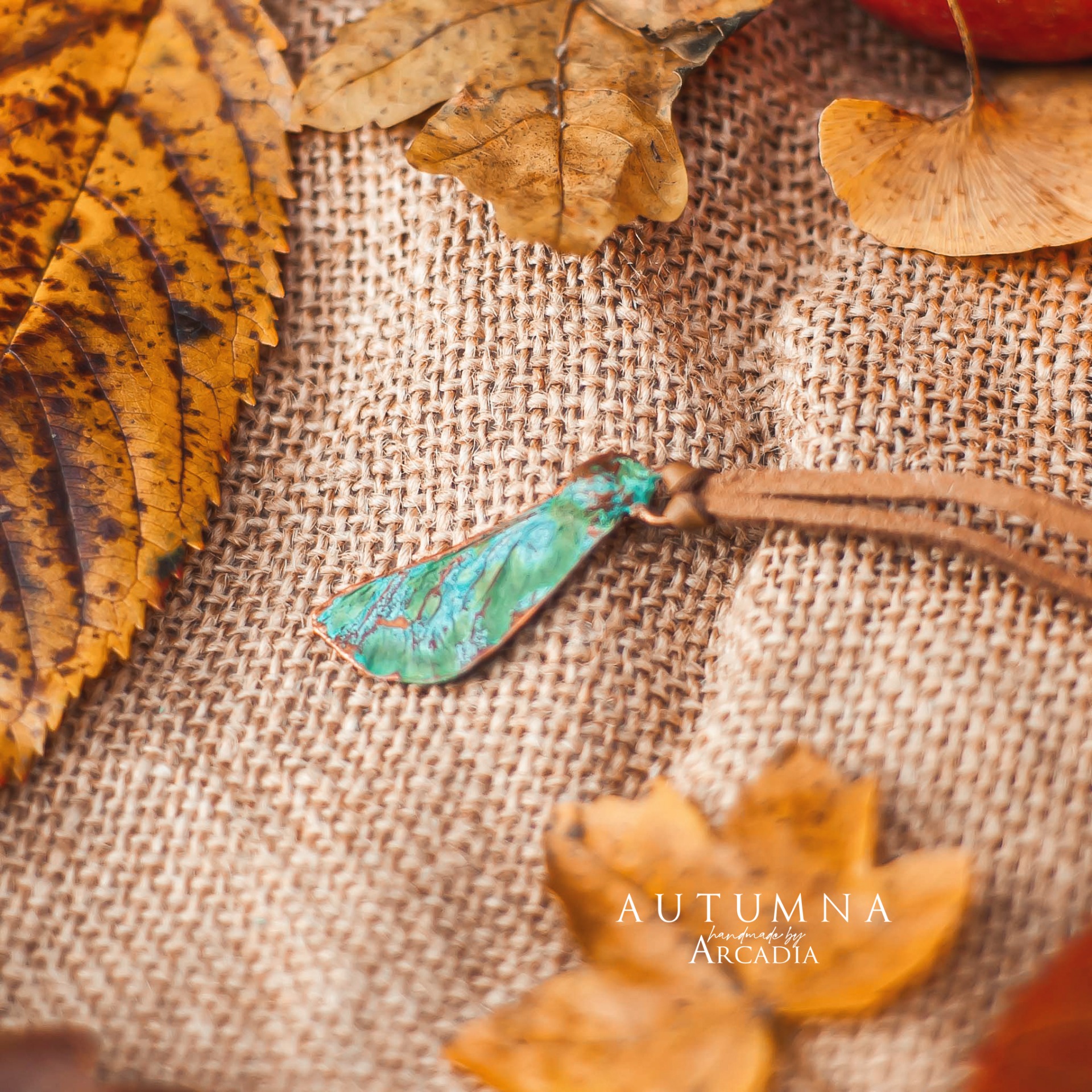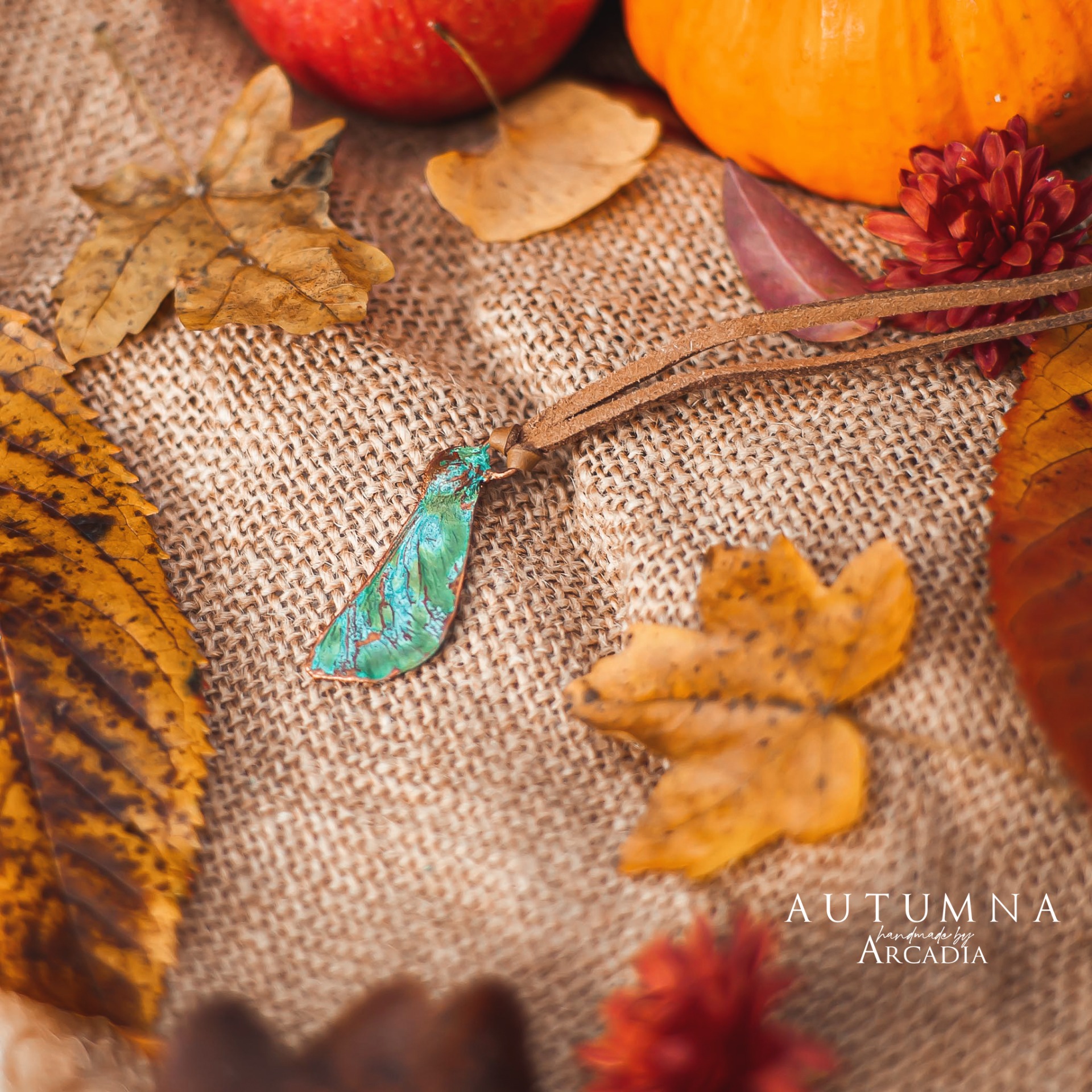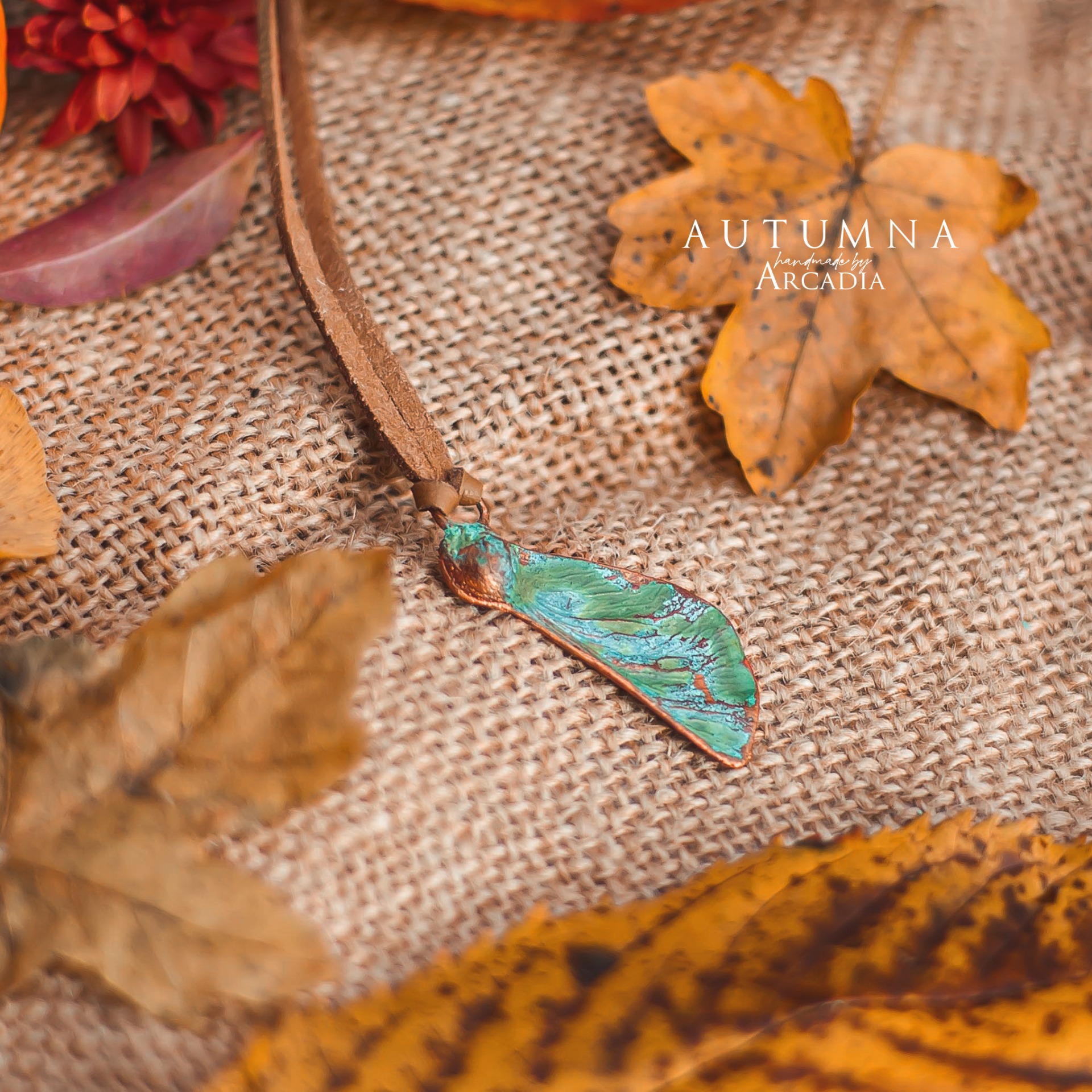 Náhrdelník s přívěskem ze skutečné pokovené javorové nažky v modrozelené tiffany patině na hnědém řemínku z umělé kůže. Vyrobeno rukama a srdcem v alchymistické dílně na severu Čech.