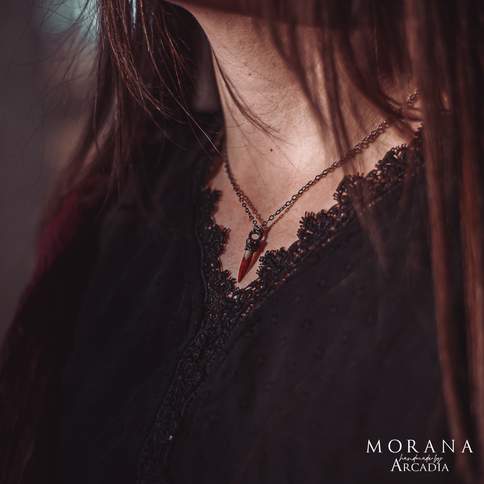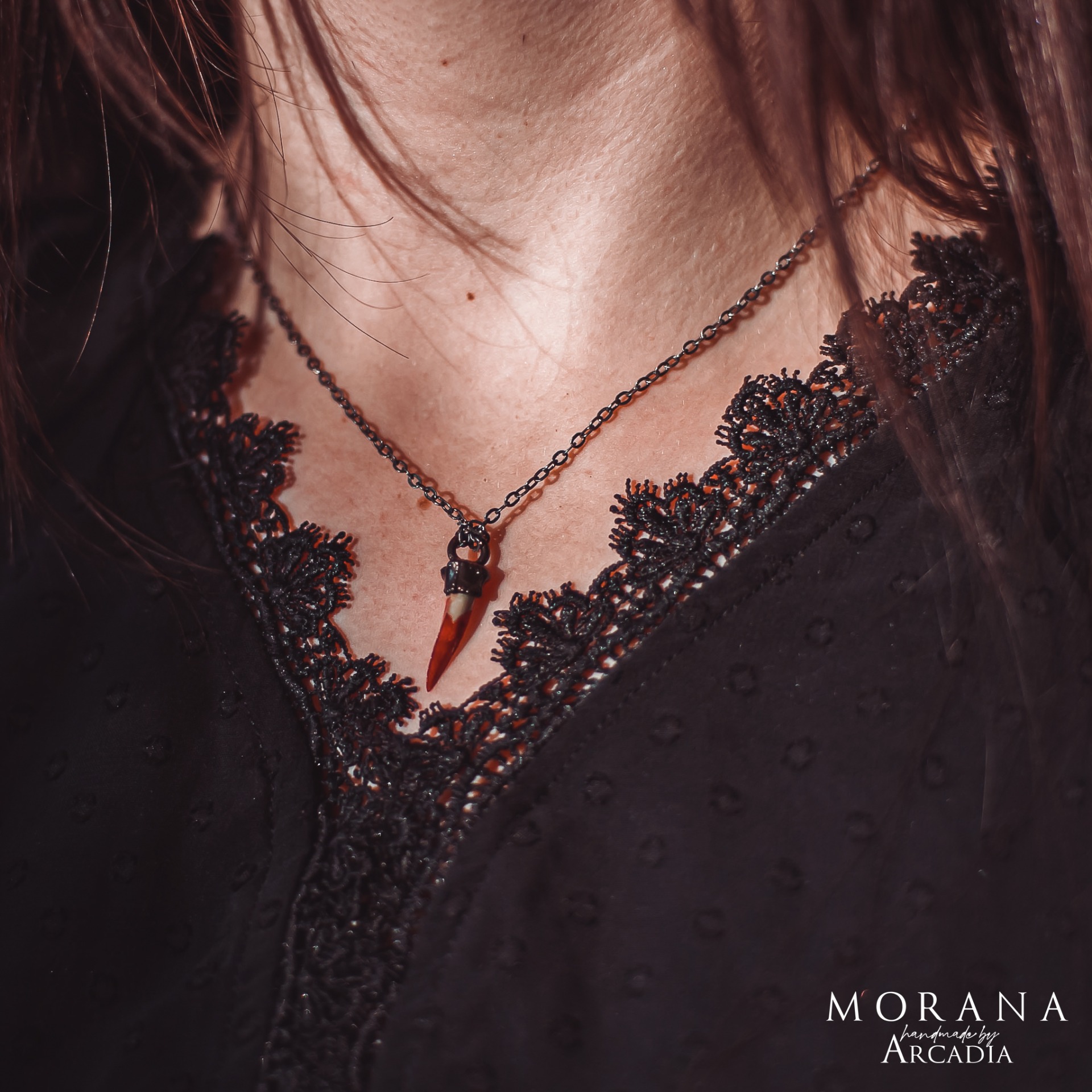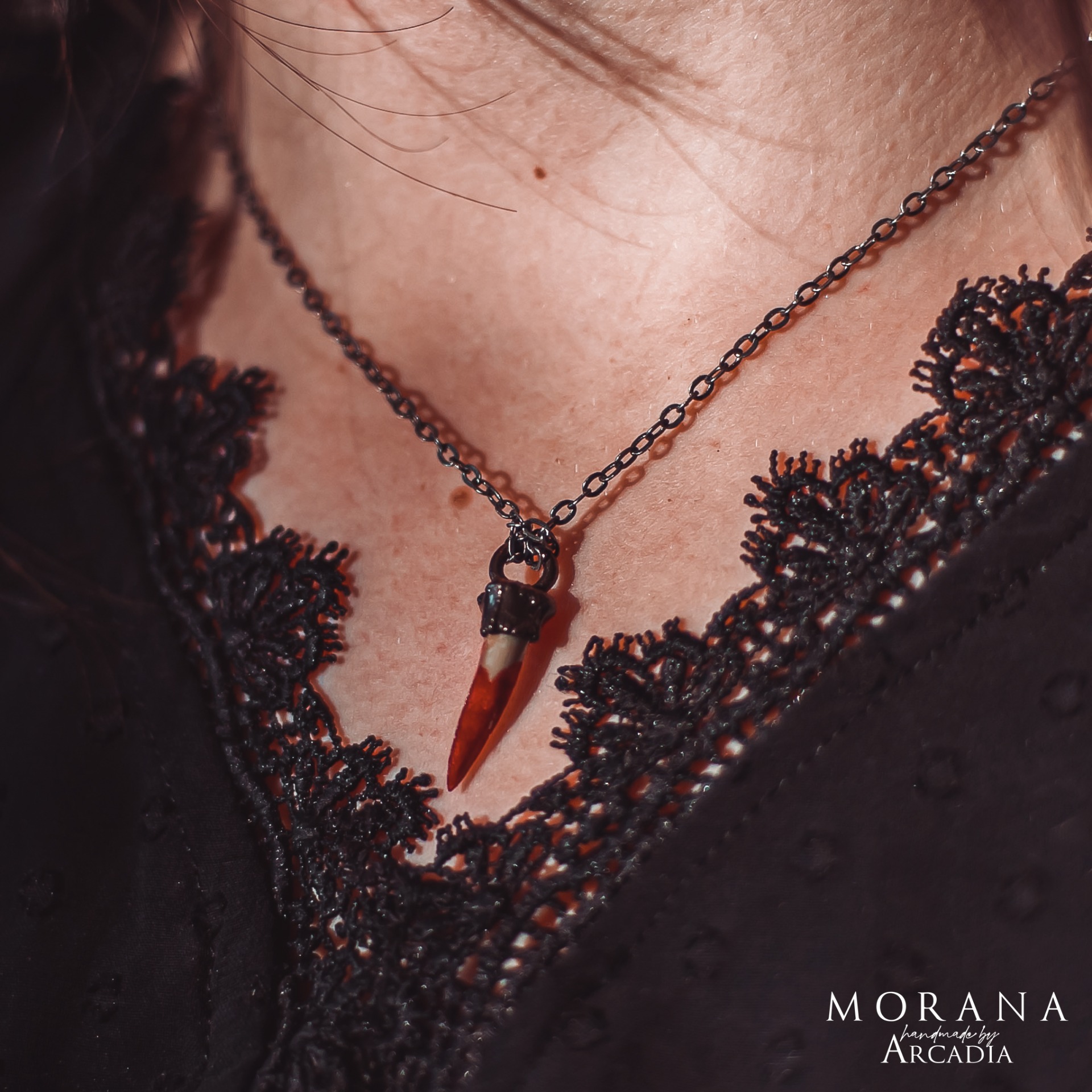 Náhrdelník se skutečným pokoveným upířím tesákem, na kterém ulpěla krev poslední oběti té nestvůry. No dobře, dělám si srandu. Ve skutečnosti je to zkamenělý tesák z prehistorického žraloka a to červený je inkoust. Ale to je taky dost hustý, ne? Jemný bižuterní řetízek. Vyrobeno rukama a srdcem v alchymistické dílně na severu Čech.