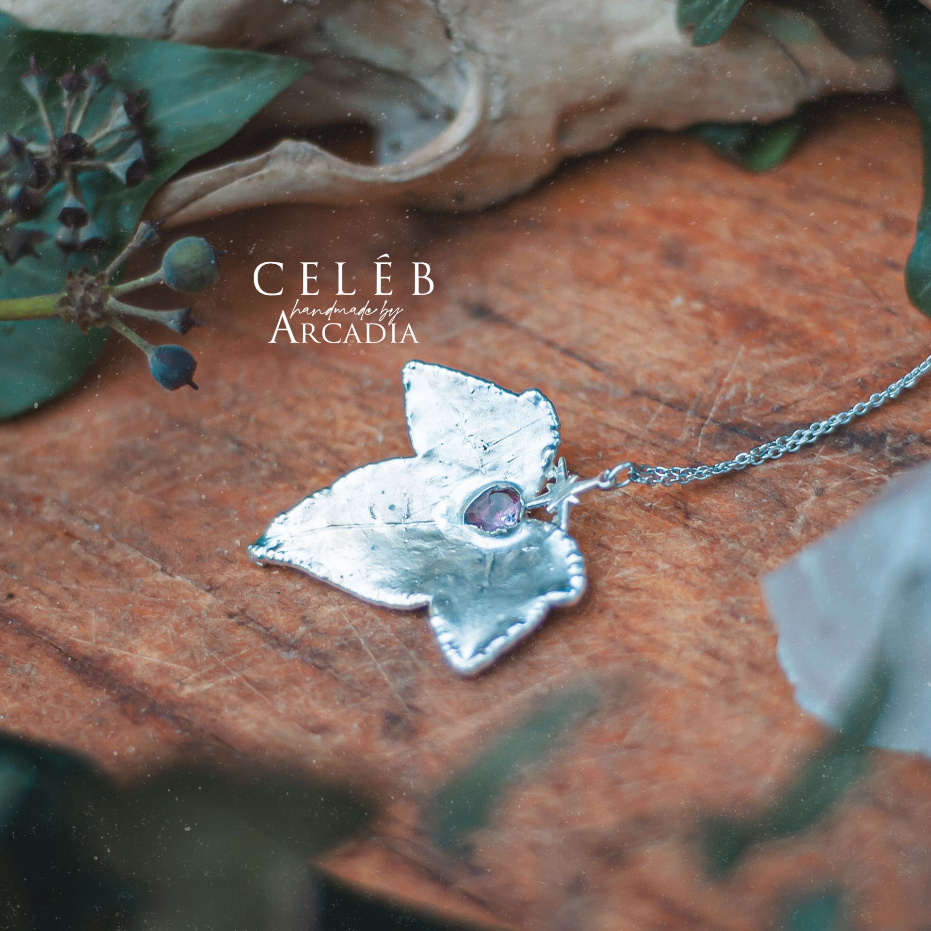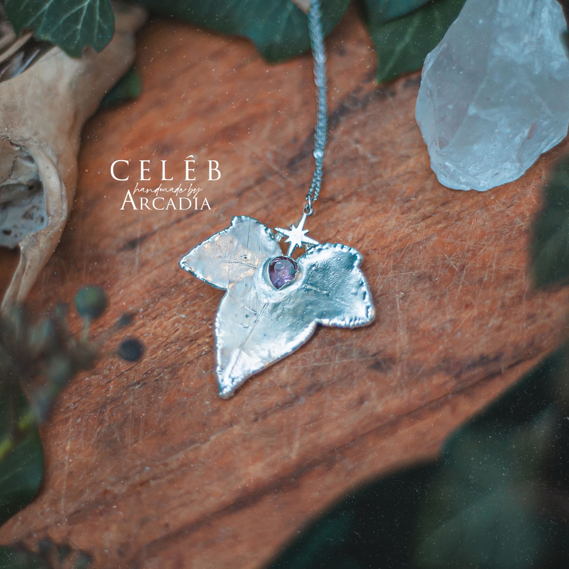 Náhrdelník se skutečnám pokoveným lístkem břečťanu s broušeným ametystem a severskou hvězdou. Jemný řetízek z nerezové oceli. Vyrobeno rukama a srdcem v alchymistické dílně na severu Čech.