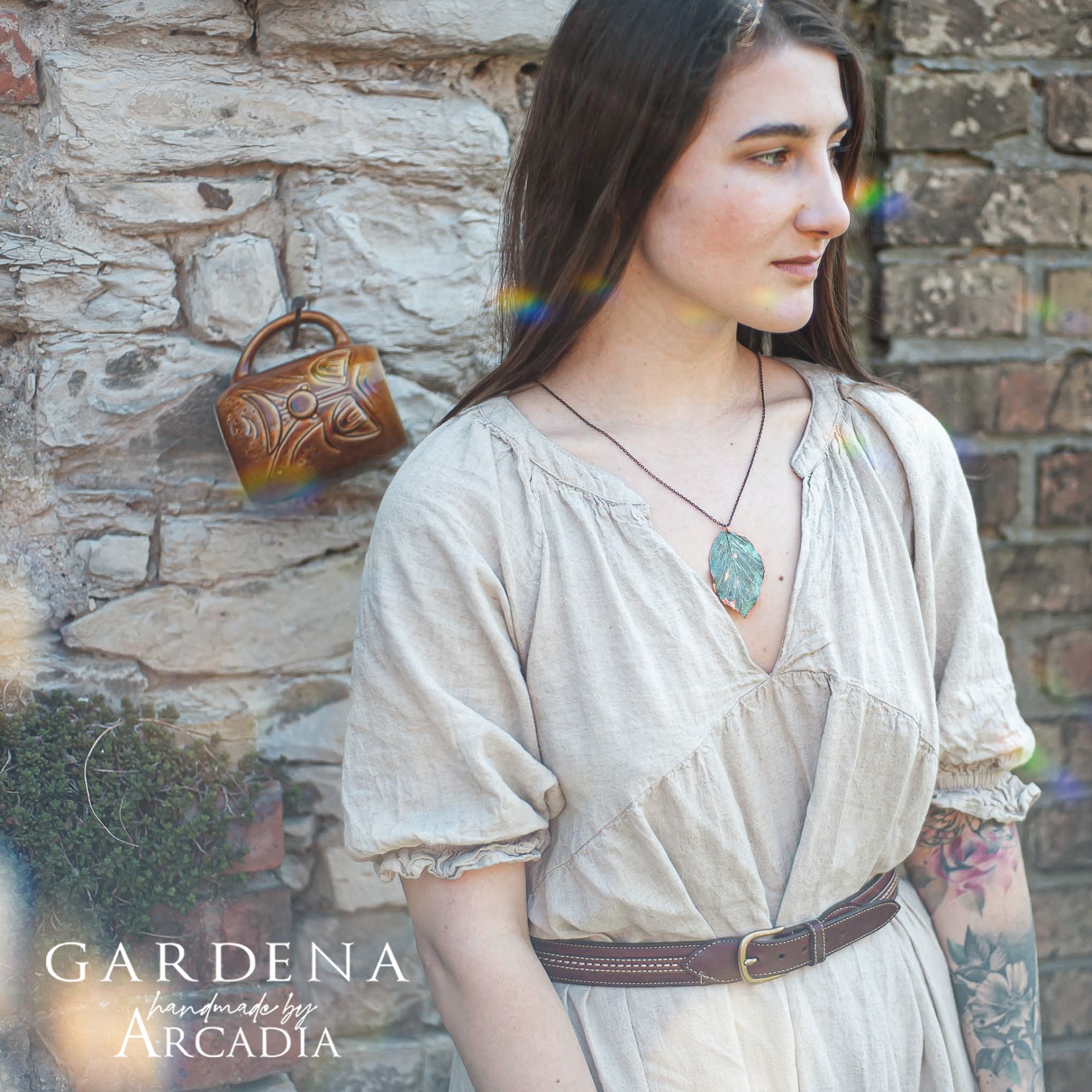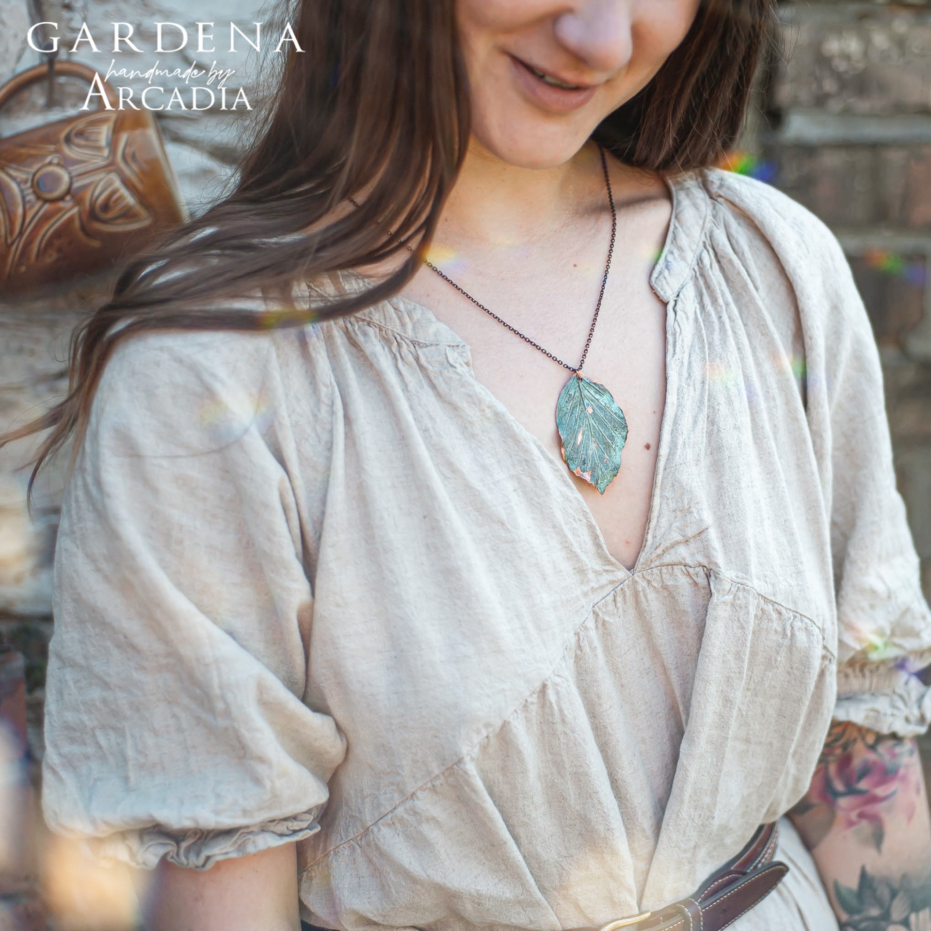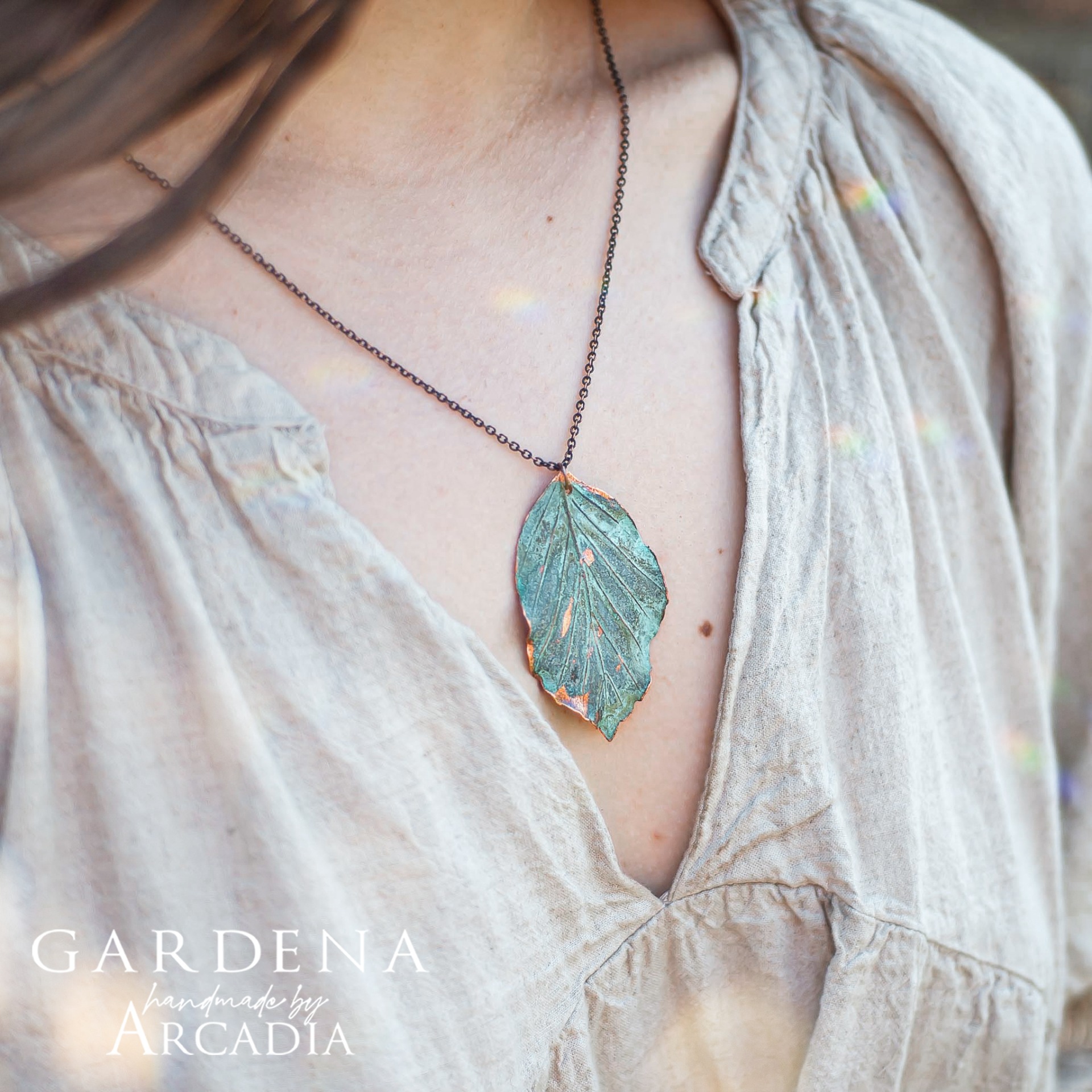 Náhrdelník s přívěskem ze skutečného pokoveného lístku buku v něžné tiffany zelenkavé patině na jemném staroměděném řetízku, vyrobeno rukama a srdcem v alchymistické dílně na severu Čech