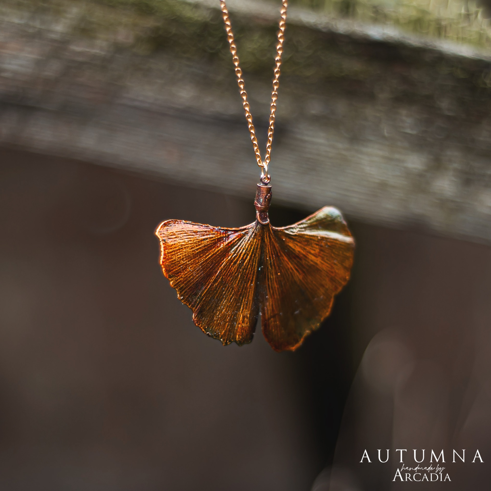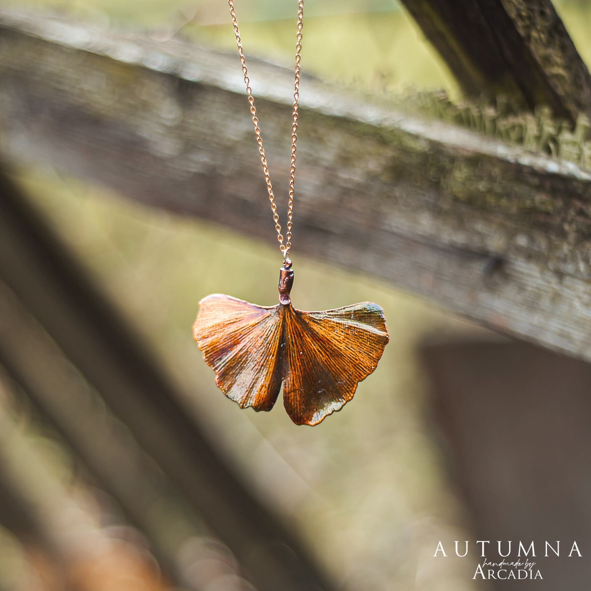 Náhrdelník s přívěskem ze skutečného pokoveného lístku ginka v přirozených tónech žluté a zelenkavé. Jemný řetízekv barvě žlutého zlata. Vyrobeno rukama a srdcem v alchymistické dílně na severu Čech.