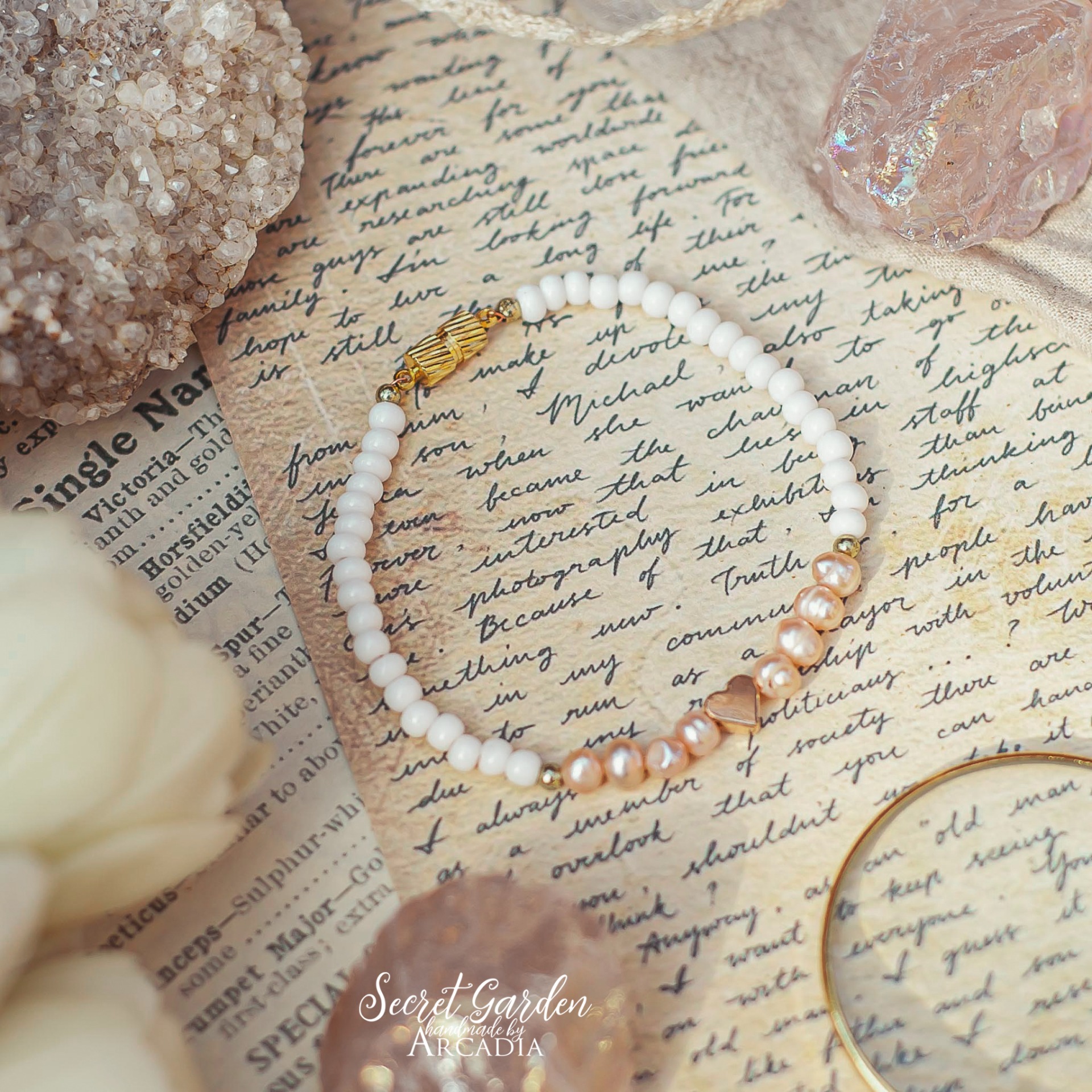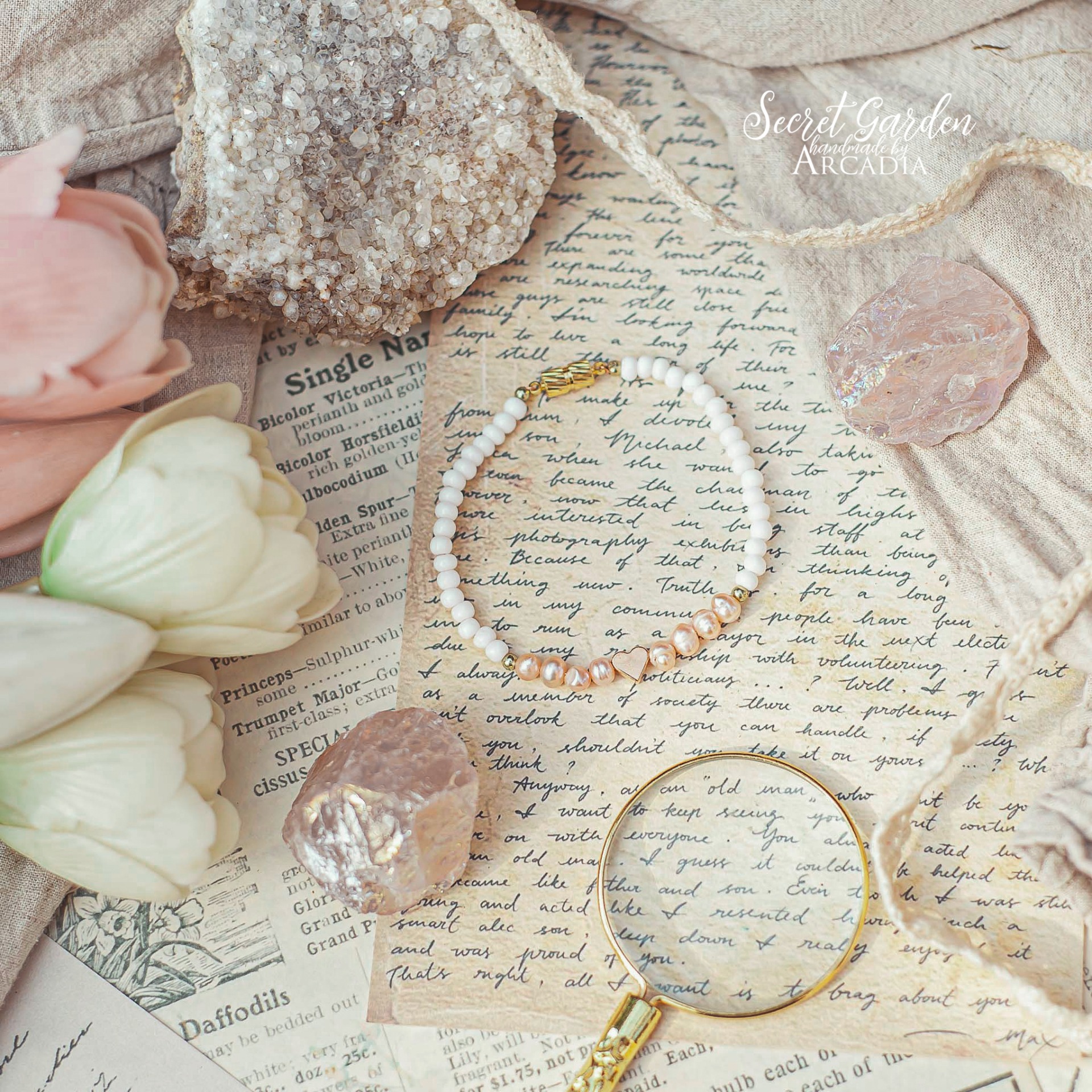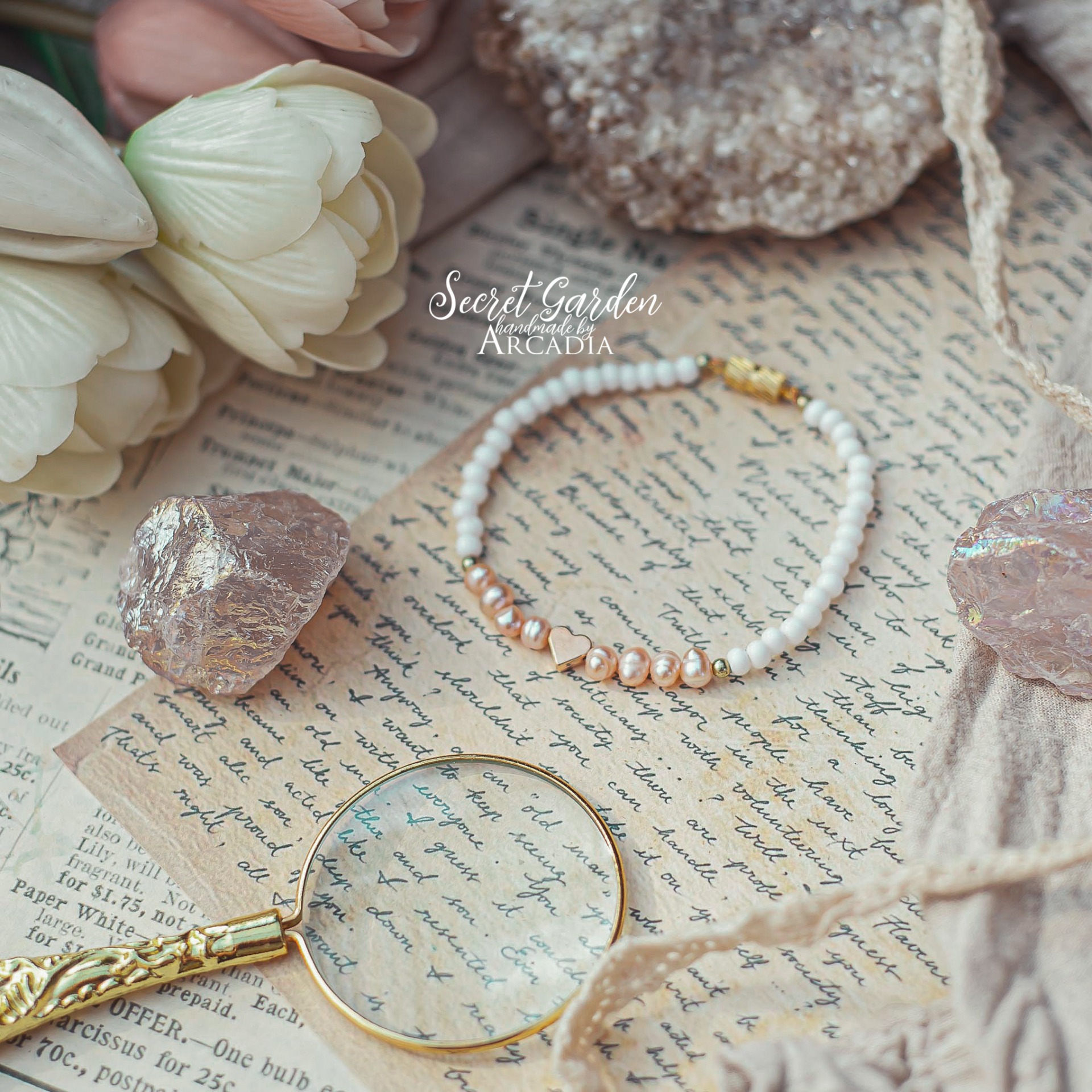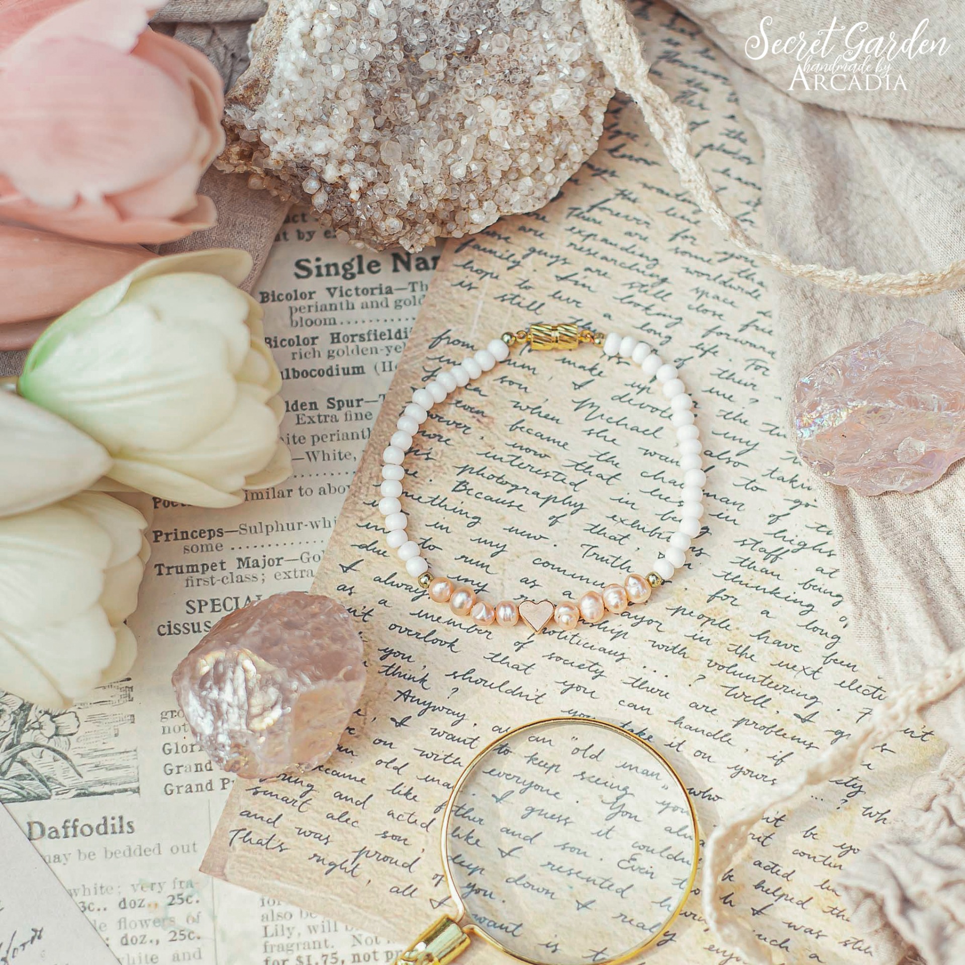 Náramek z bílých korálků z českého skla, růžovými říčními perličkami a malým rosegold srdíčkem. Praktické magnetické zapínání. Vyrobeno rukama a srdcem v alchymistické dílně na severu Čech.
