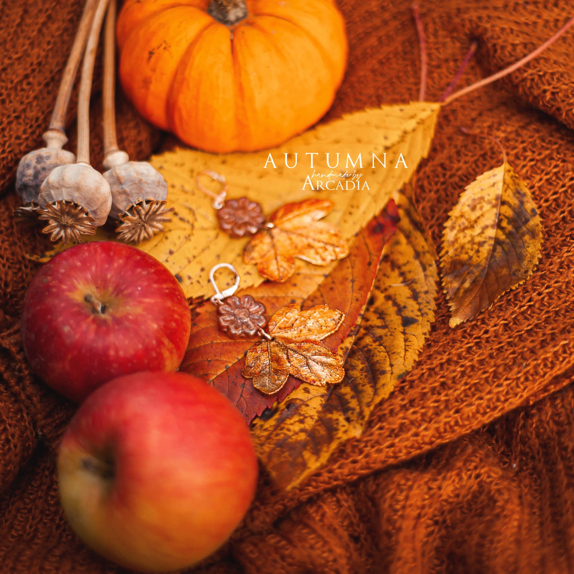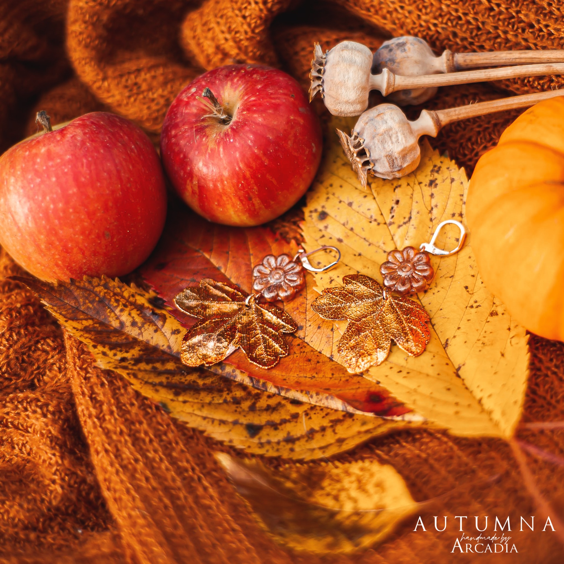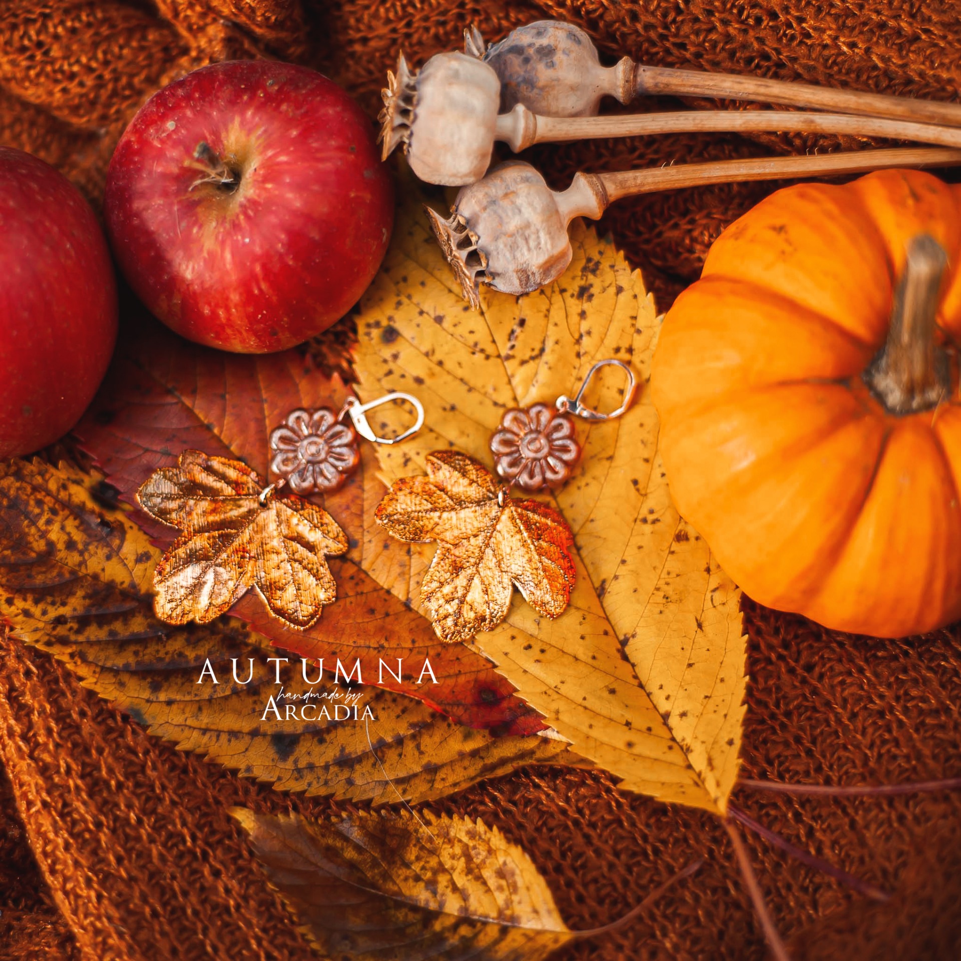 Náušnice ze skutečných pokovených lístků javoru babyky v odstínu zlatavé a žluté, ozdobené českými skleněnými korálky. Zavírací náušnicové háčky z pozlacené nerezové oceli. Vyrobeno rukama a srdcem v alchymistické dílně na severu Čech.