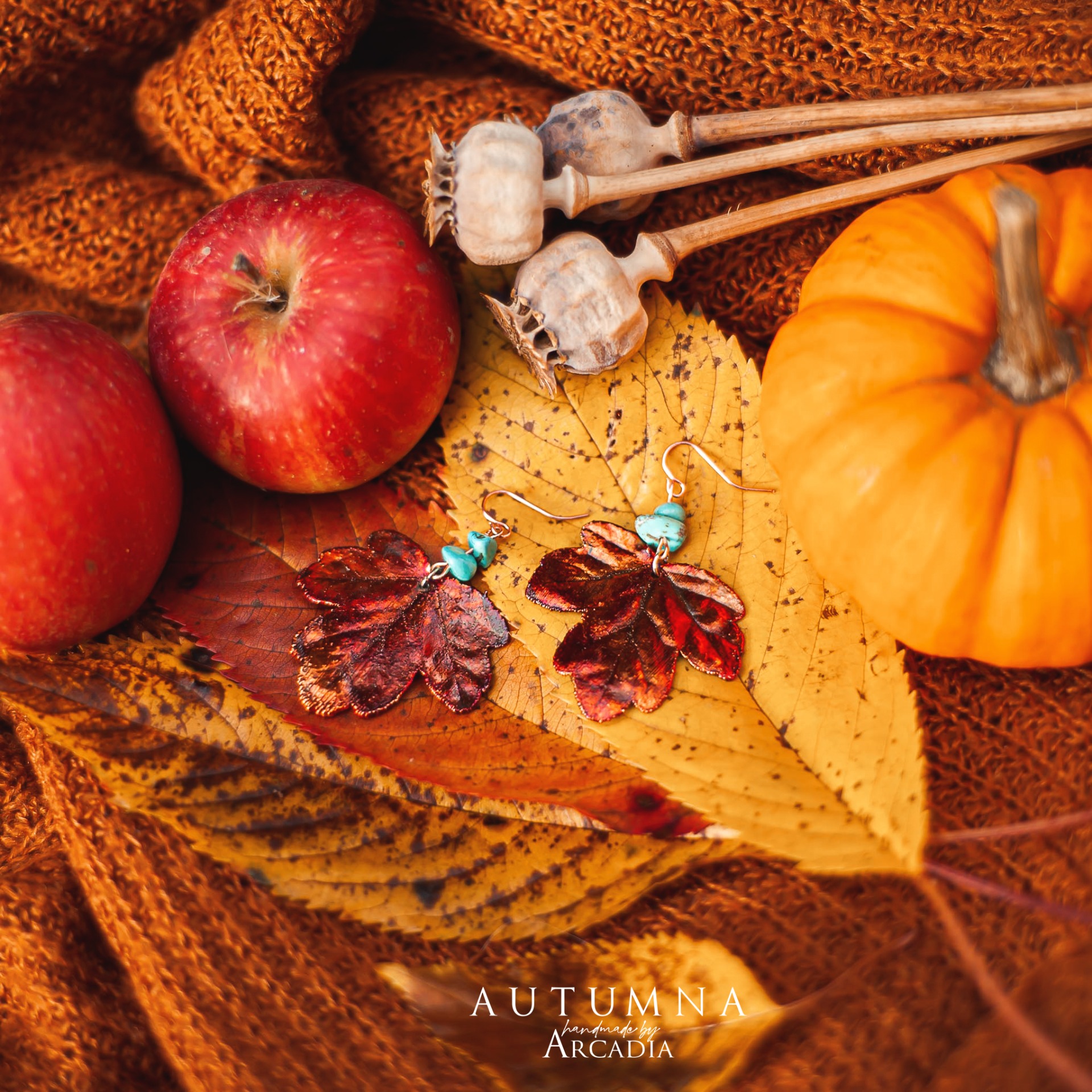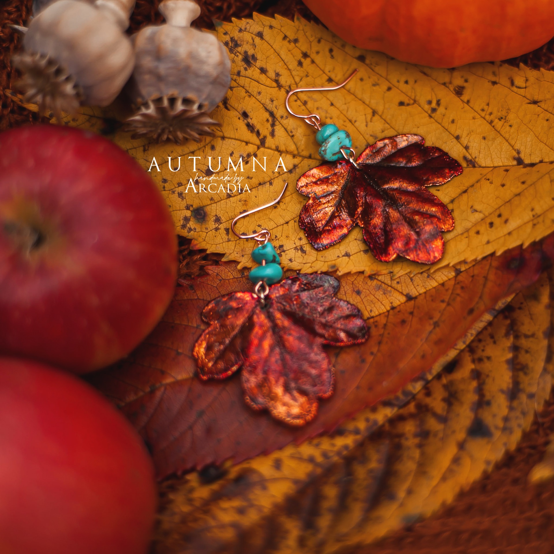 Náušnice ze skutečných pokovených lístků javoru babyky v odstínu ohnivé rudé, ozdobené českými korálky tyrkenitu. Náušnicové háčky z nerezové oceli pokovené růžovým zlatem. Vyrobeno rukama a srdcem v alchymistické dílně na severu Čech.