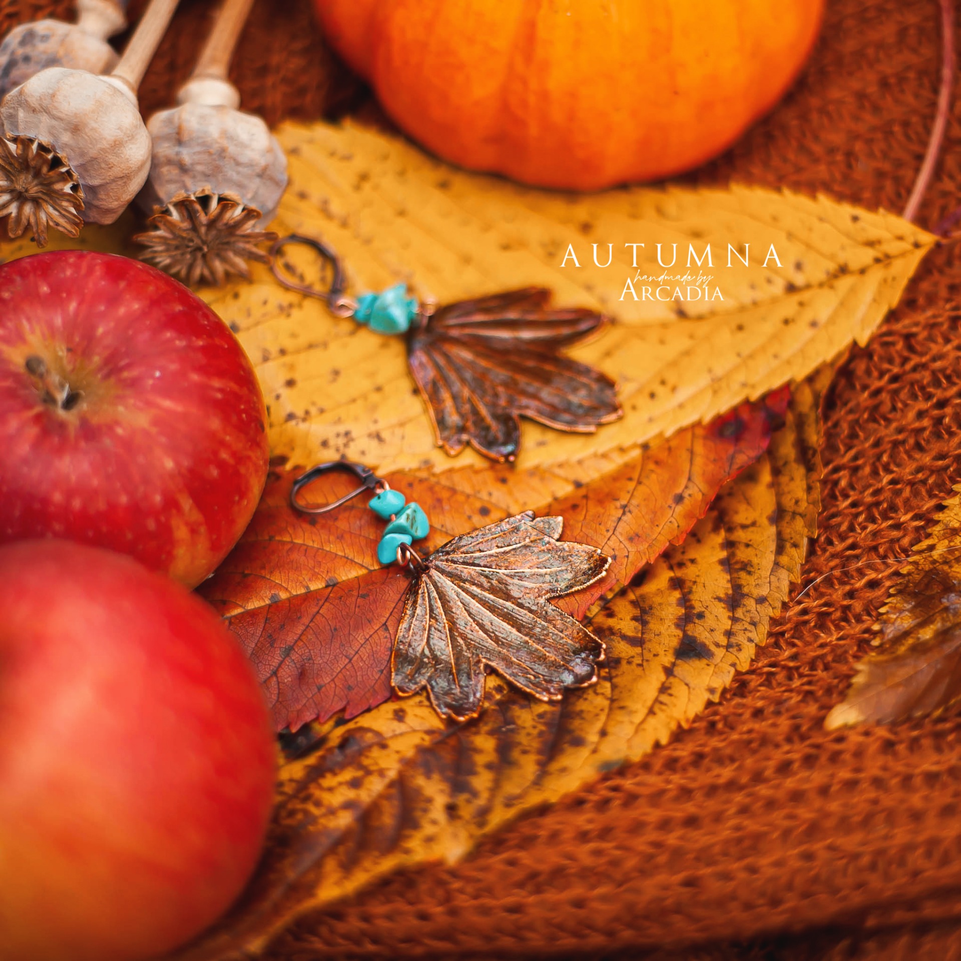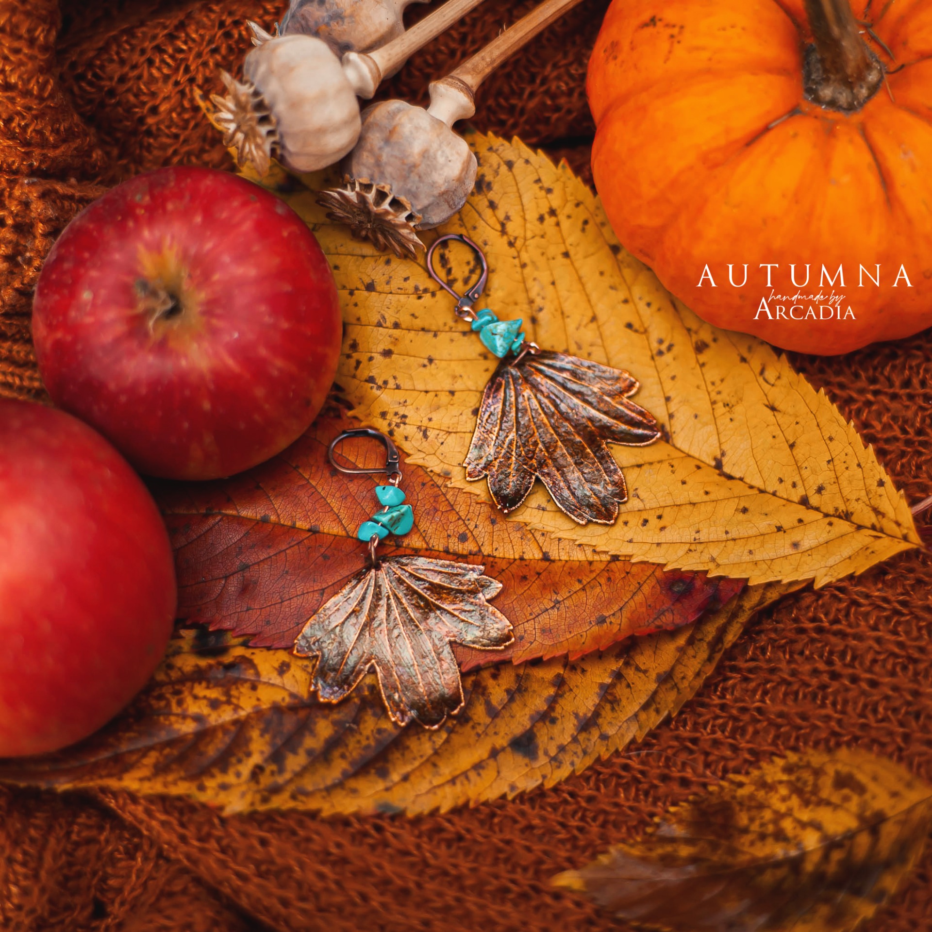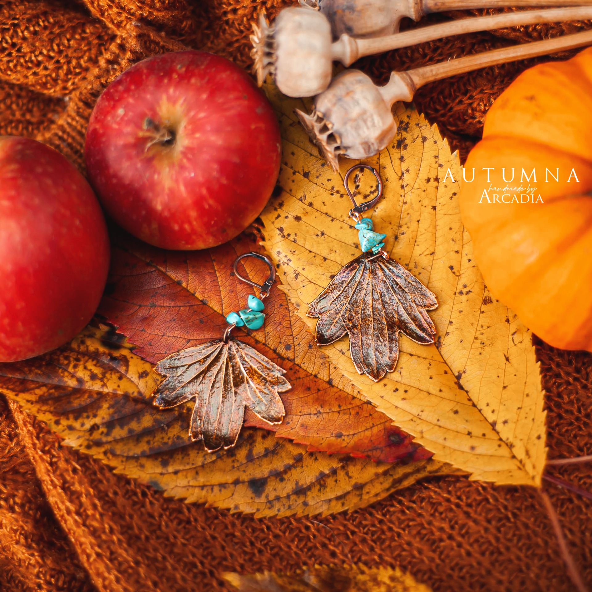 Boho náušničky se skutečnými pokovenými lístky josty, ozdobené korálky tyrkenitu. Bižuterní zavírací náušnicové háčky. Vyrobeno rukama a srdcem v alchymistické dílně na severu Čech.