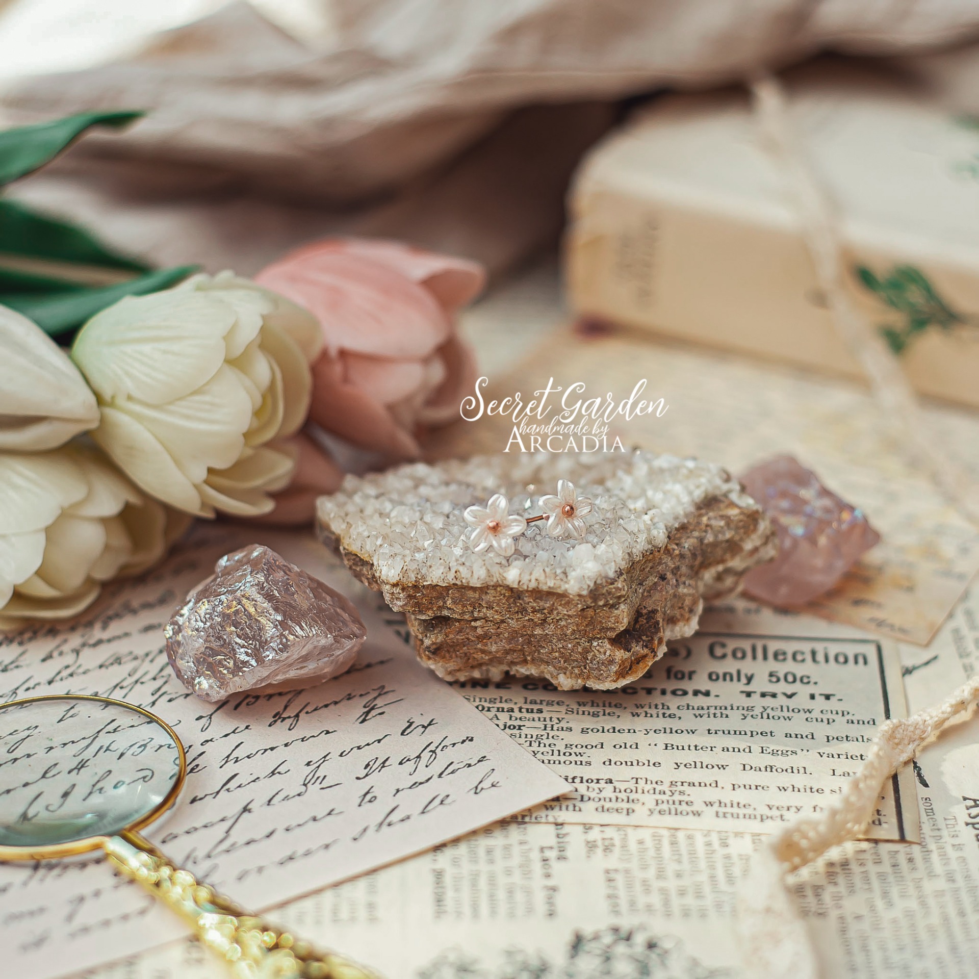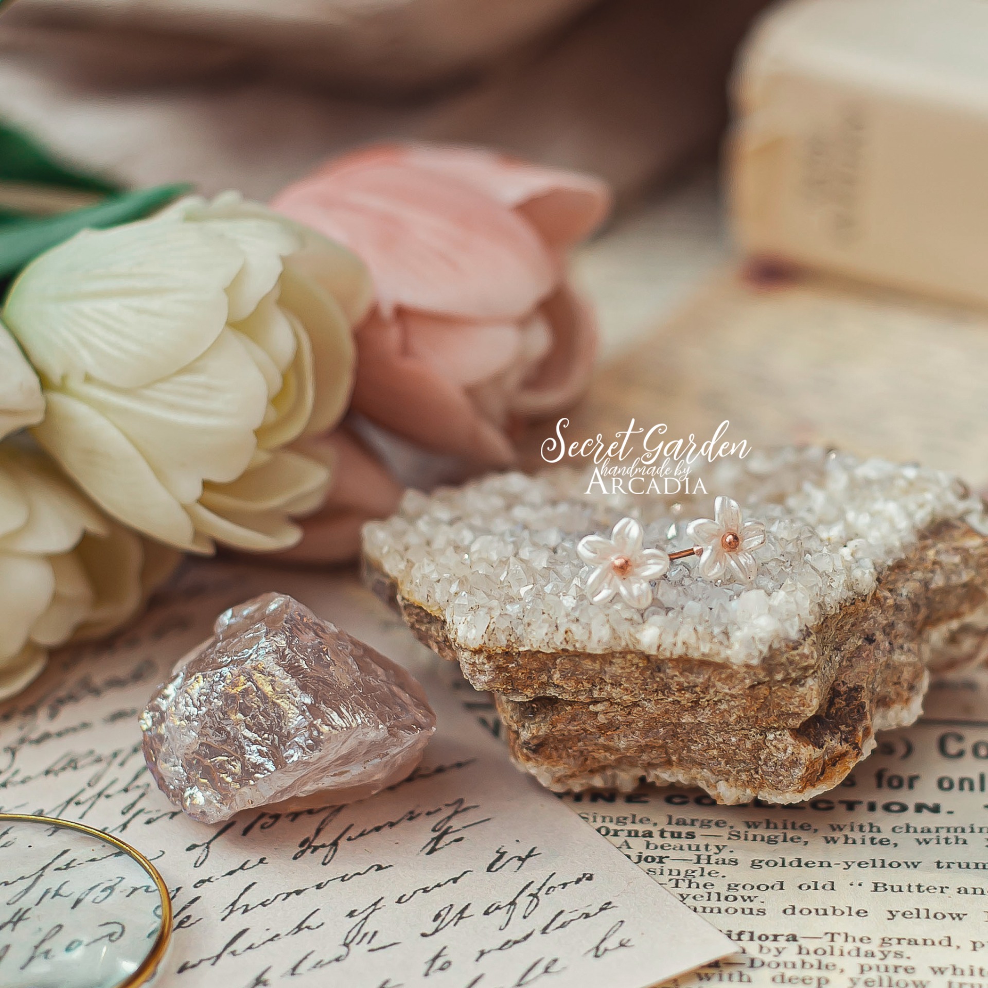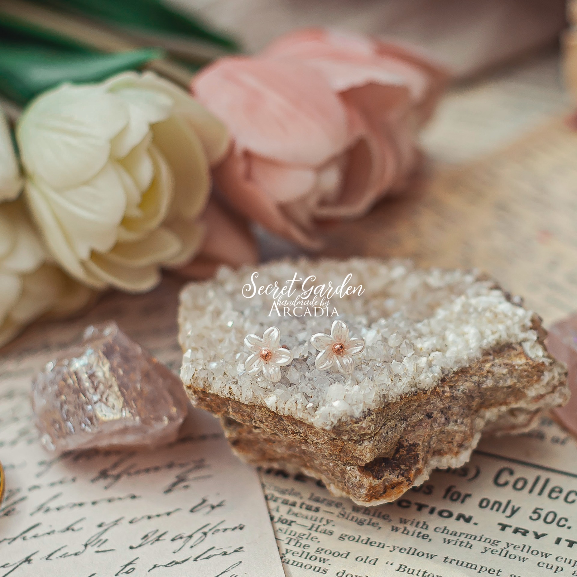Drobné puzetové náušničky s perleťově bílými kvítky a rosegold středem. Rosegold puzety z nerezové oceli. Vyrobeno rukama a srdcem v alchymistické dílně na severu Čech.