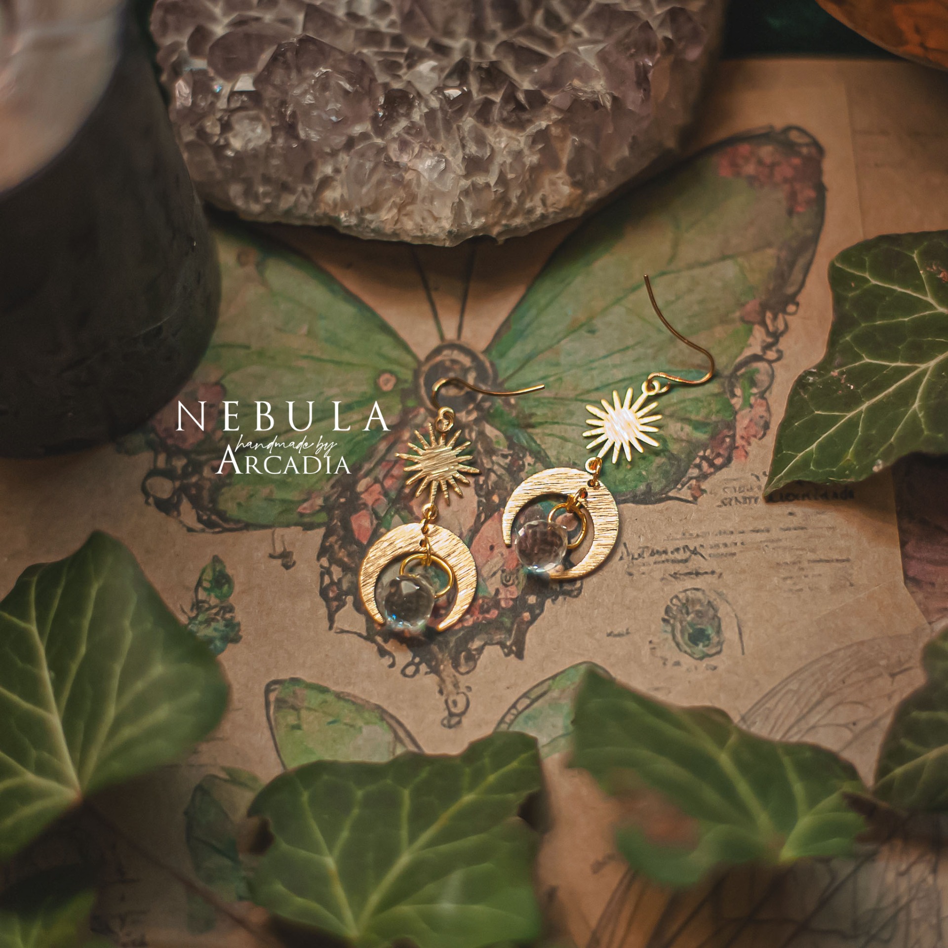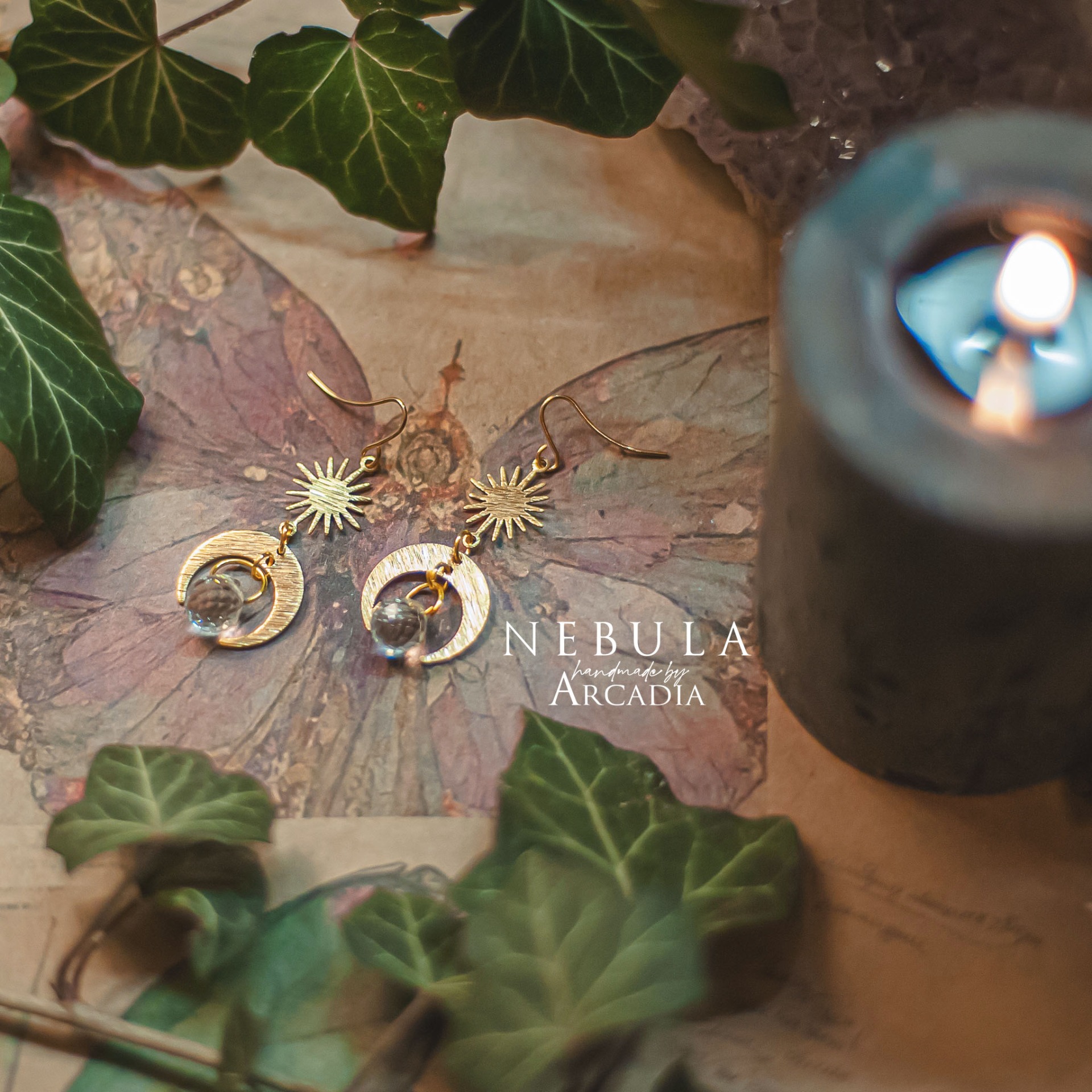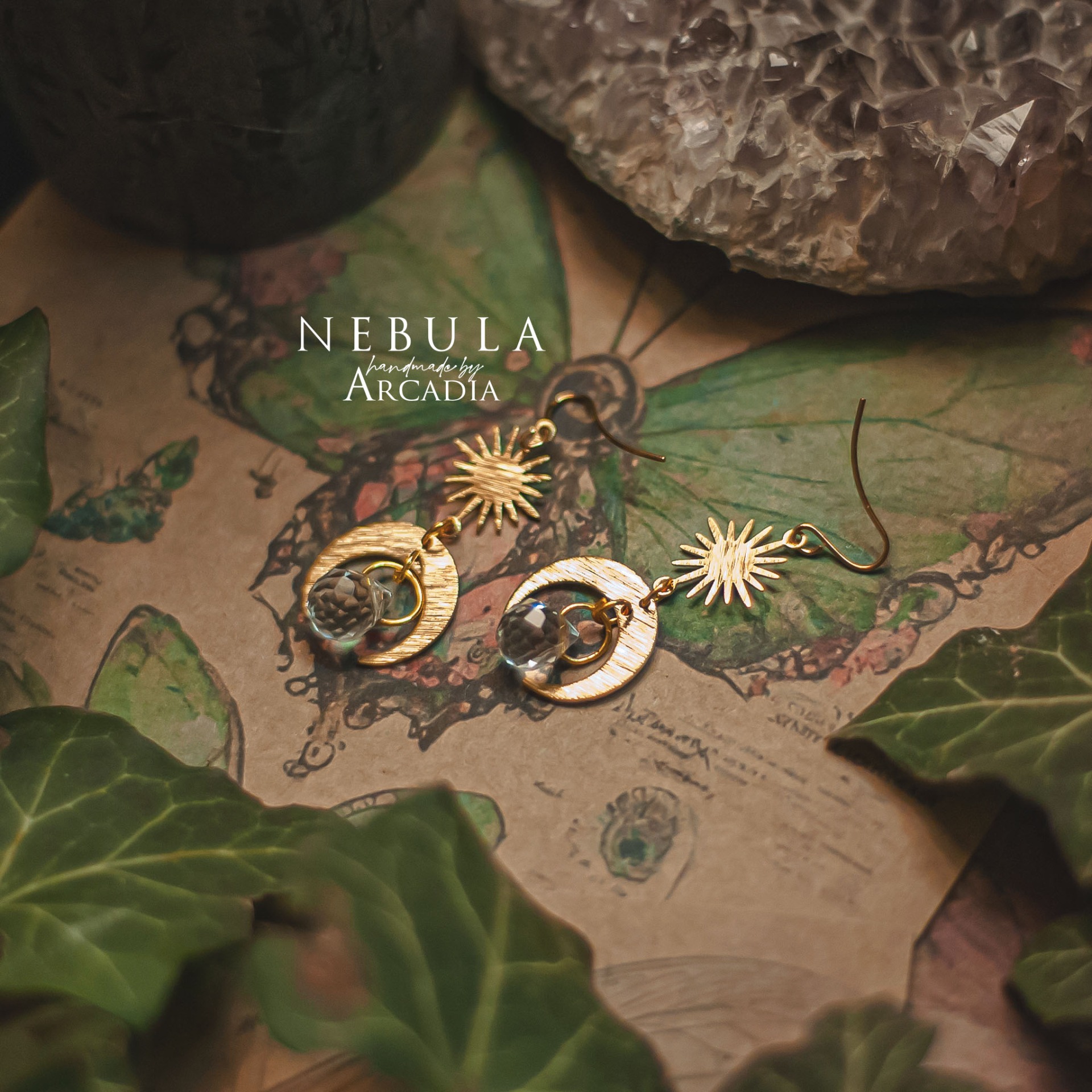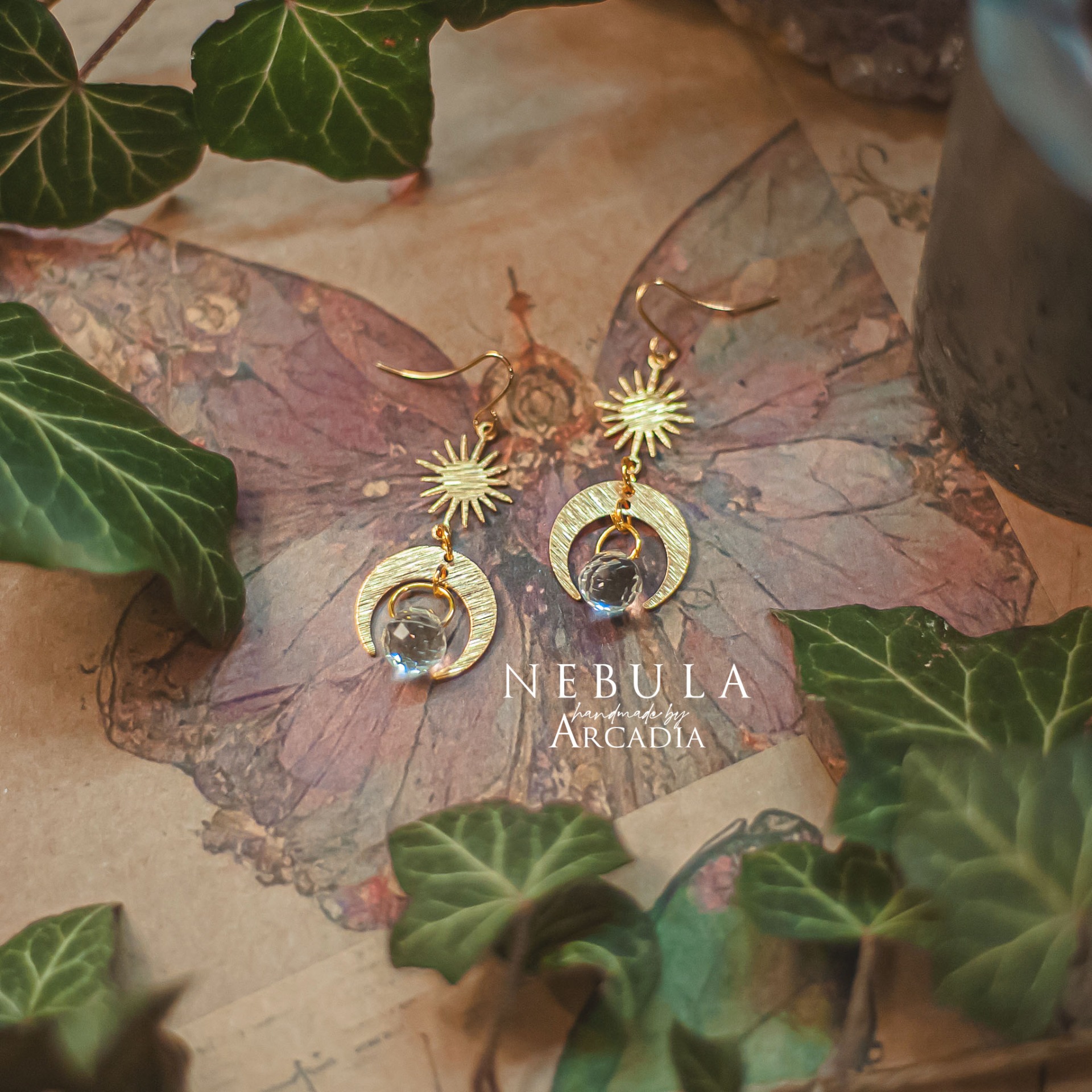 Visací náušničky s mosazným přívěskem s motivem slunce a měsíce, zakončené kapkou broušeného skla, která na slunci vykouzlí duhovou podívanou. Vyrobeno rukama a srdcem v alchymistické dílně na severu Čech.