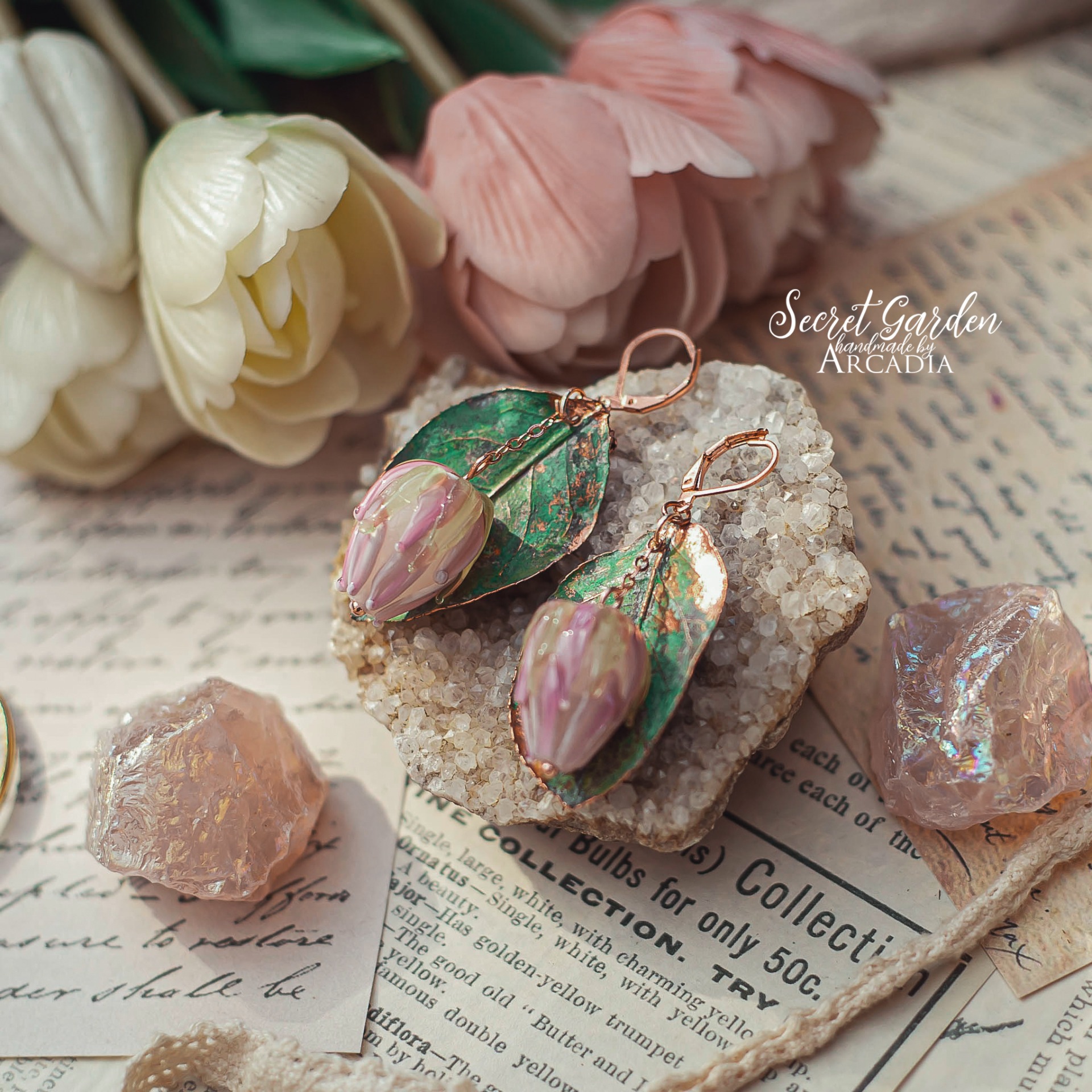 Visací náušnice ze skutečných pokovených růžových lístků v jemné vintage zelenkavé patině z přívěsky růžových kvítků z autorského vinutého skla. Zavírací bižuterní náušnicové háčky. Vyrobeno rukama a srdcem v alchymistické dílně na severu Čech.