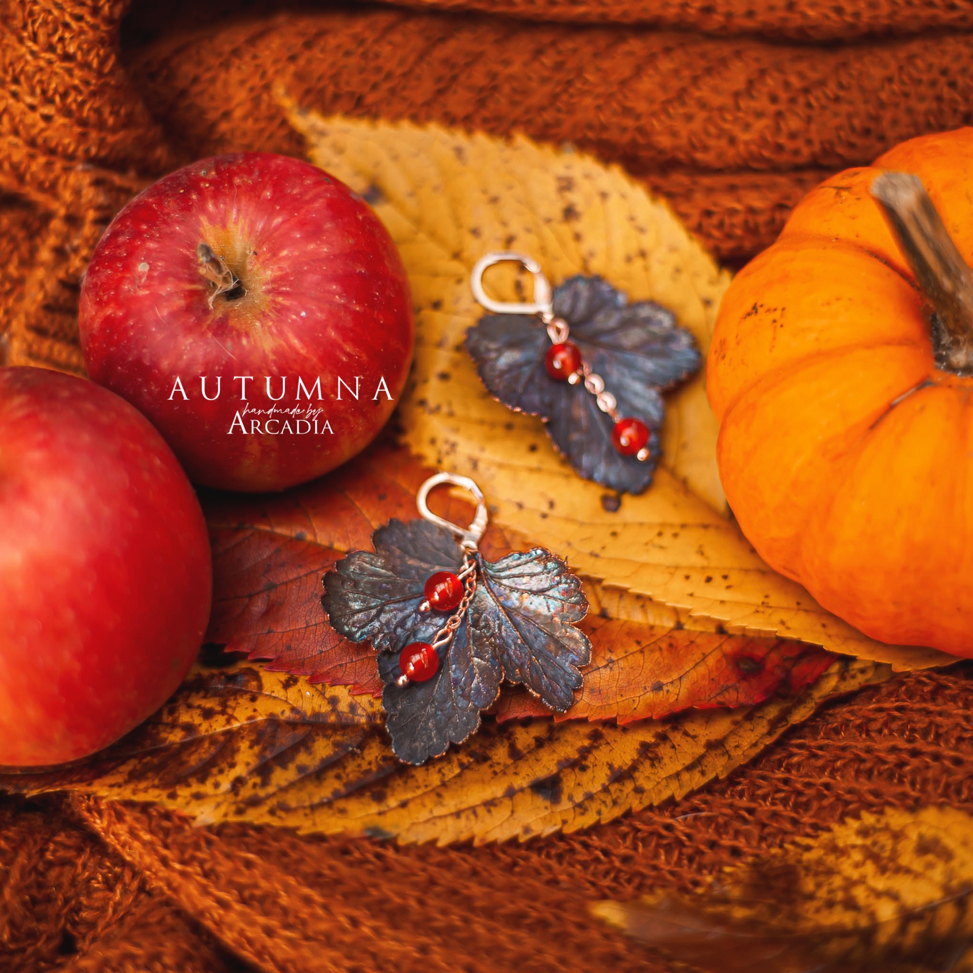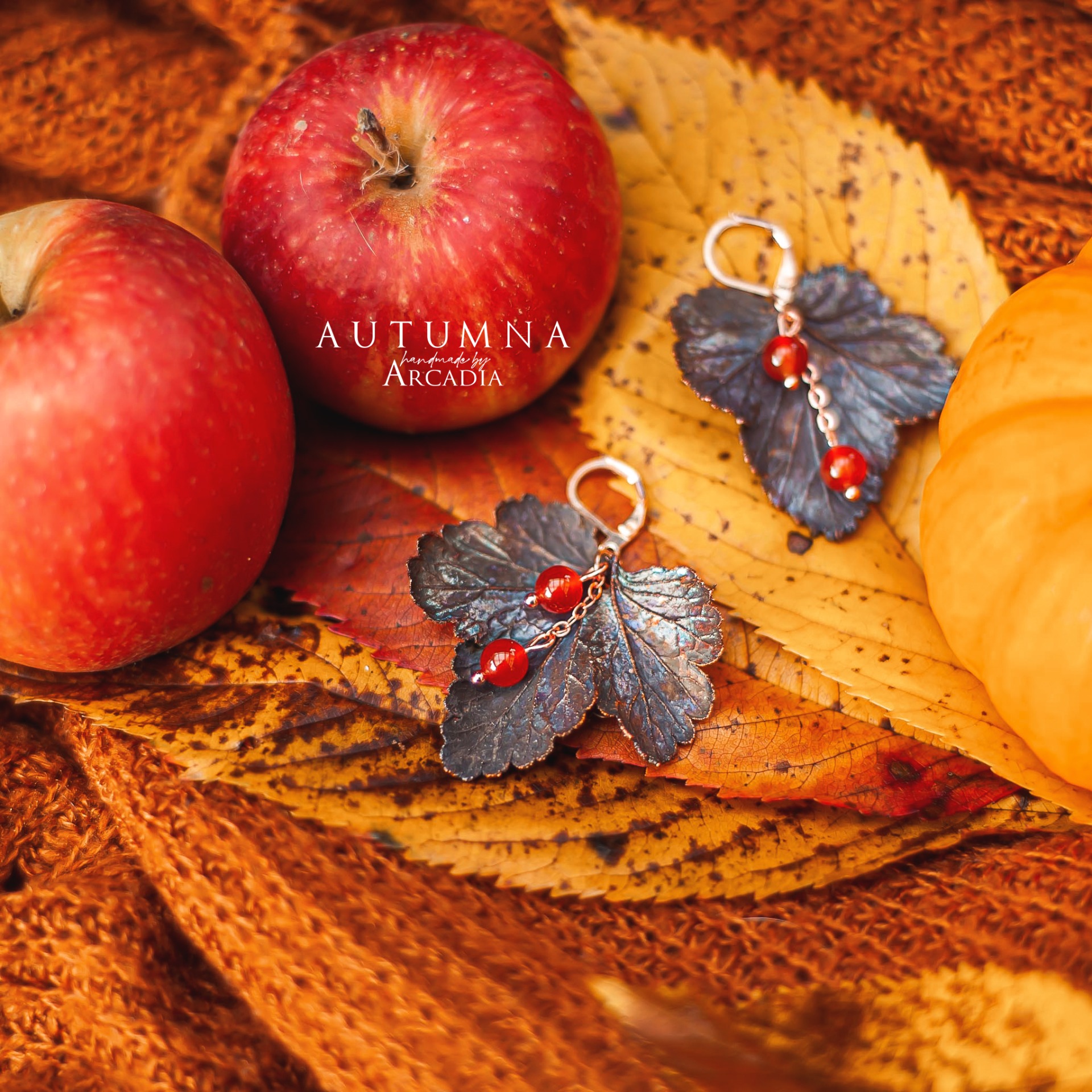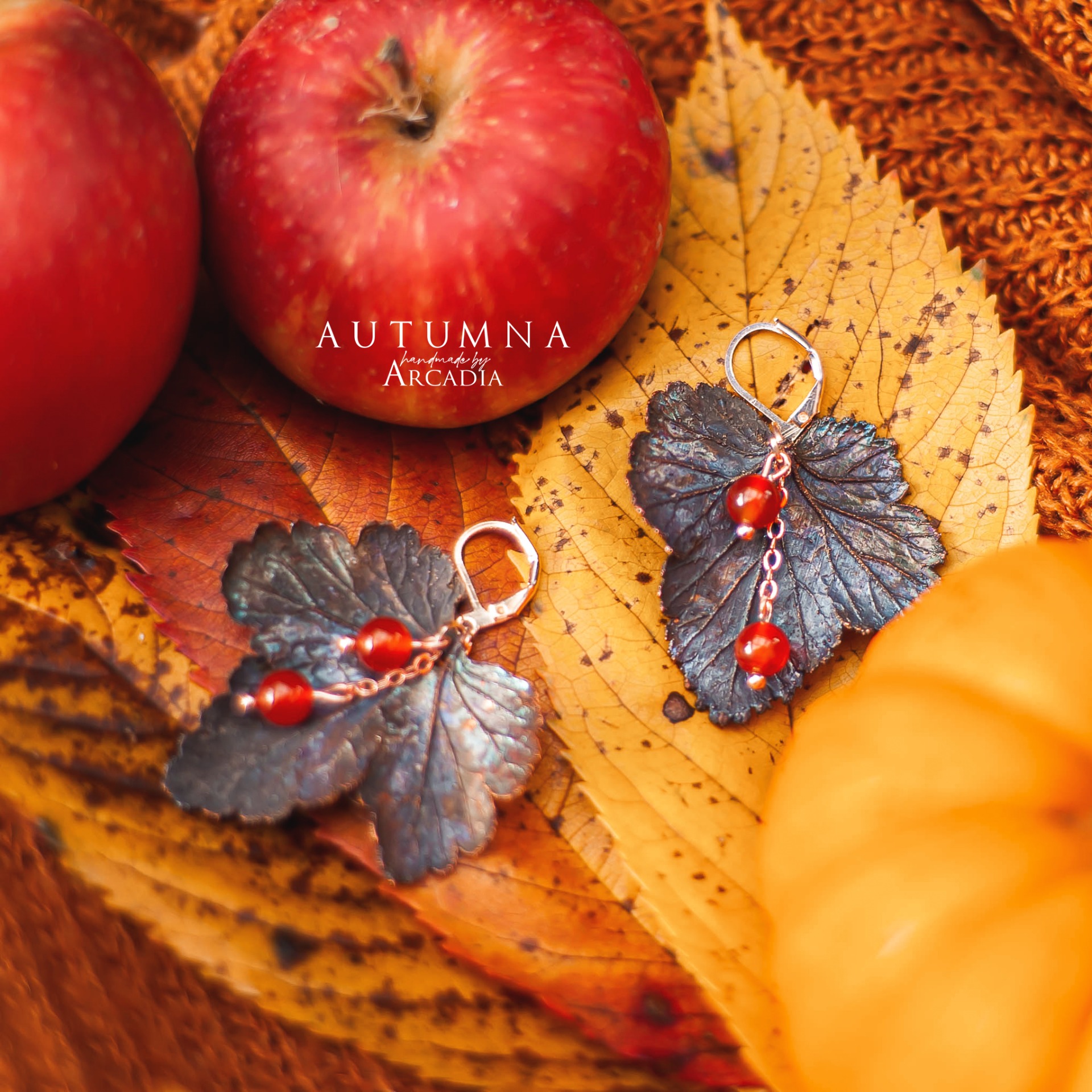 Náušnice ze skutečných pokovených rybízu, ozdobené korálky z karneolu. Bižuterní zavírací náušnicové háčky. Vyrobeno rukama a srdcem v alchymistické dílně na severu Čech.