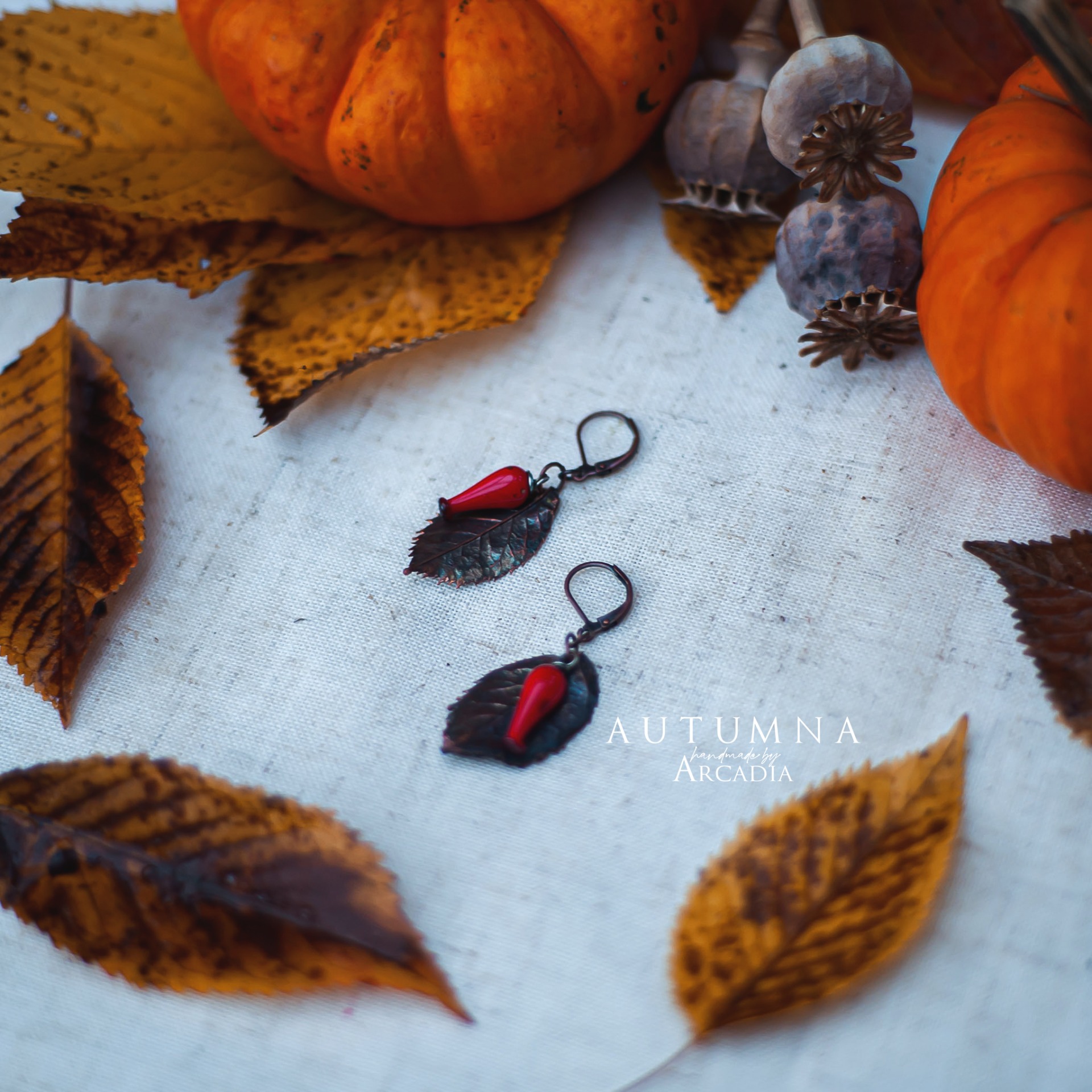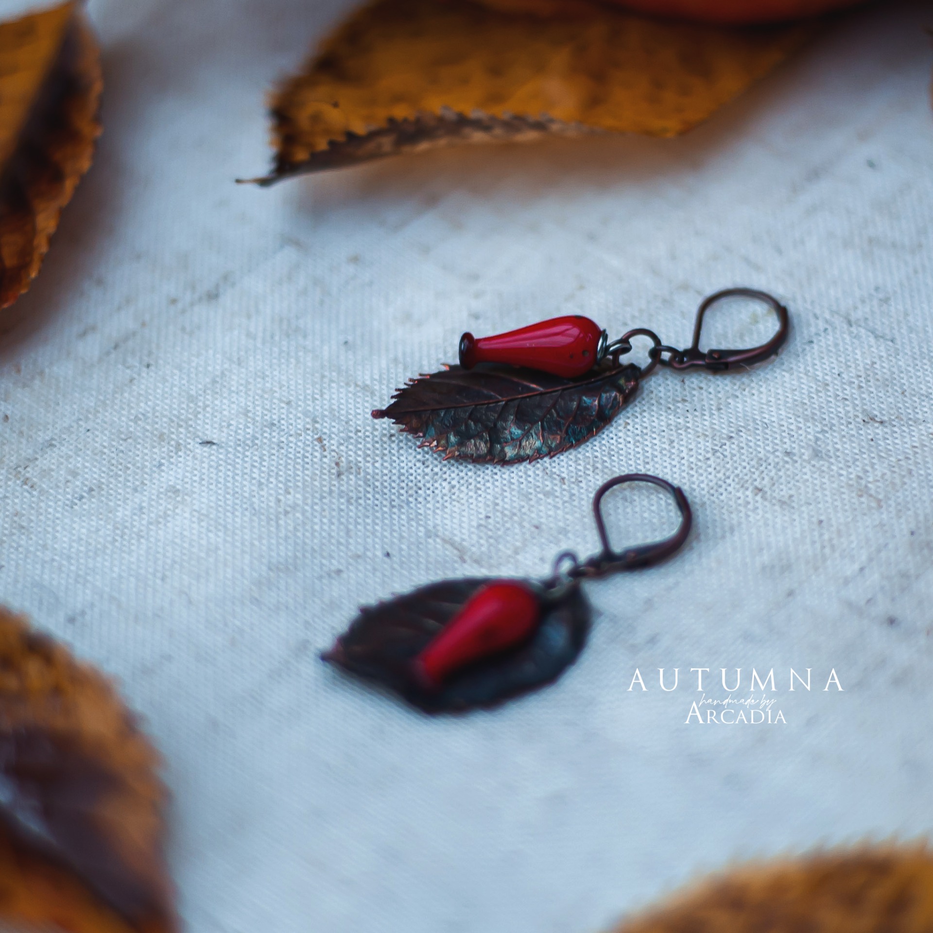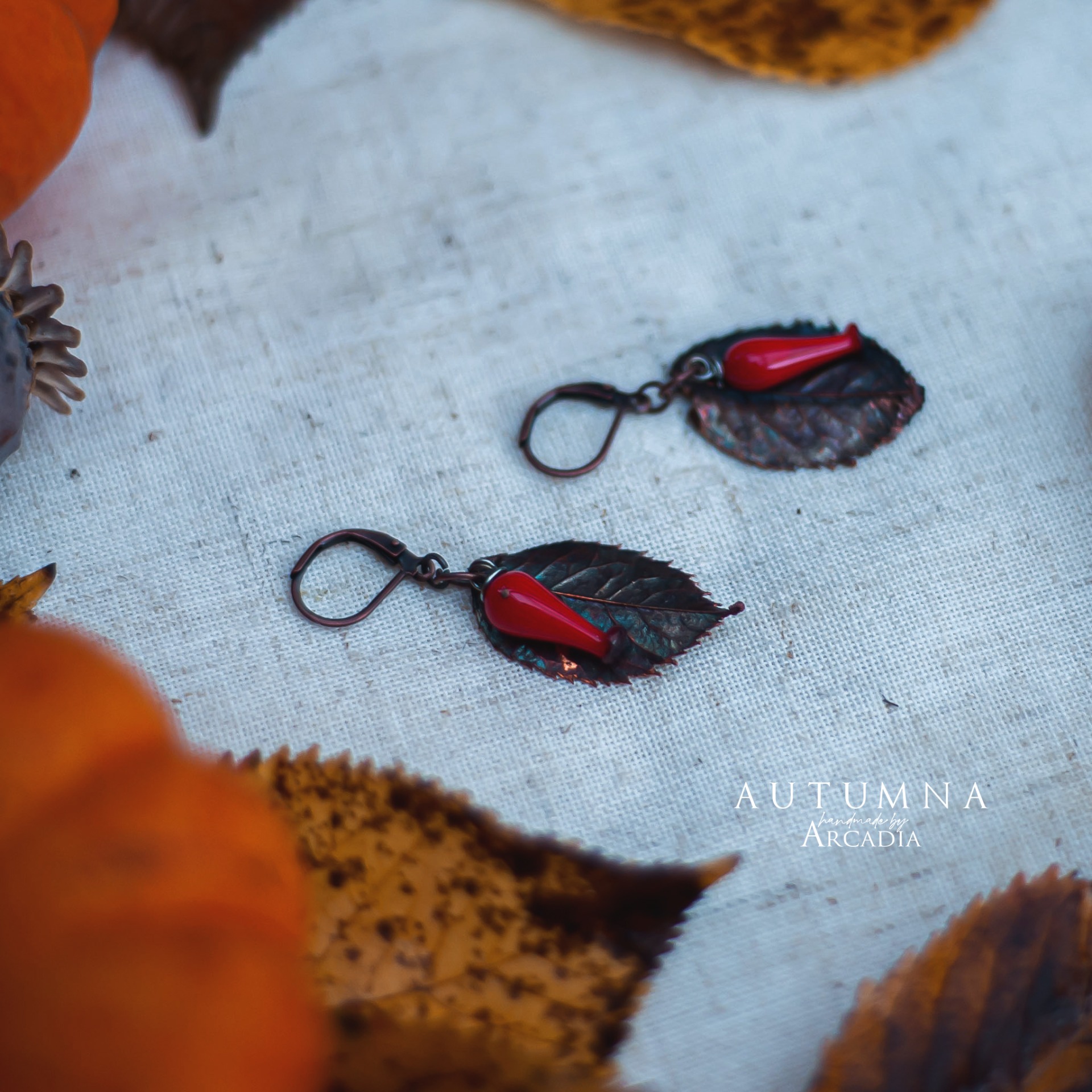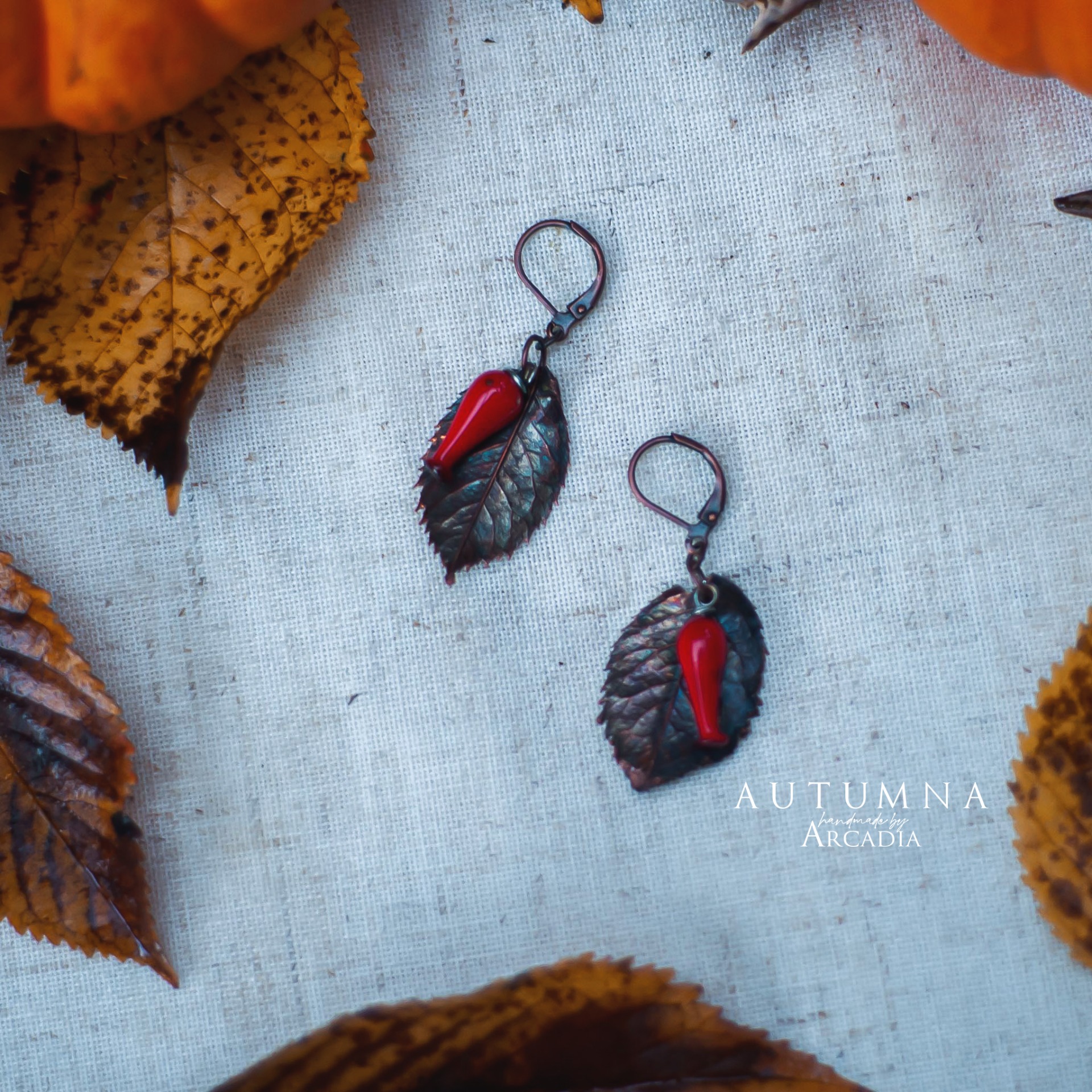 Náušničky ze skutečných pokovených lístků ze šípkového keře, ozdobené skleněnými šípky z českého ručně vinutého skla. Bižuterní zavírací náušnicové háčky. Vyrobeno rukama a srdcem v alchymistické dílně na severu Čech.