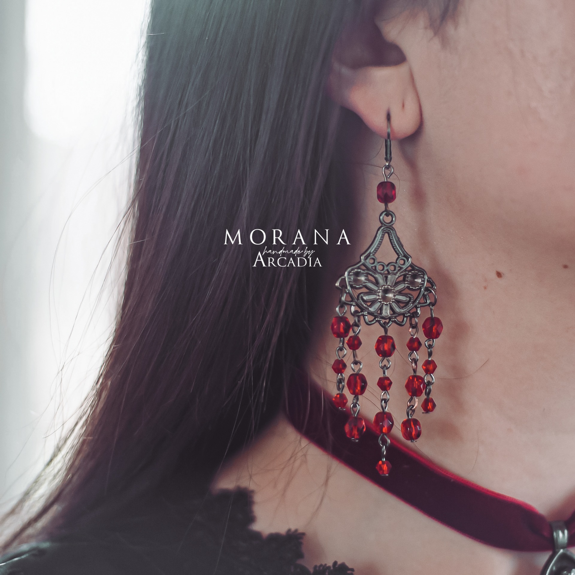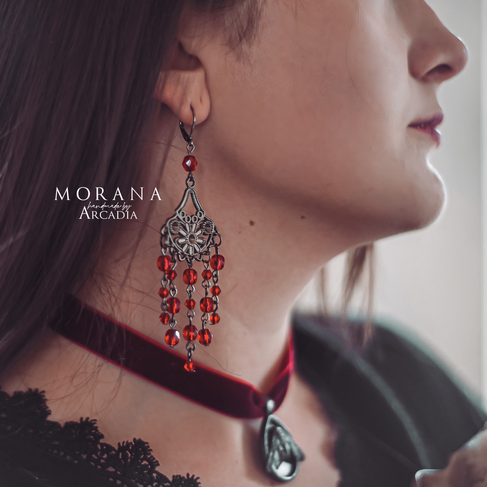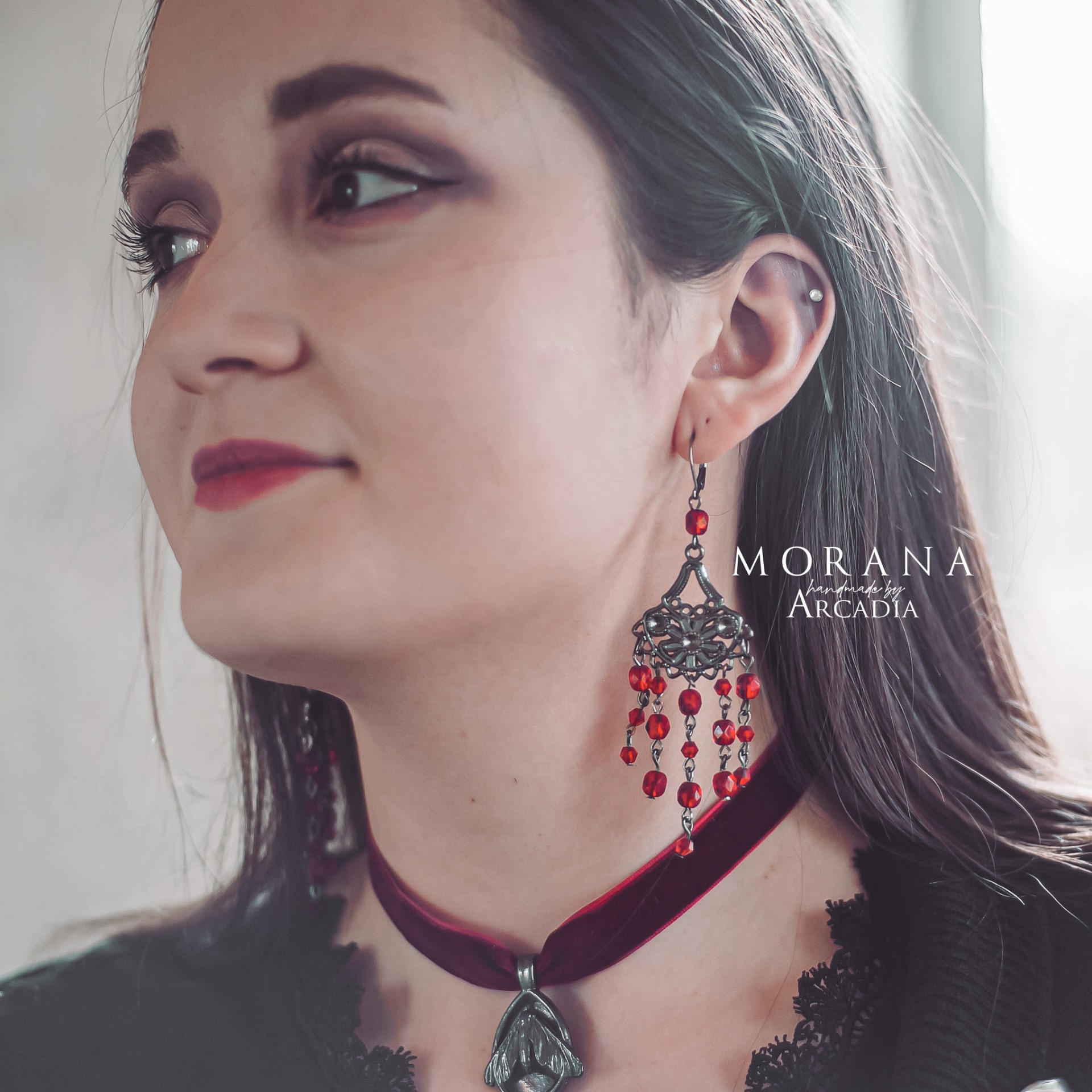 Zdobné visací náušnice s rudými skleněnými korálky v gotickém stylu. Zavírací náušnicové háčky z nerezové oceli. Vyrobeno rukama a srdcem v alchymistické dílně na severu Čech.