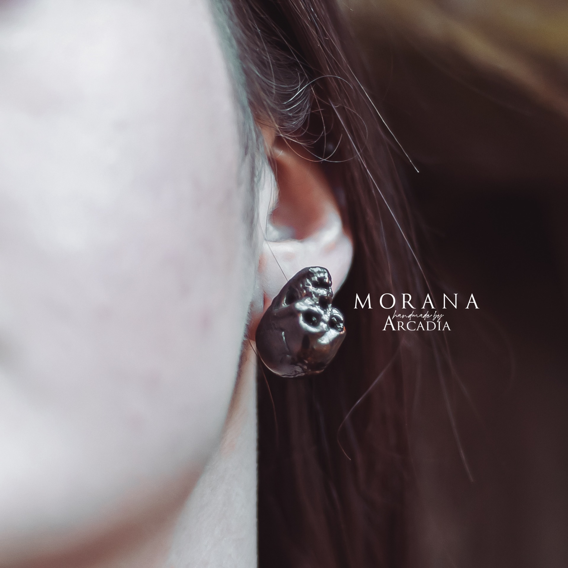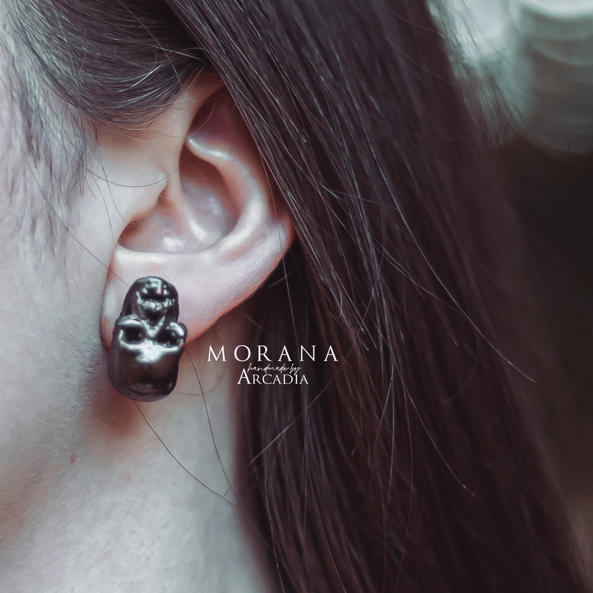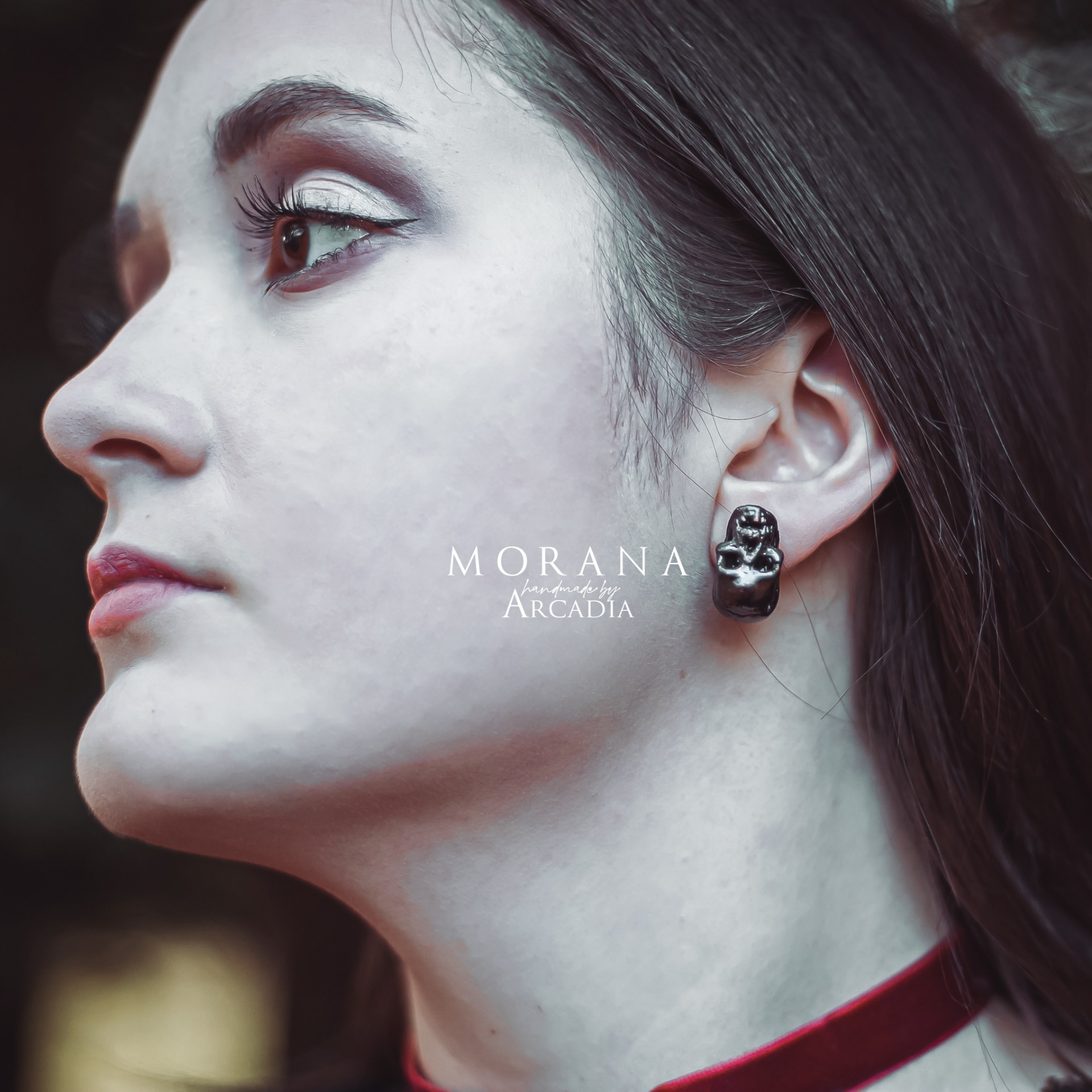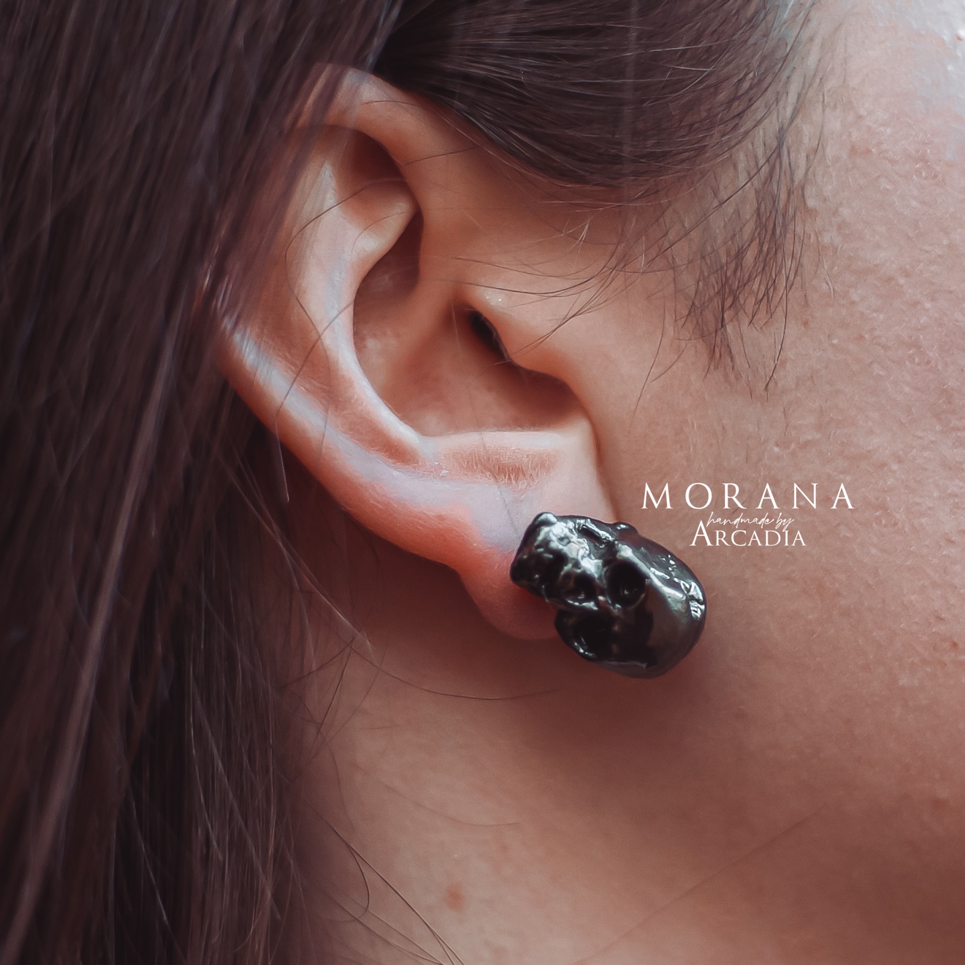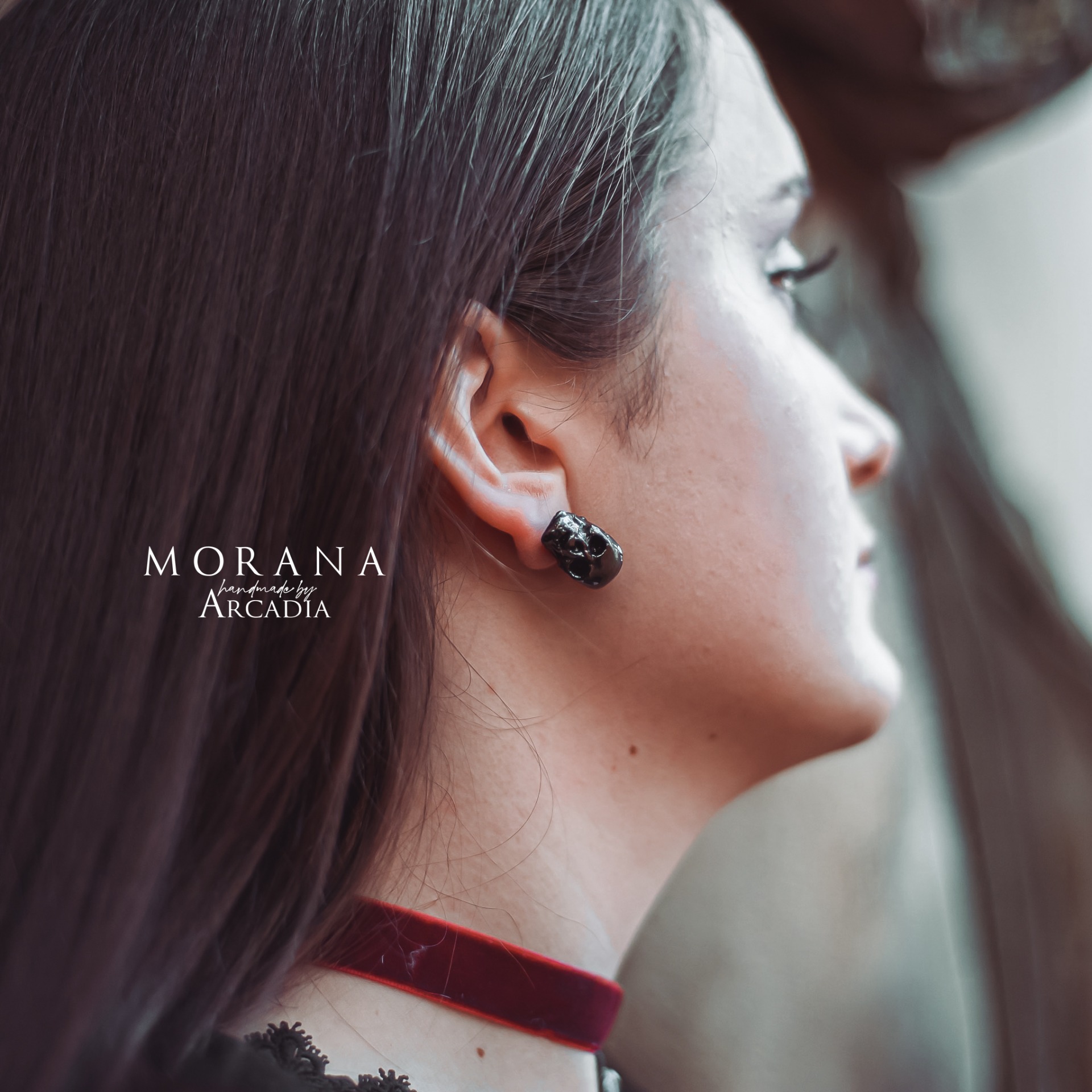 Puzetové náušnice s lebkou v temné gunmetal patině. Puzety z nerezové oceli. Vyrobeno rukama a srdcem v alchymistické dílně na severu Čech.