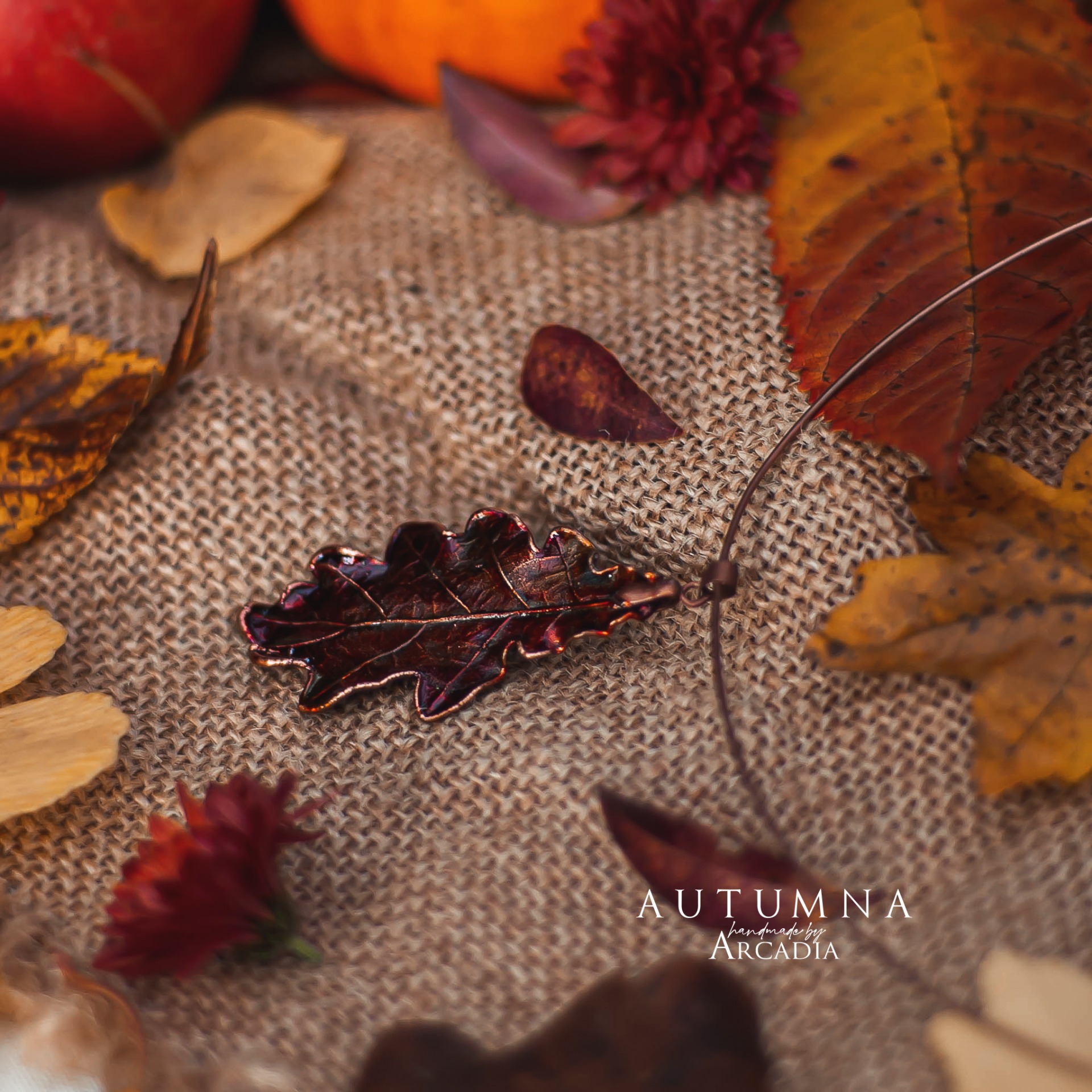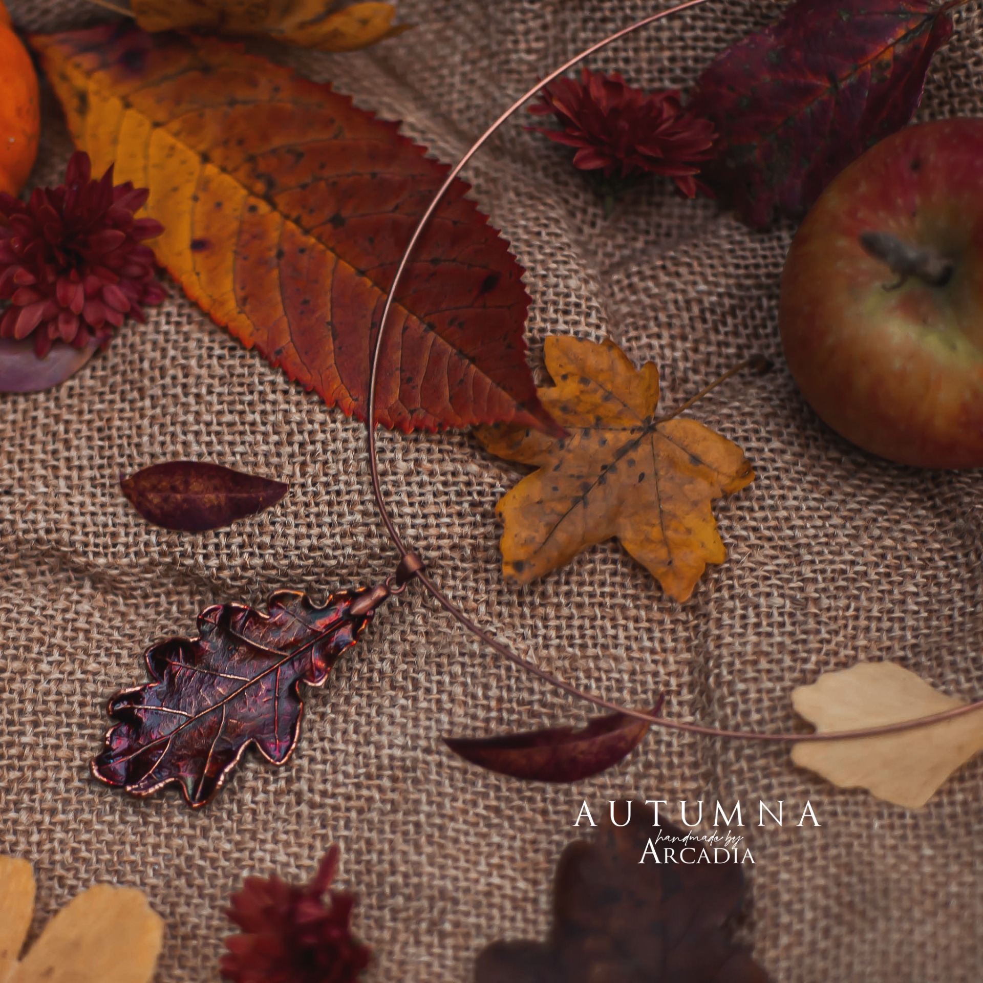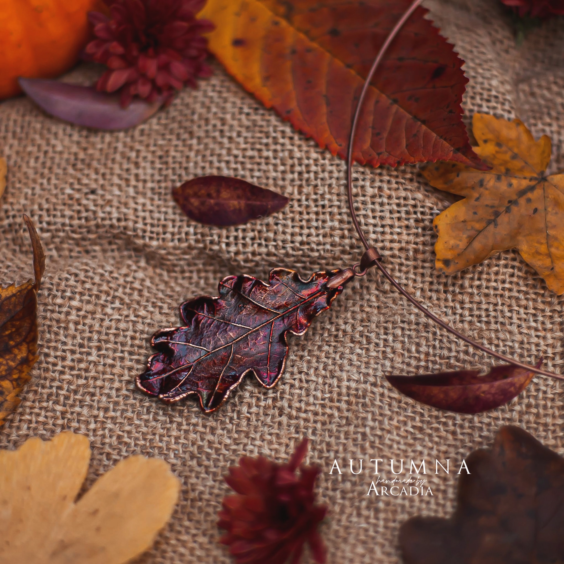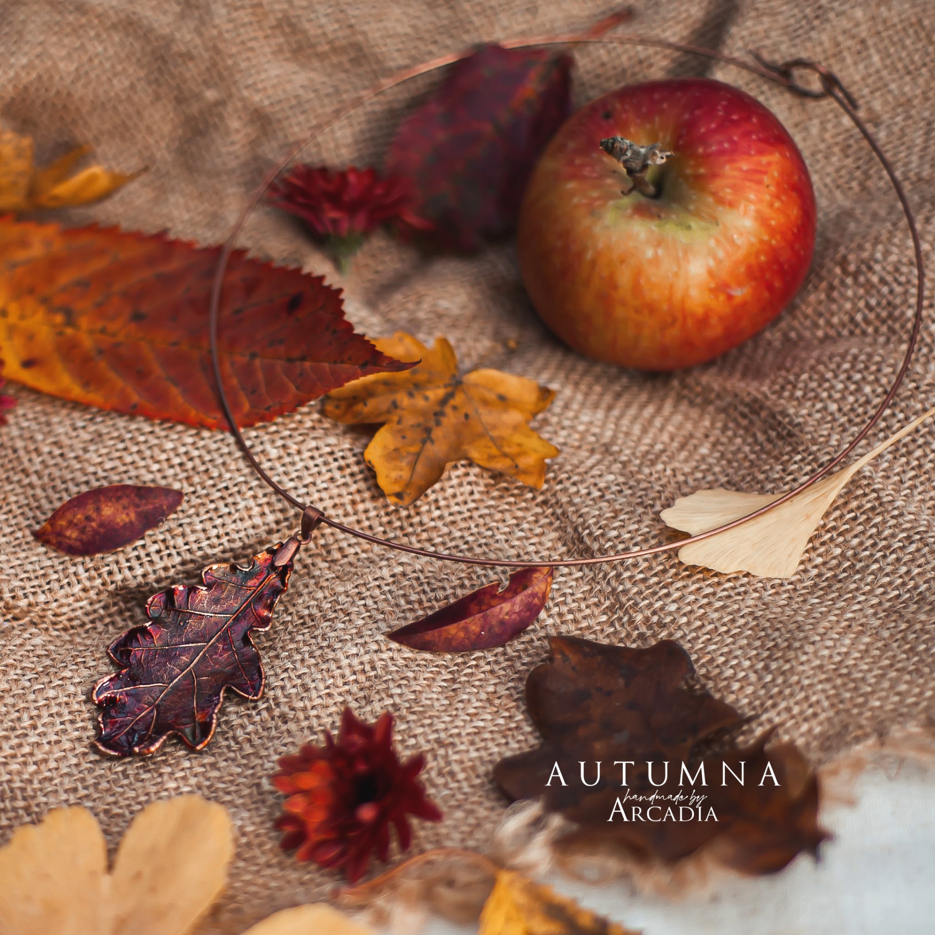 Obojková obruč s přívěskem ze skutečného pokoveného lístku lípy v podzimních odstínech. Vyrobeno rukama a srdcem v alchymistické dílně na severu Čech.