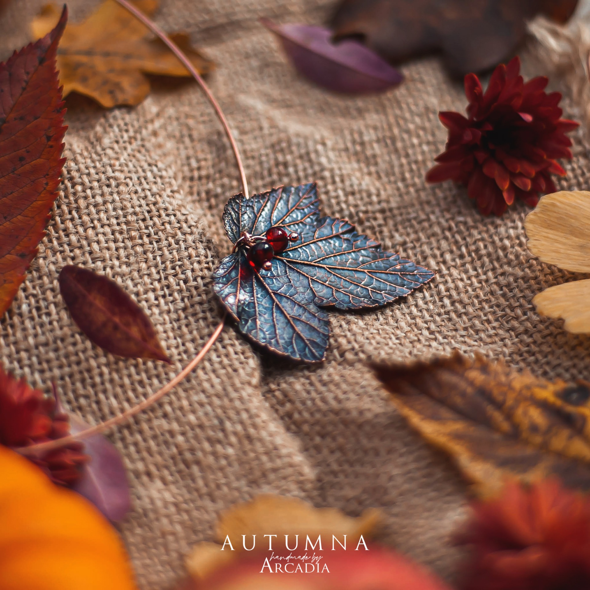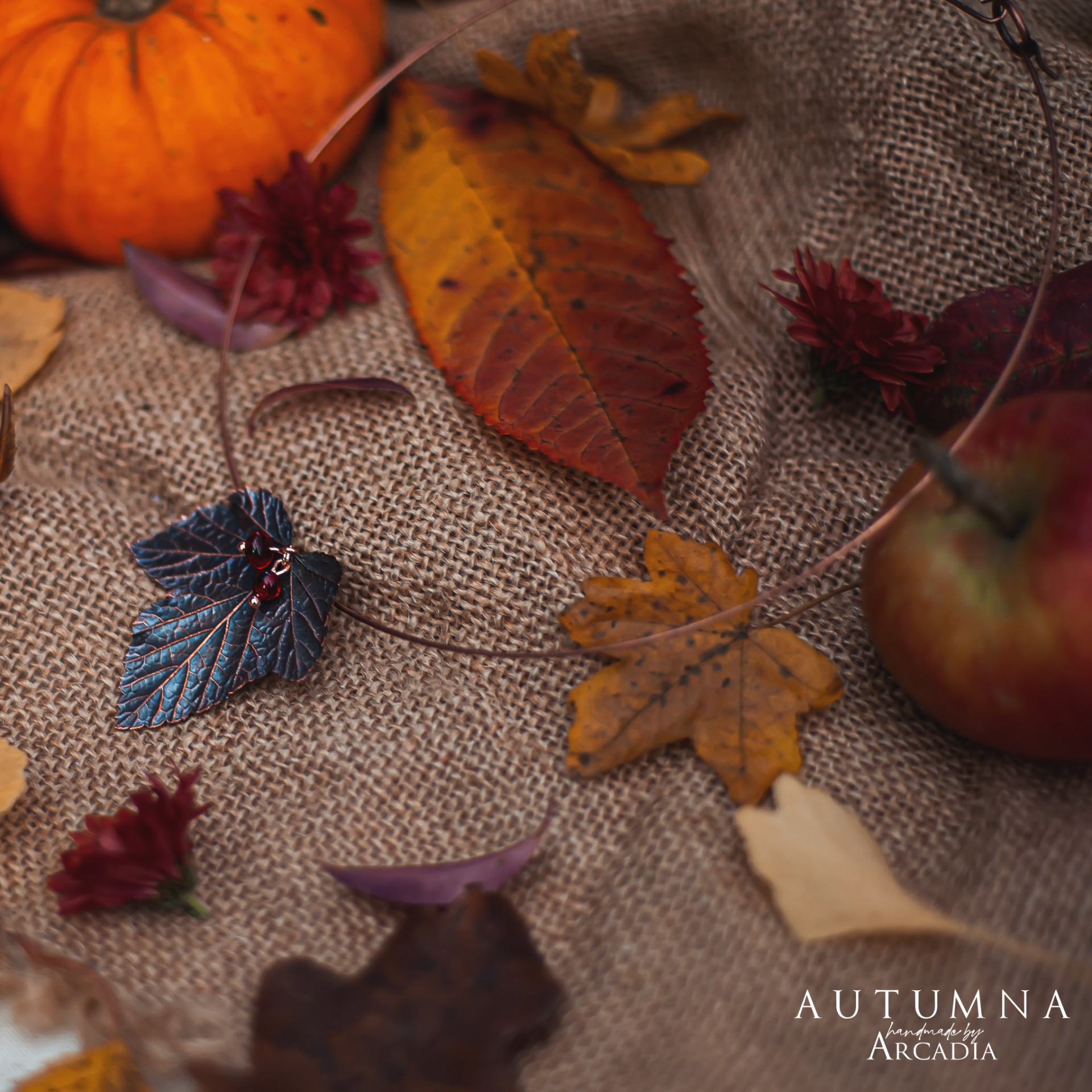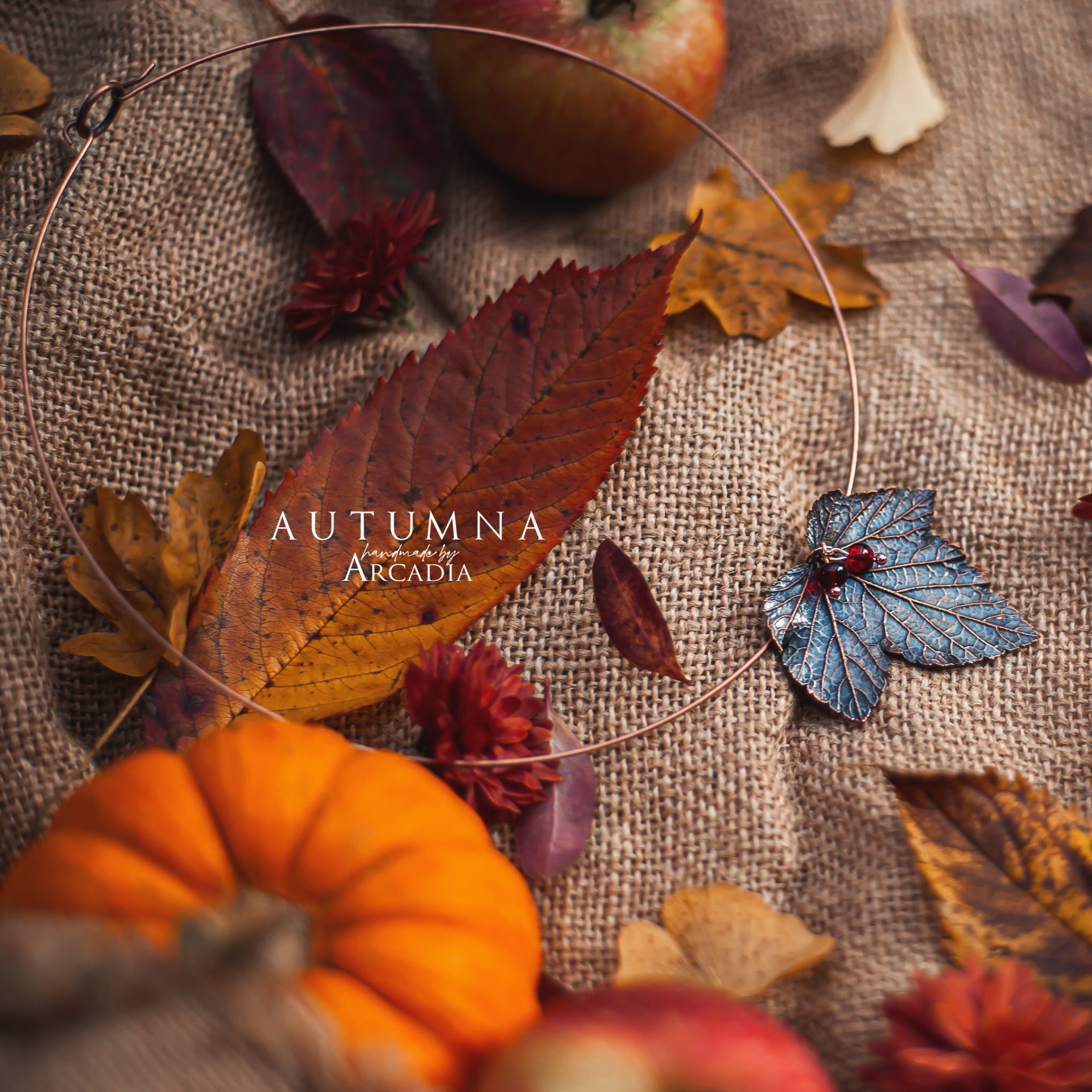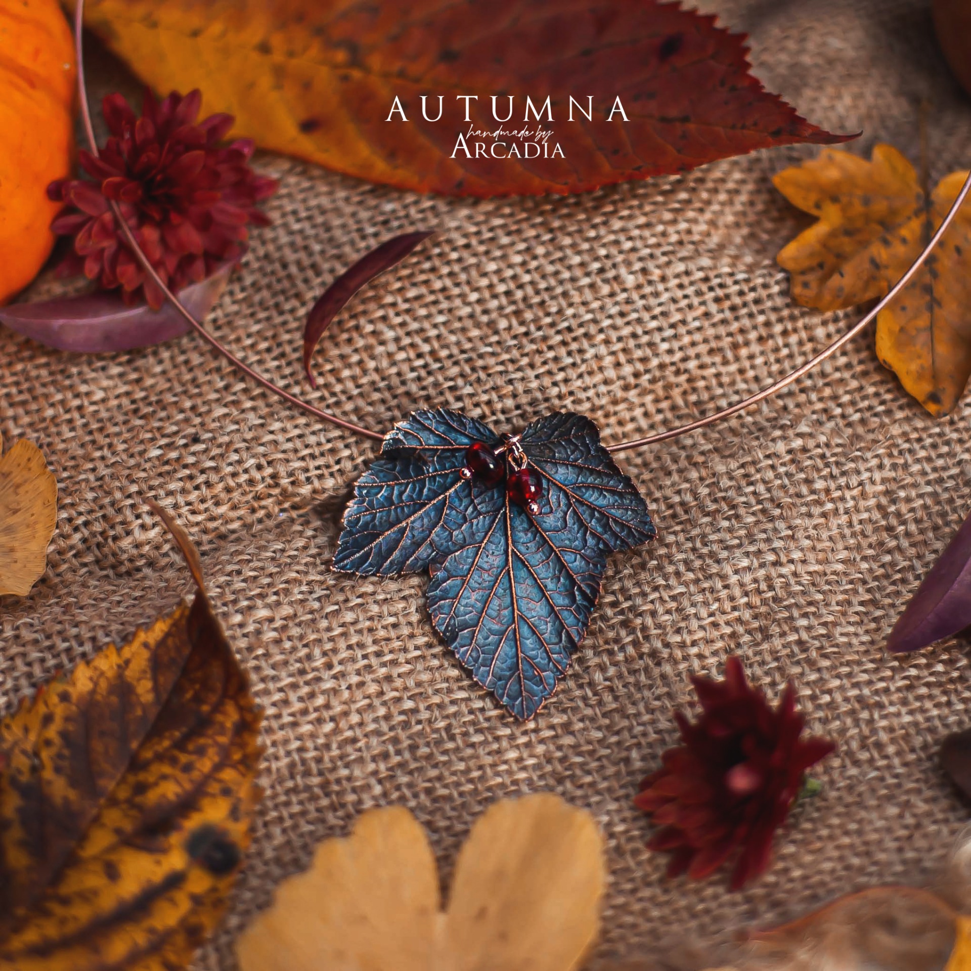 Obojková obruč s přívěskem ze skutečného pokoveného lístku rybízu s perličkami karneolu. Vyrobeno rukama a srdcem v alchymistické dílně na severu Čech.