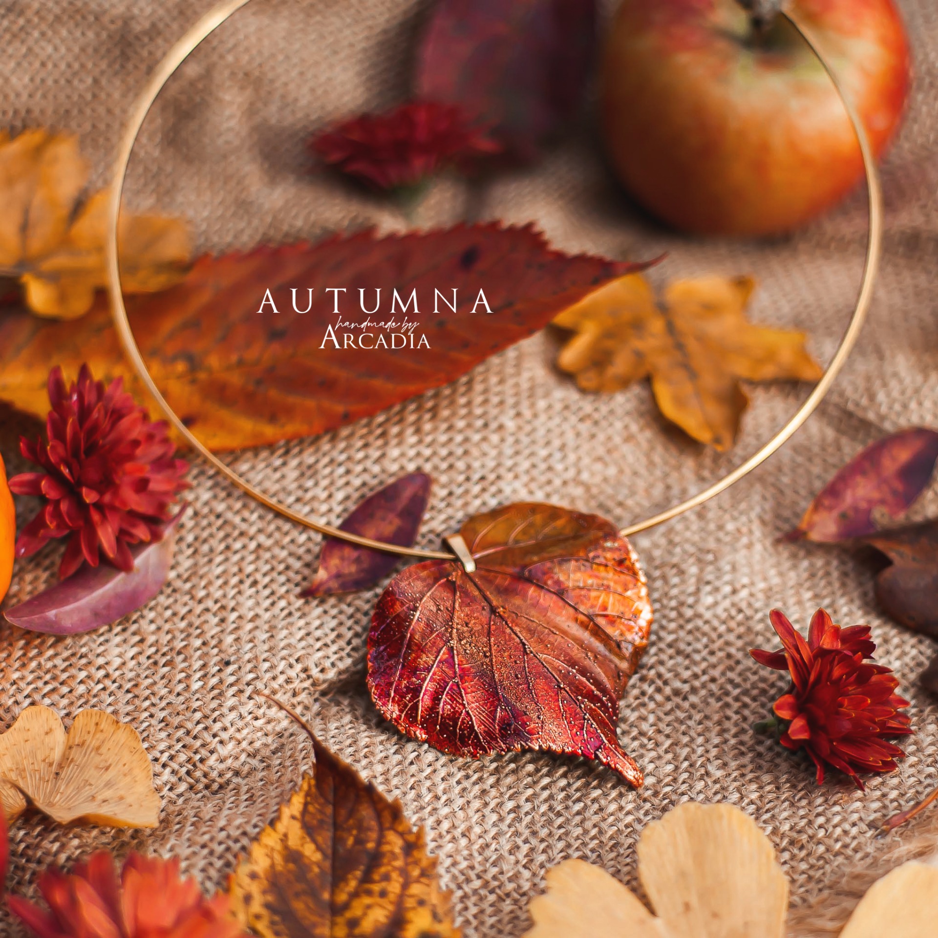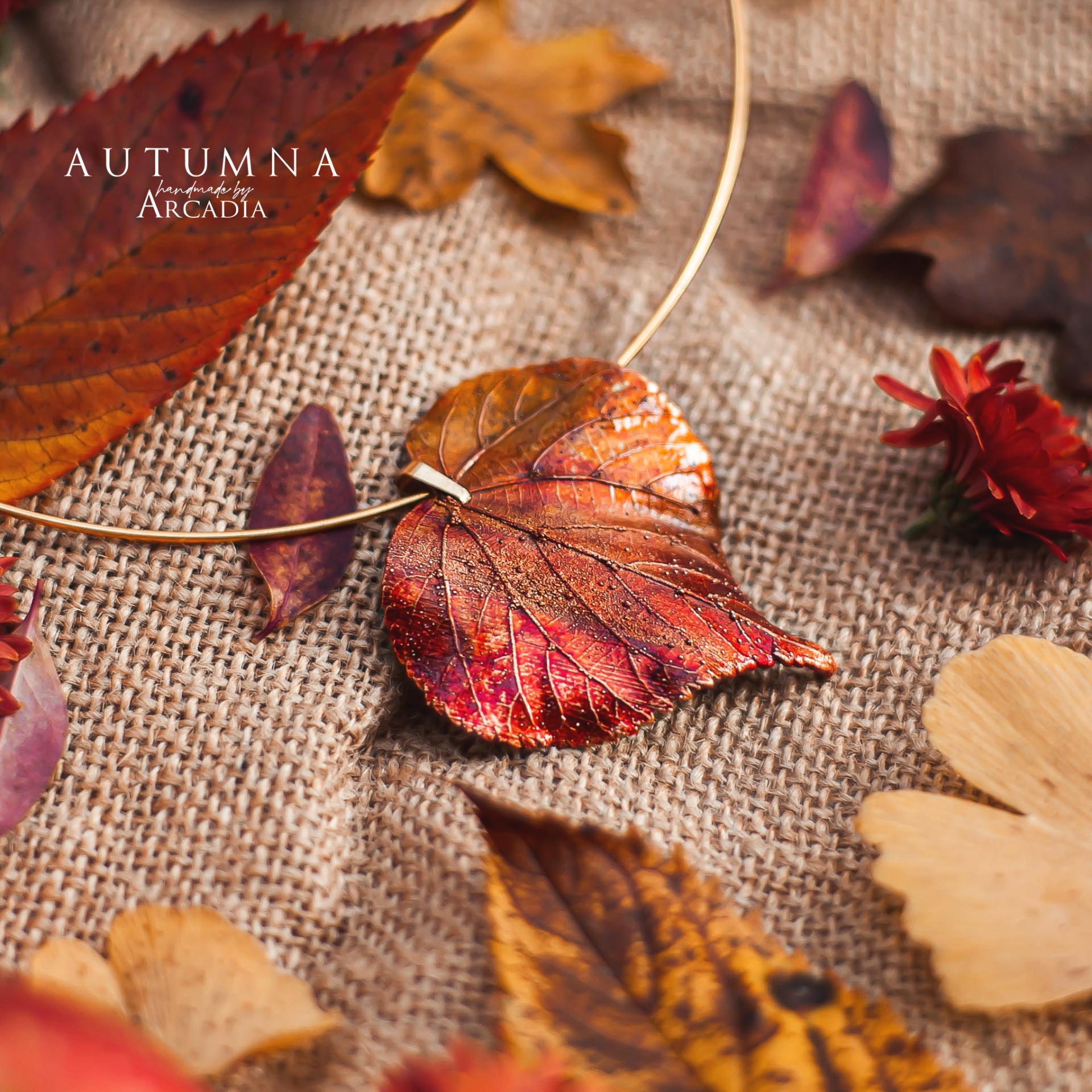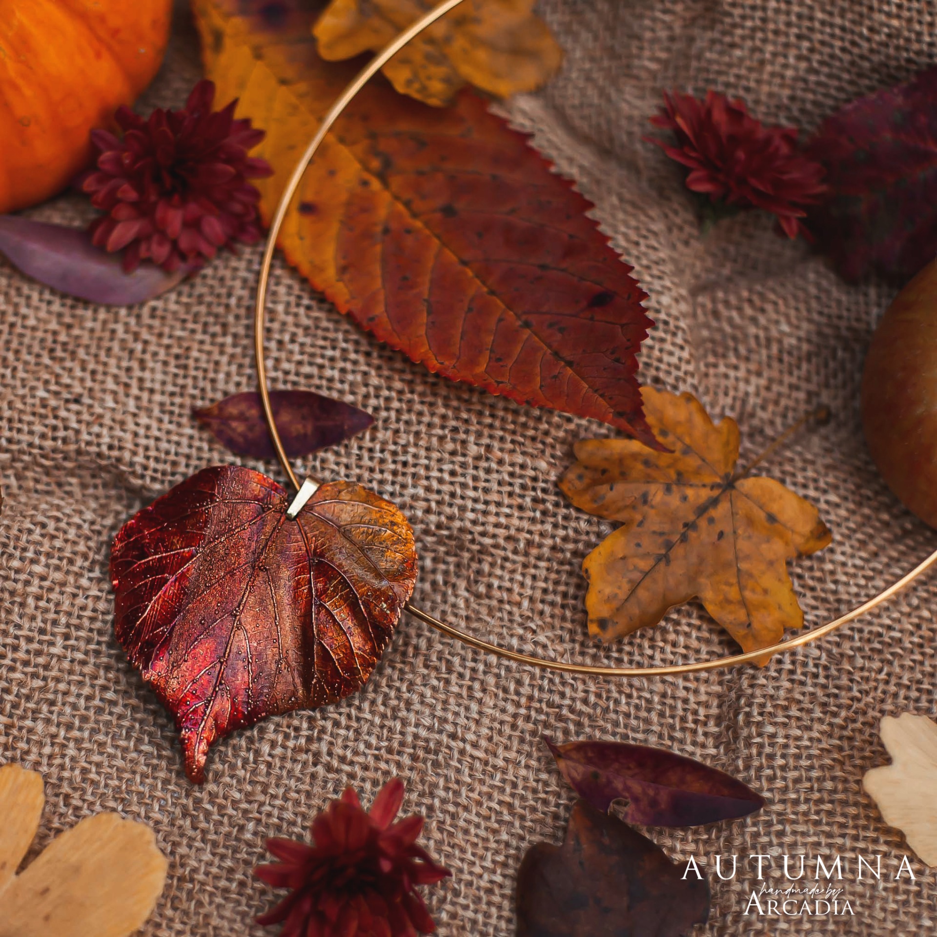 Obojková obruč s přívěskem ze skutečného pokoveného lístku lípy v ohnivých odstínech. Vyrobeno rukama a srdcem v alchymistické dílně na severu Čech.