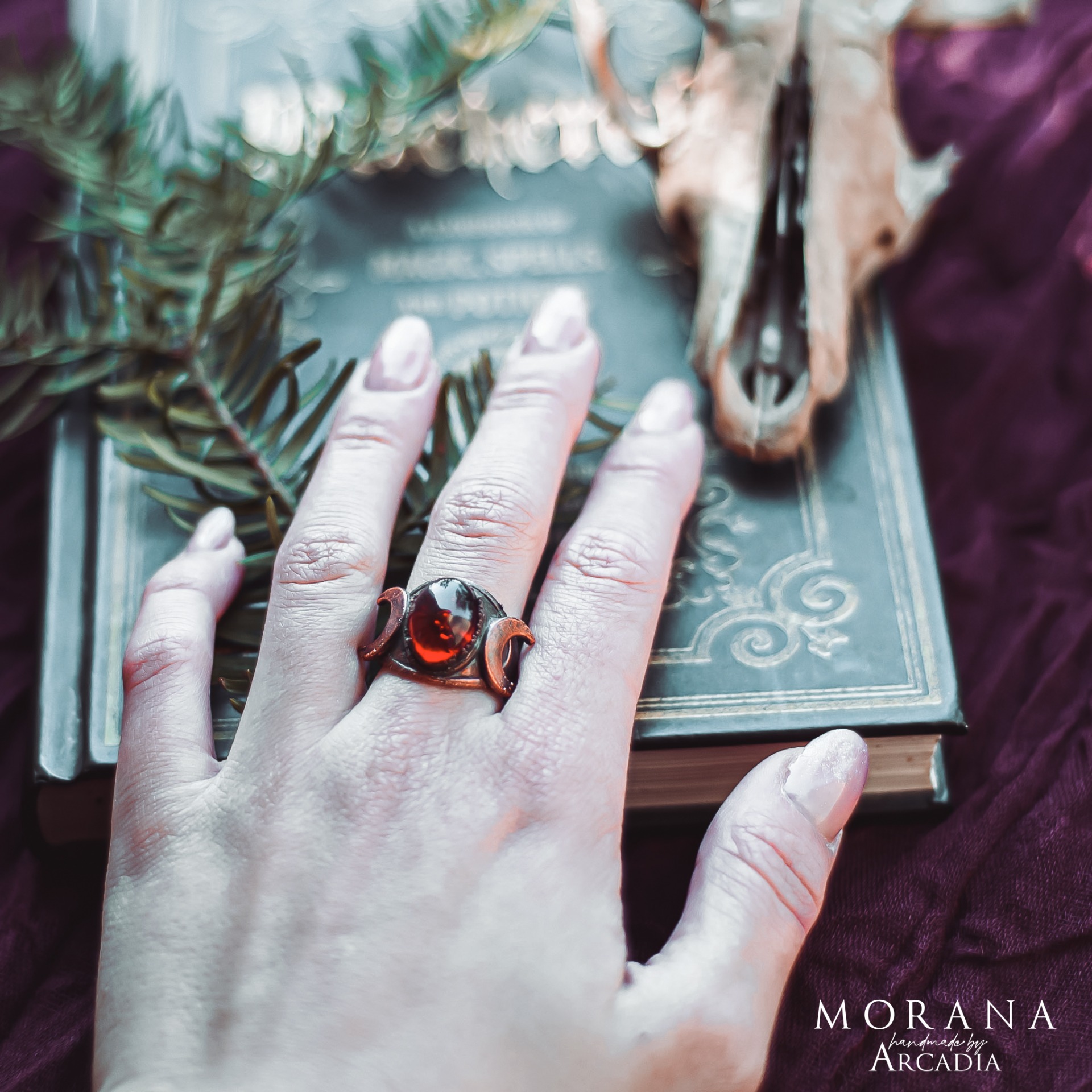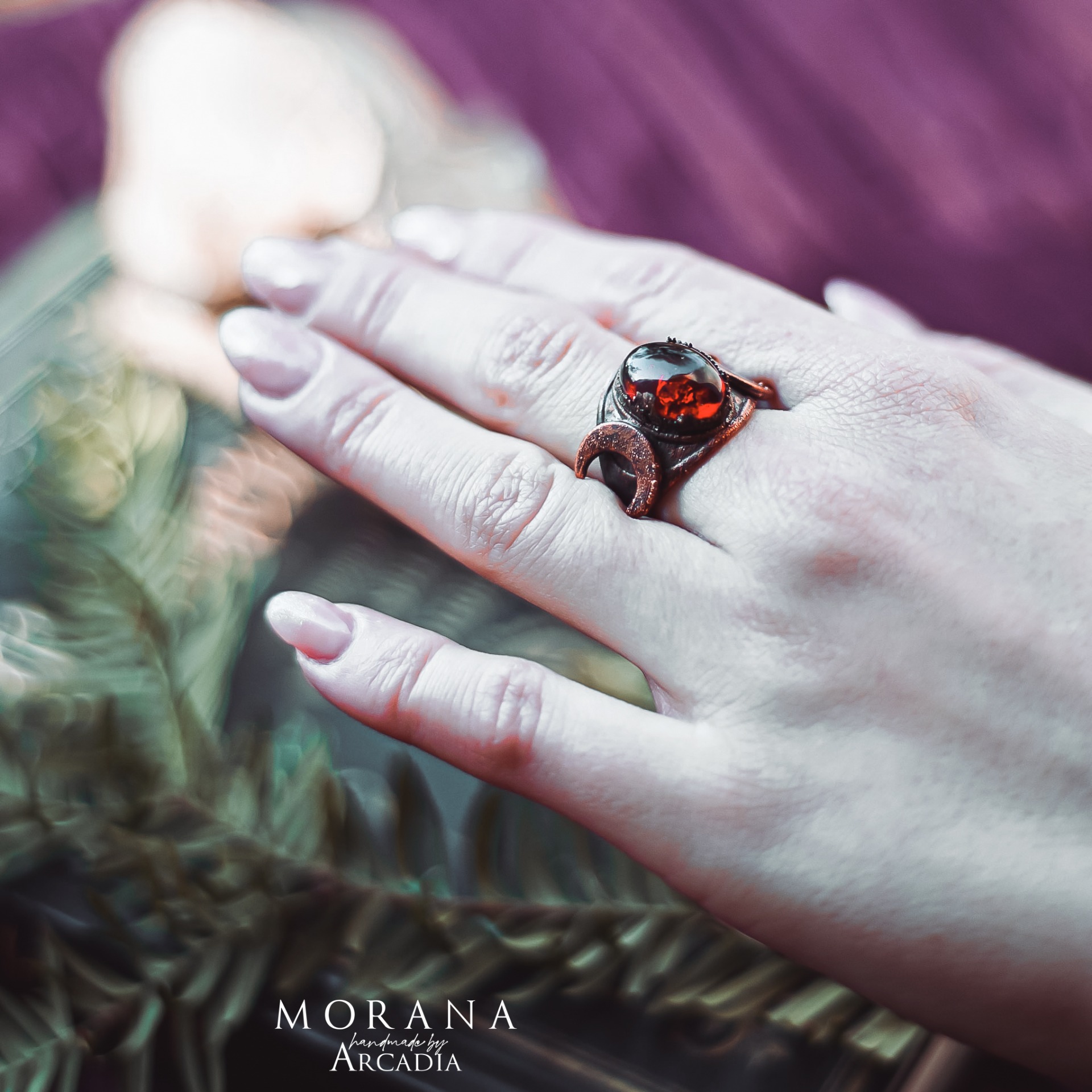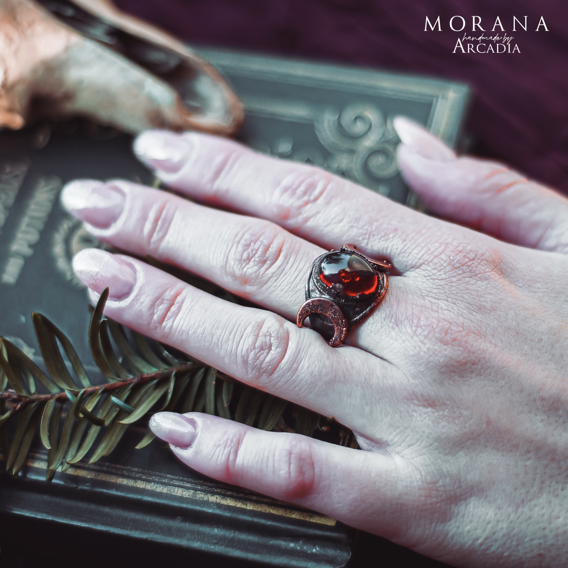 Mohutný prsten s krvavě rudým kabošonem z křišťálové pryskyřice ve vintage staroměděné patině. Vyrobeno rukama a srdcem v alchymistické dílně na severu Čech.