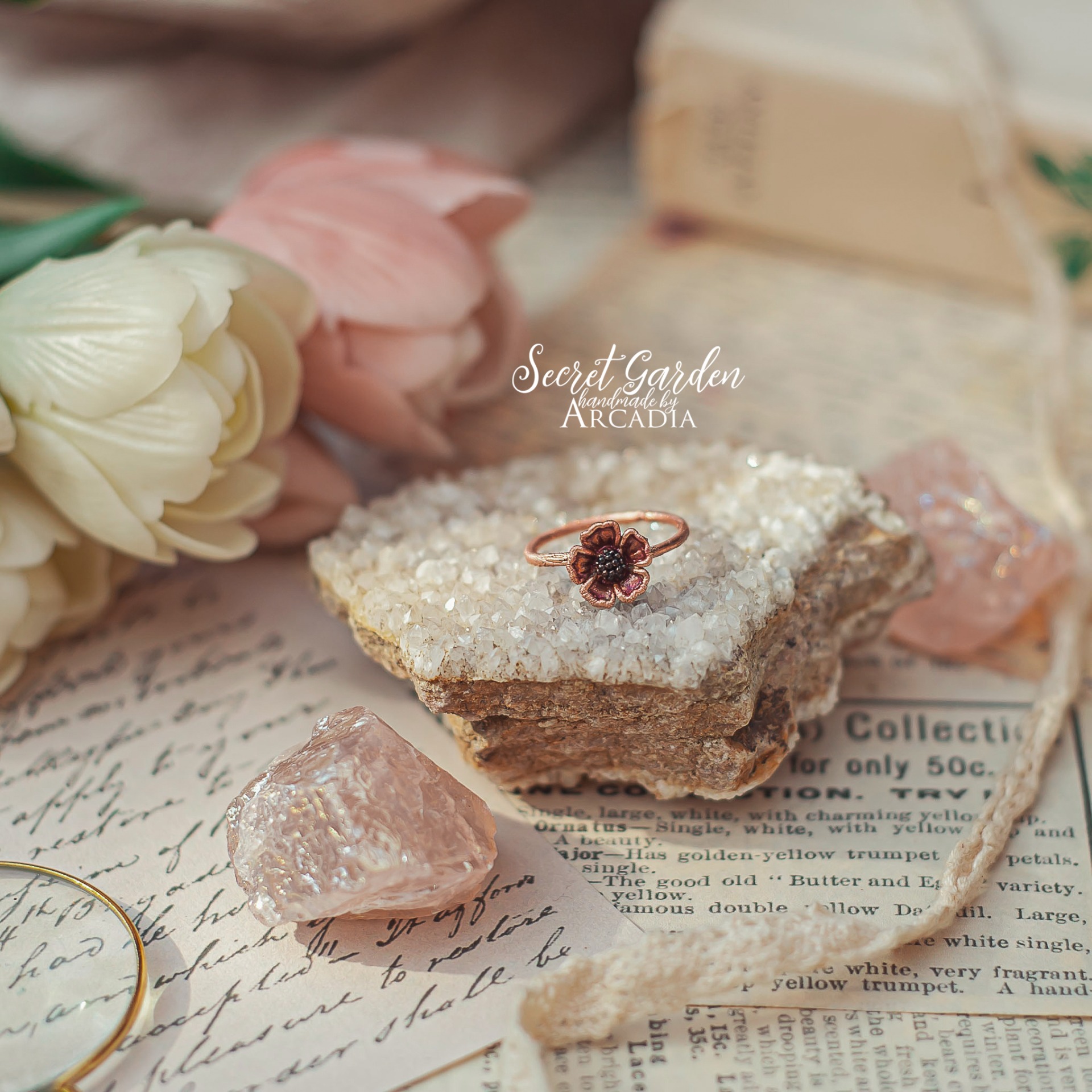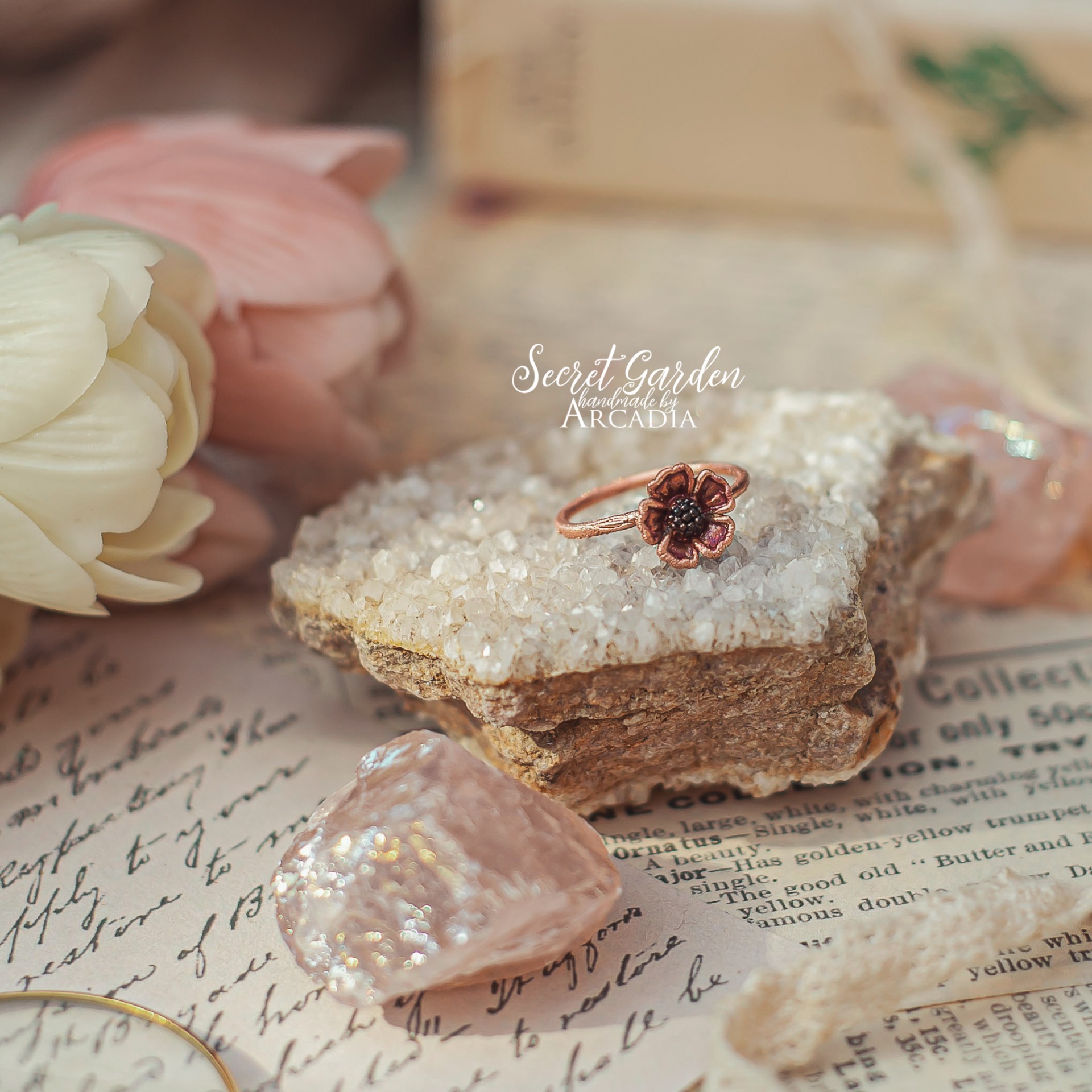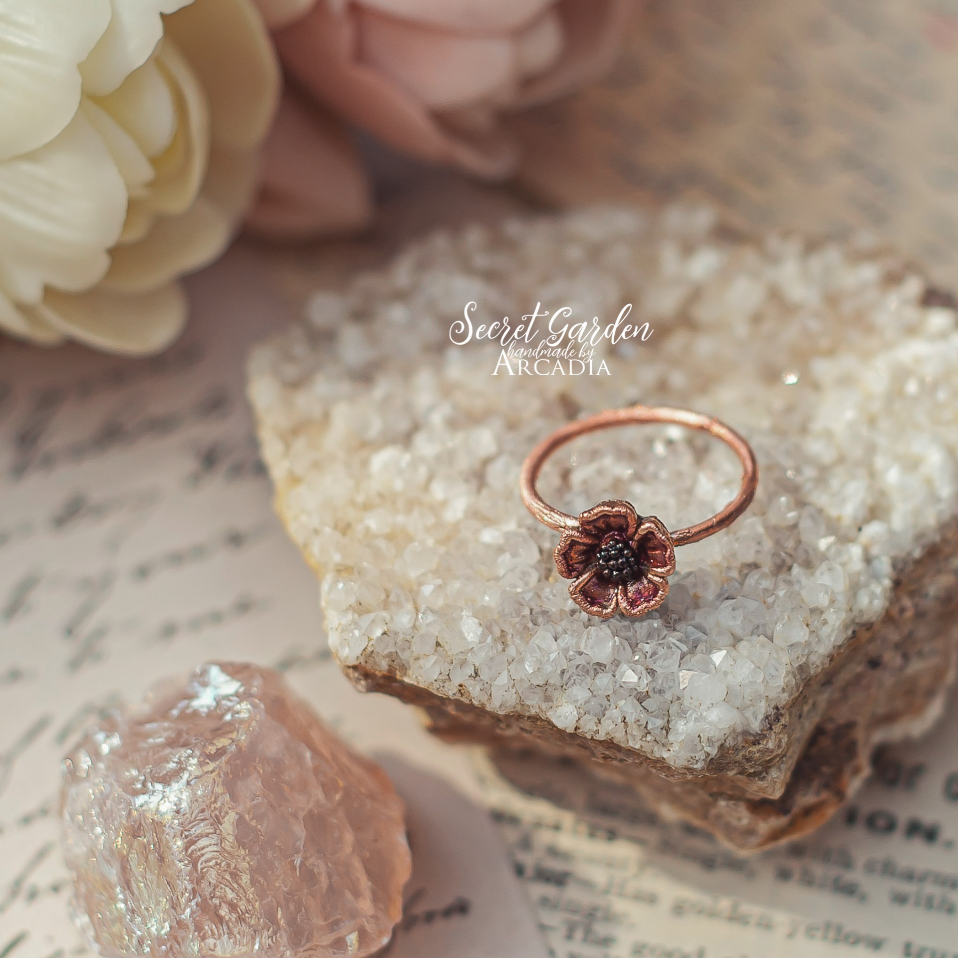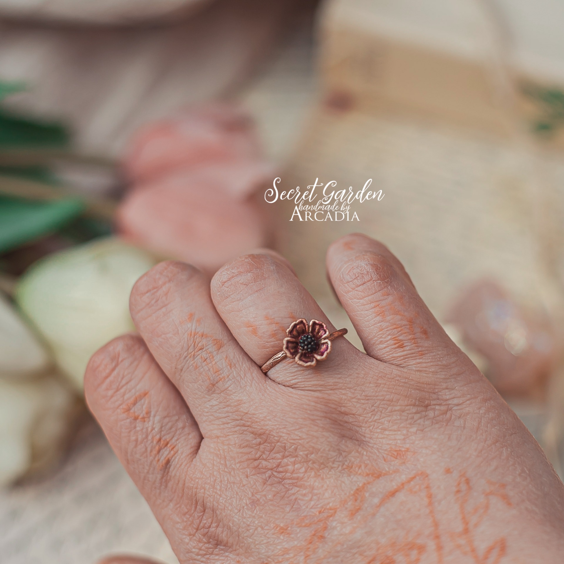 Měděný prsten s drobným kvítkem ve smaltovém vzhledu. Vyrobeno rukama a srdcem v alchymistické dílně na severu Čech.