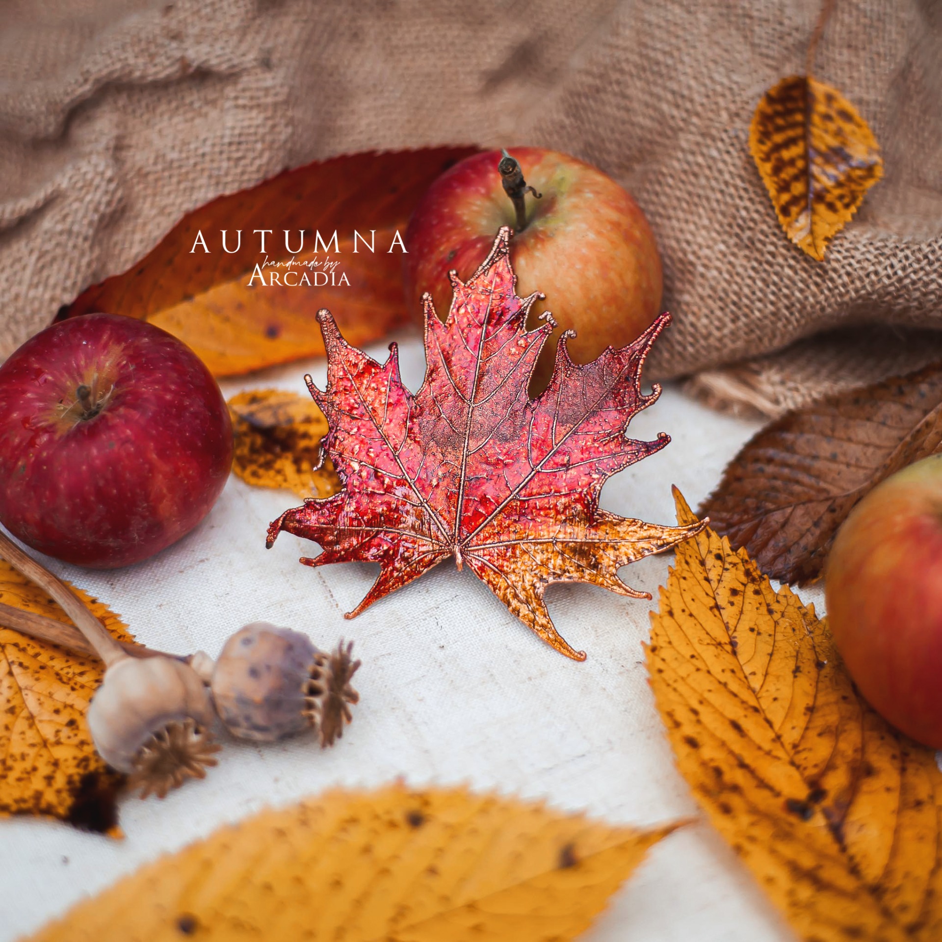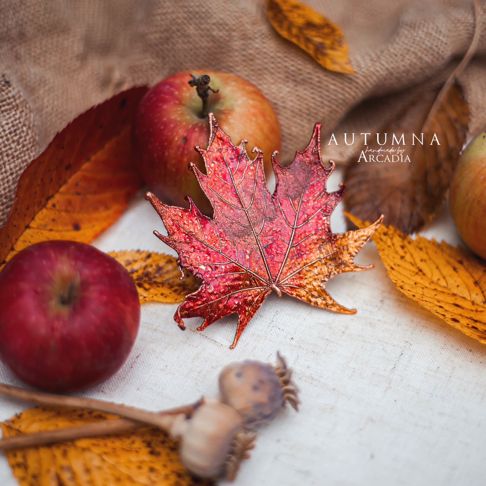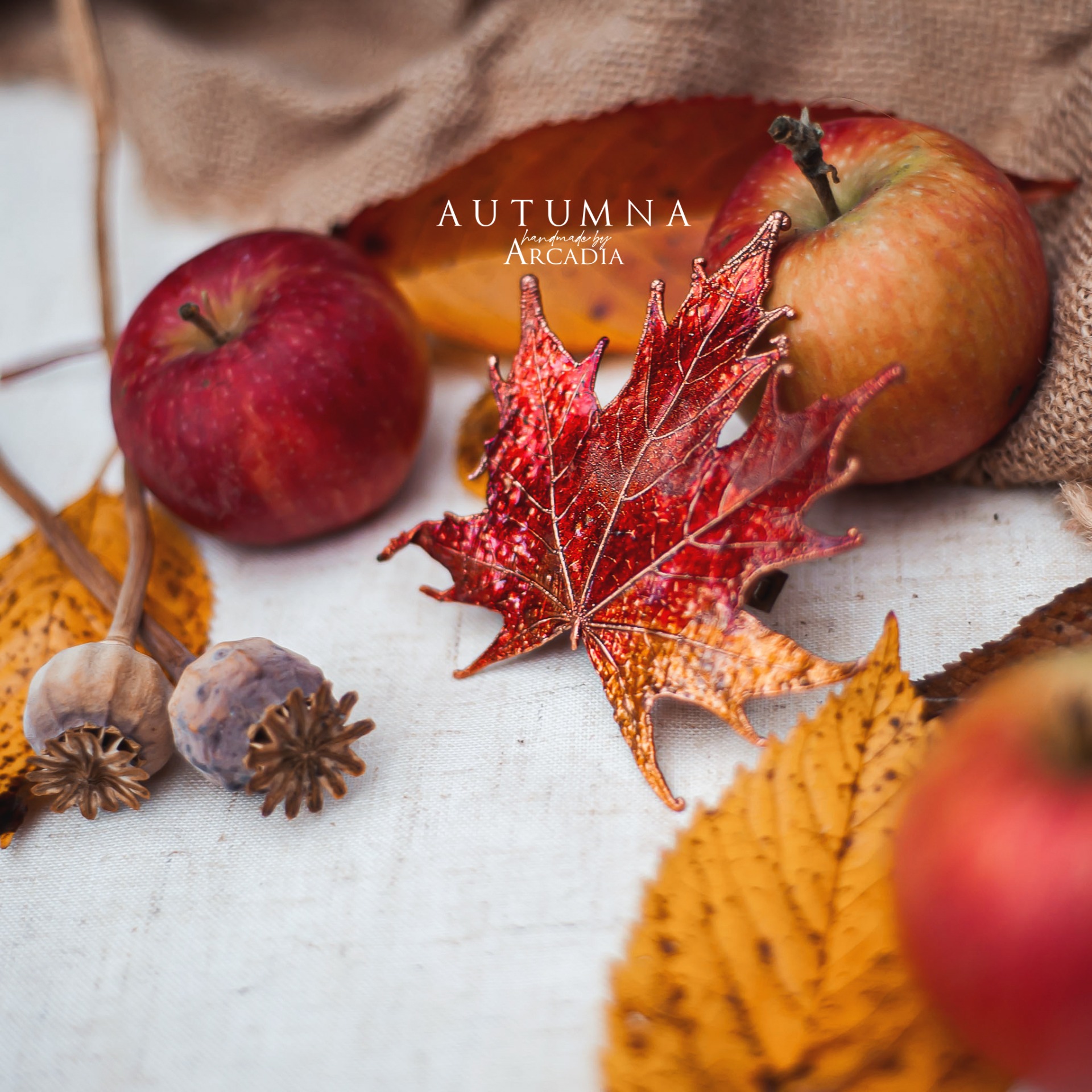 Spona do vlasů ze skutečného pokoveného lístku javoru v podzimních odstínech červené a zlatavé. Vyrobeno rukama a srdcem v alchymistické dílně na severu Čech.