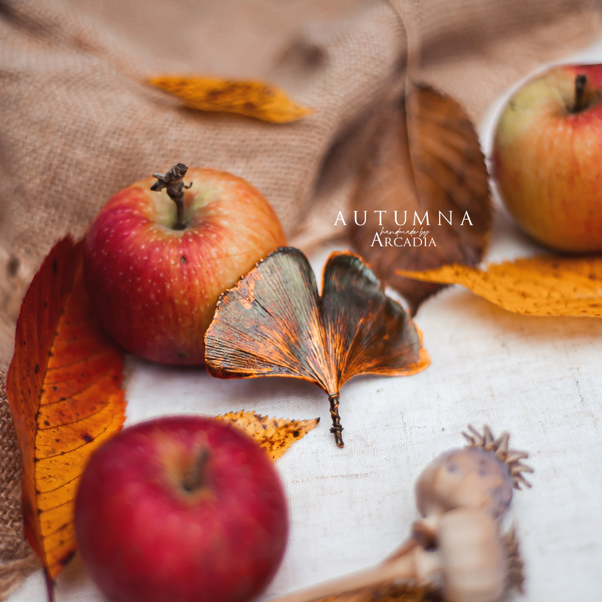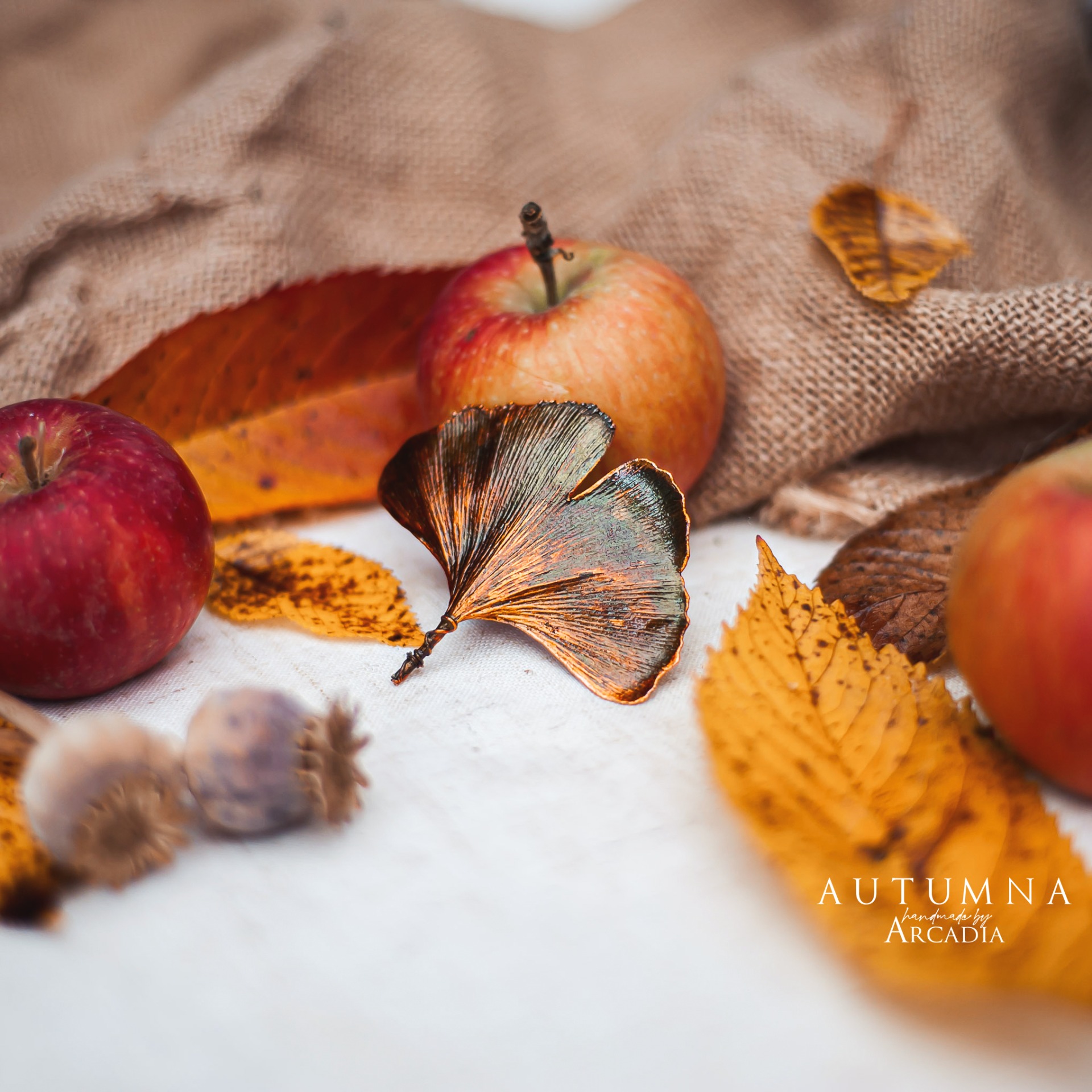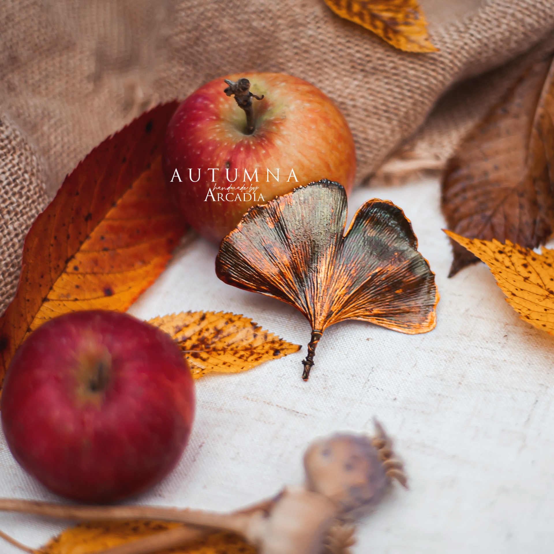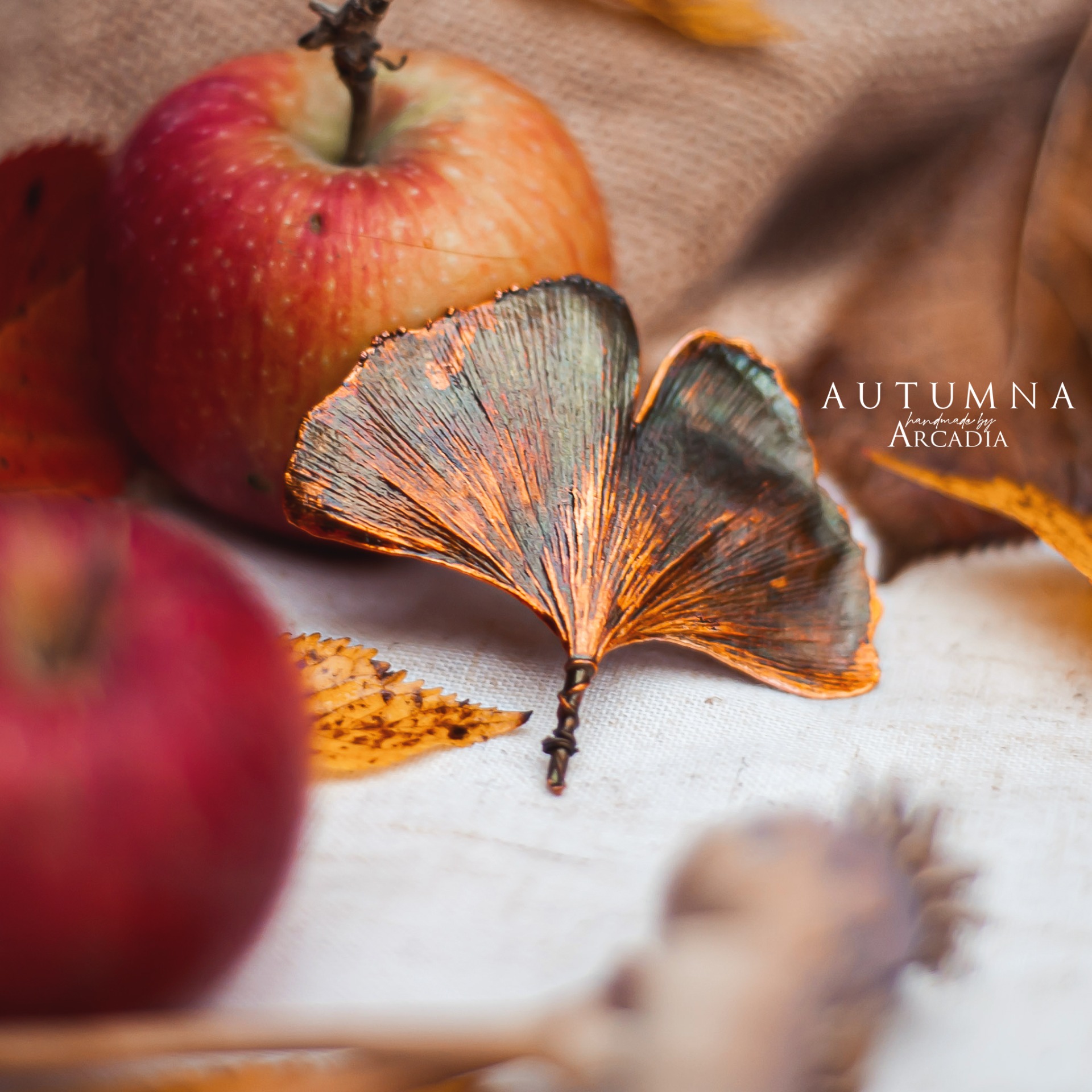 Spona do vlasů ze skutečného pokoveného lístku ginka ve zlatozelenkavých tónech. Vyrobeno rukama a srdcem v alchymistické dílně na severu Čech.